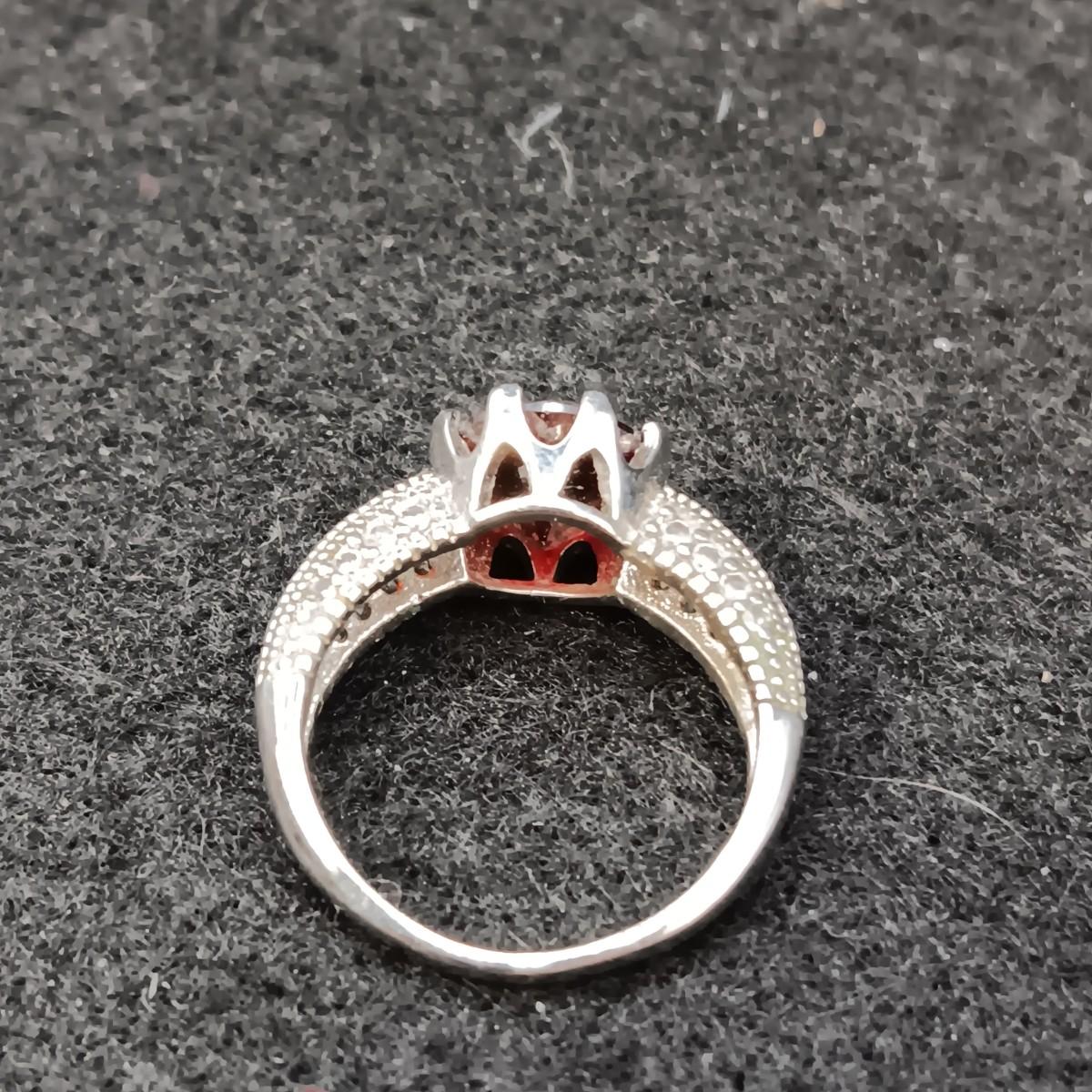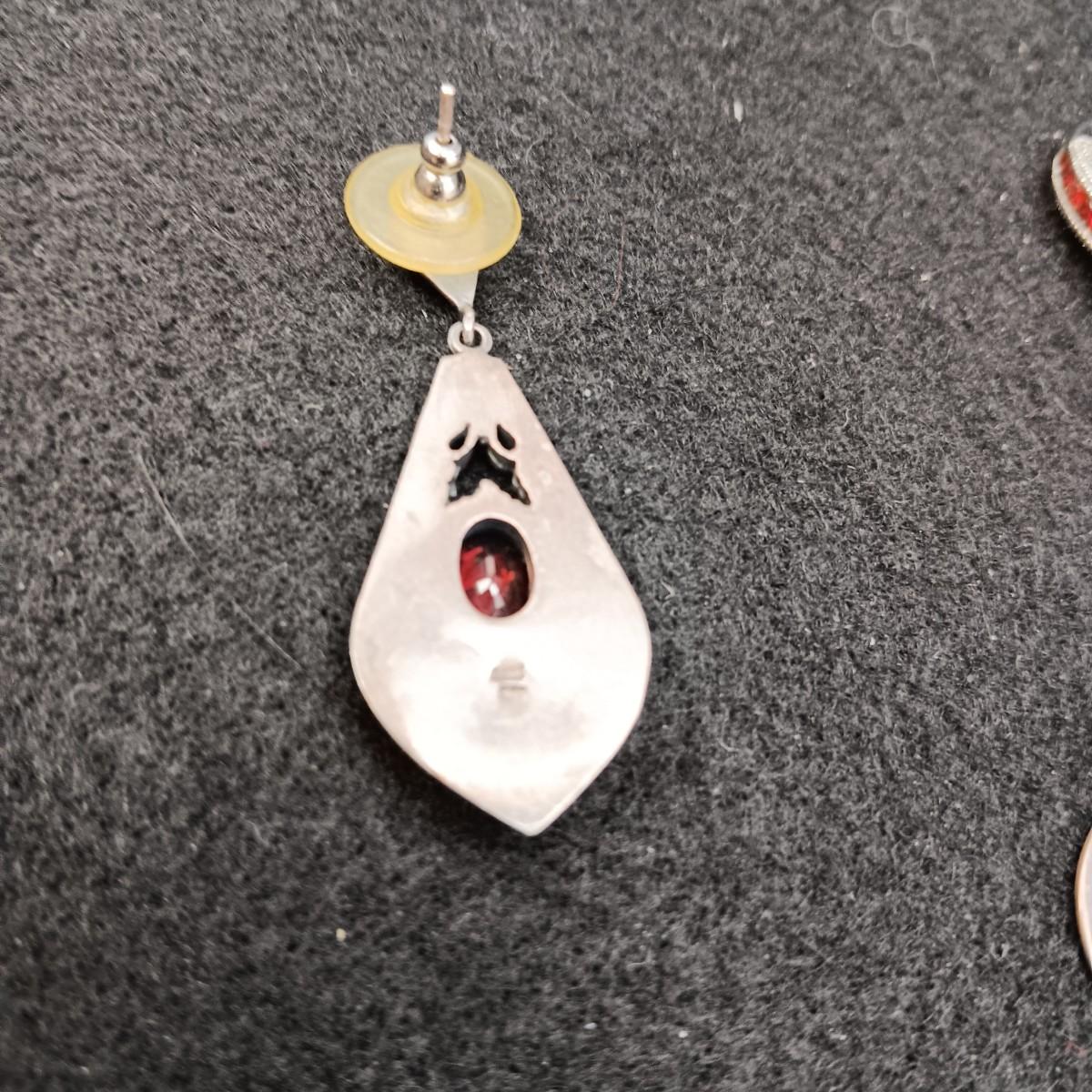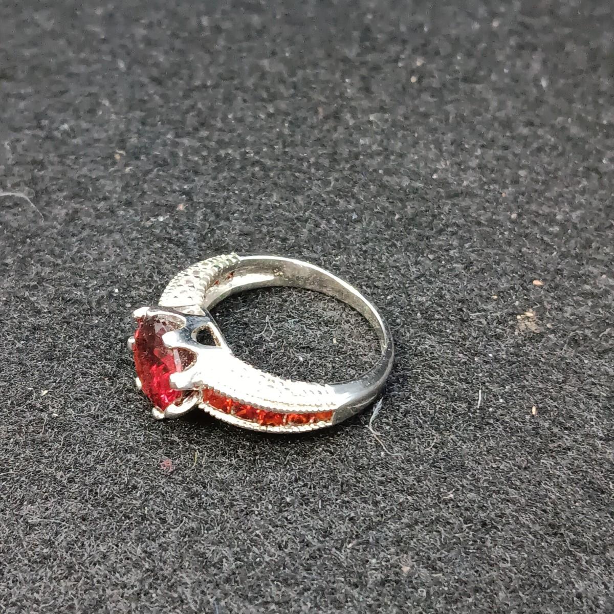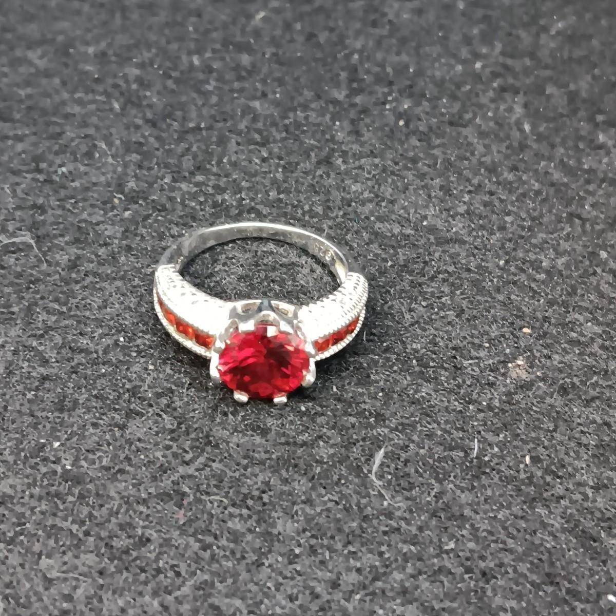 STERLING EARRINGS AND RING (SIZE 6 1/2) WITH RED STONES