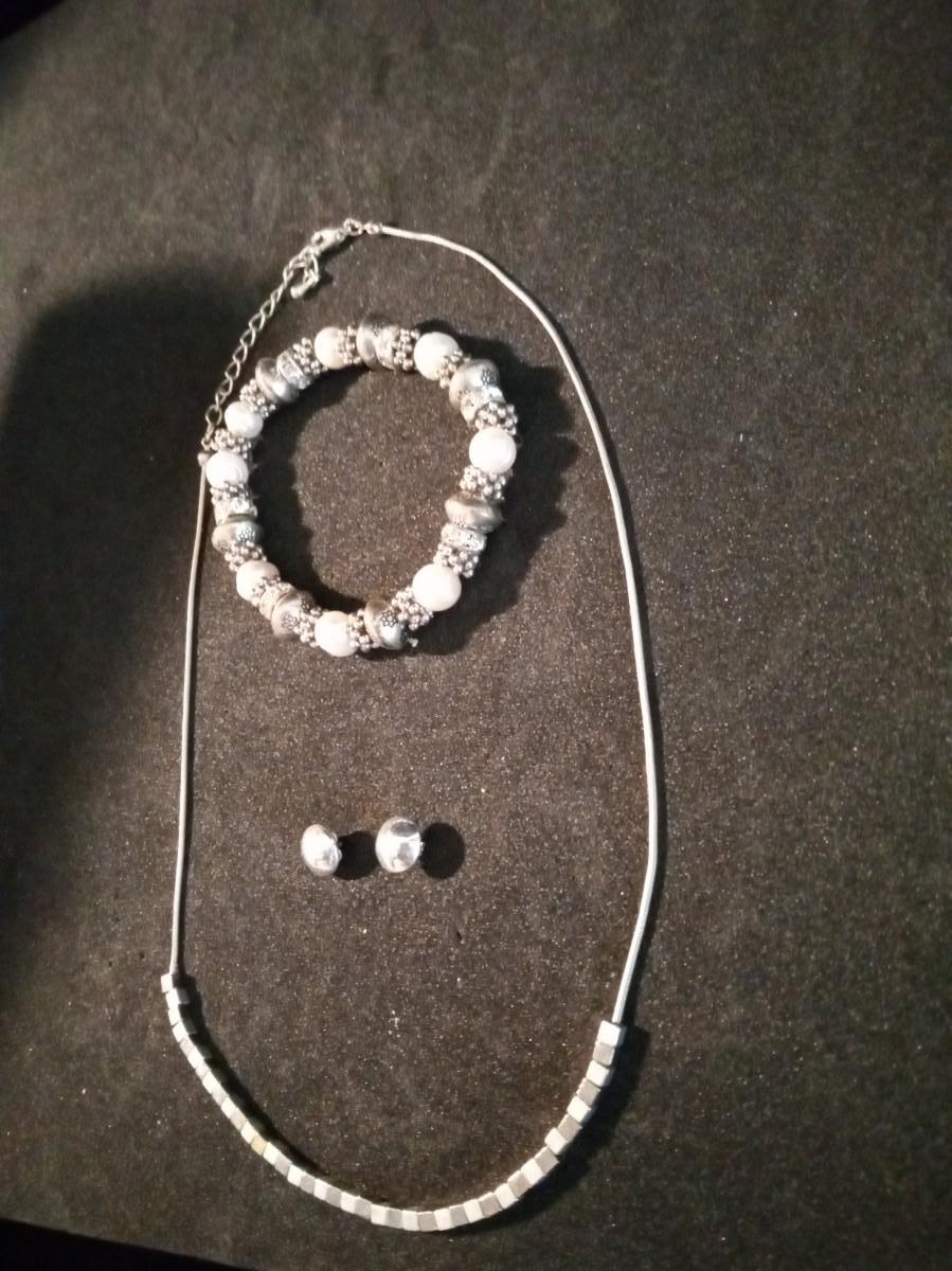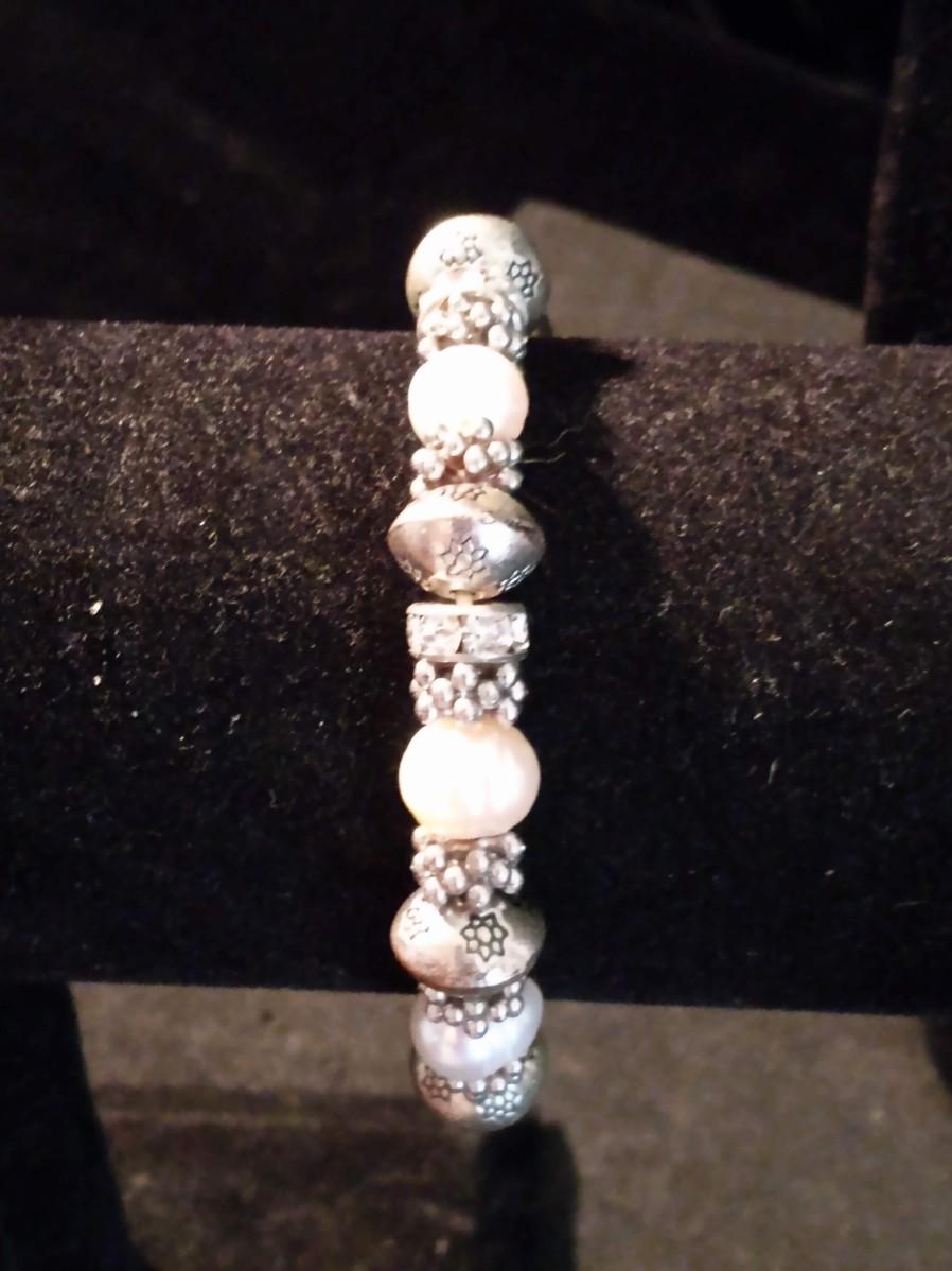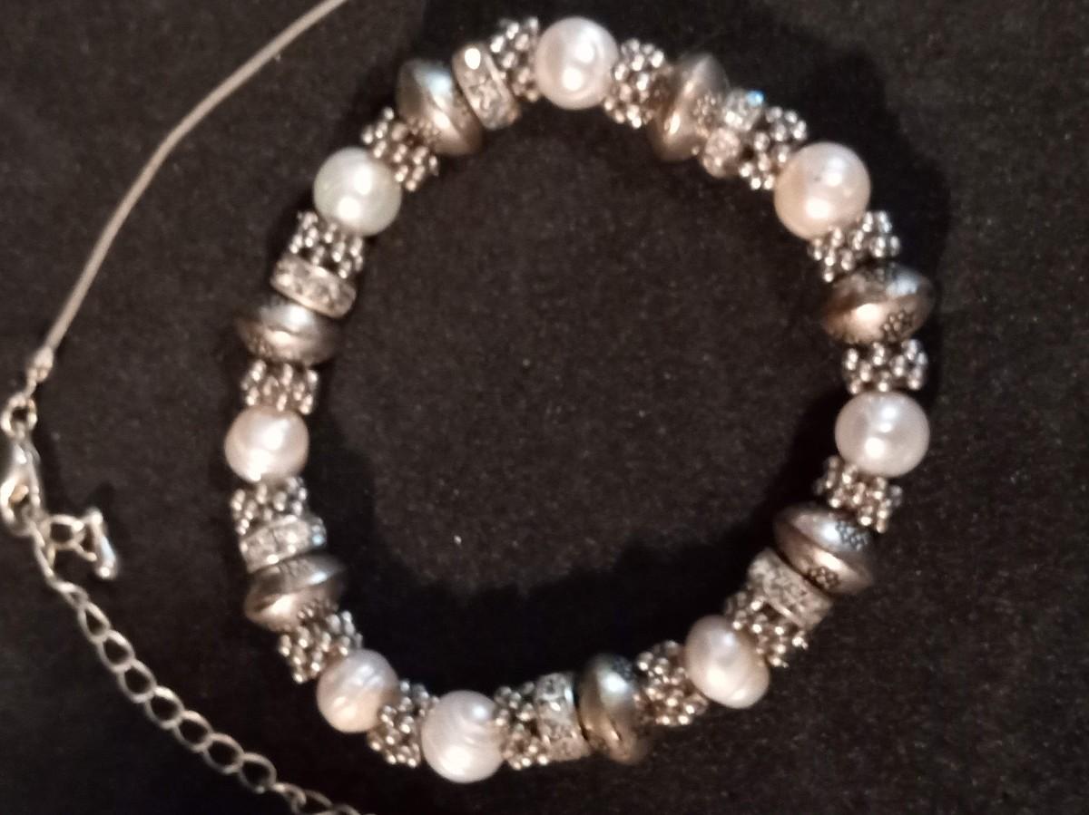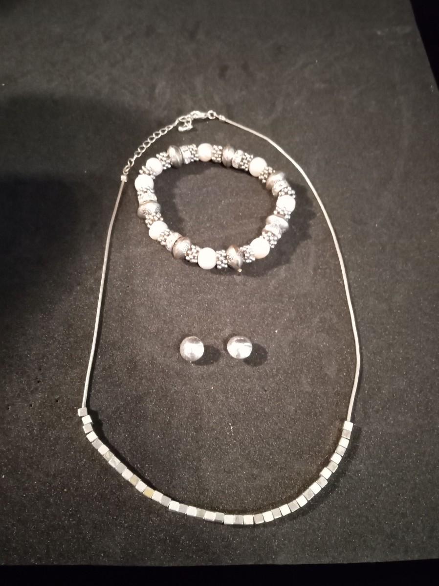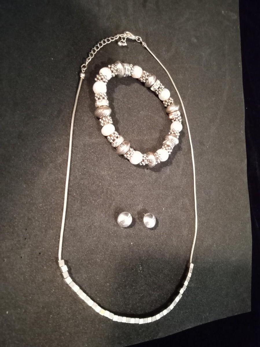 STERLING EARRINGS, BEADED PEARL BRACELET AND SILVER TONE NECKLACE