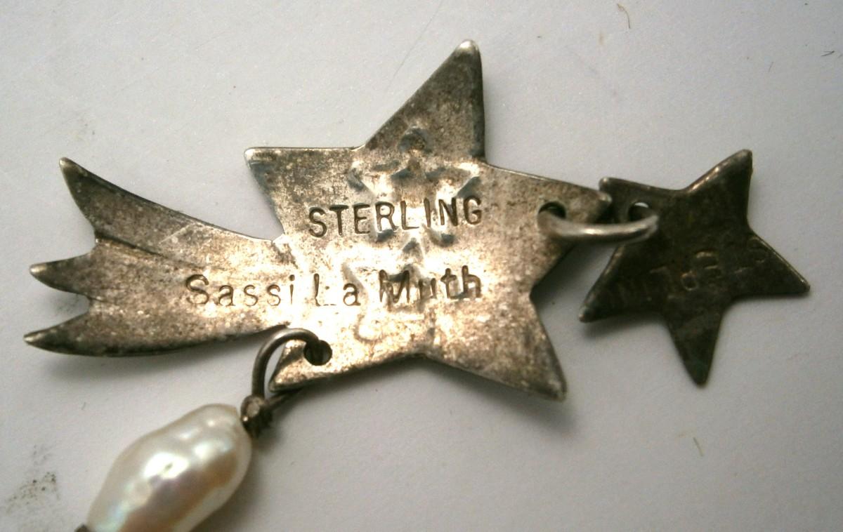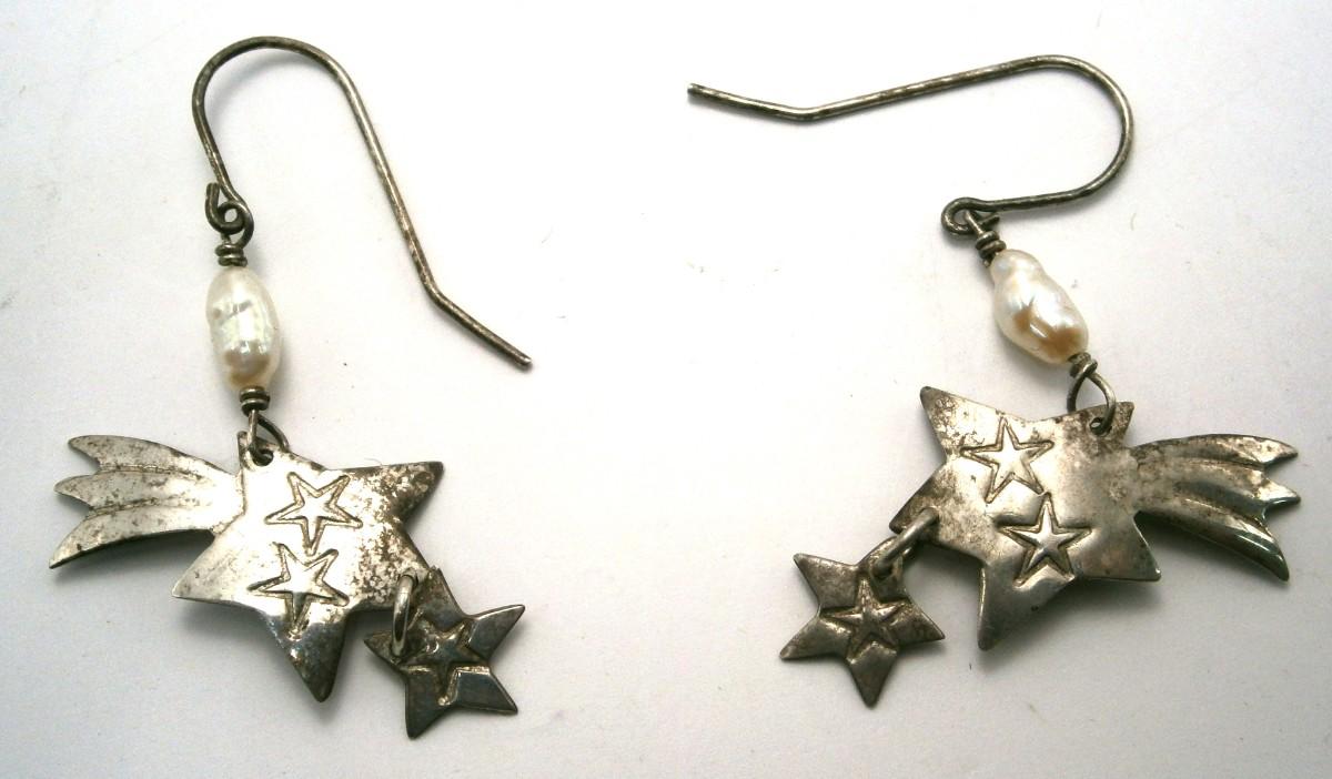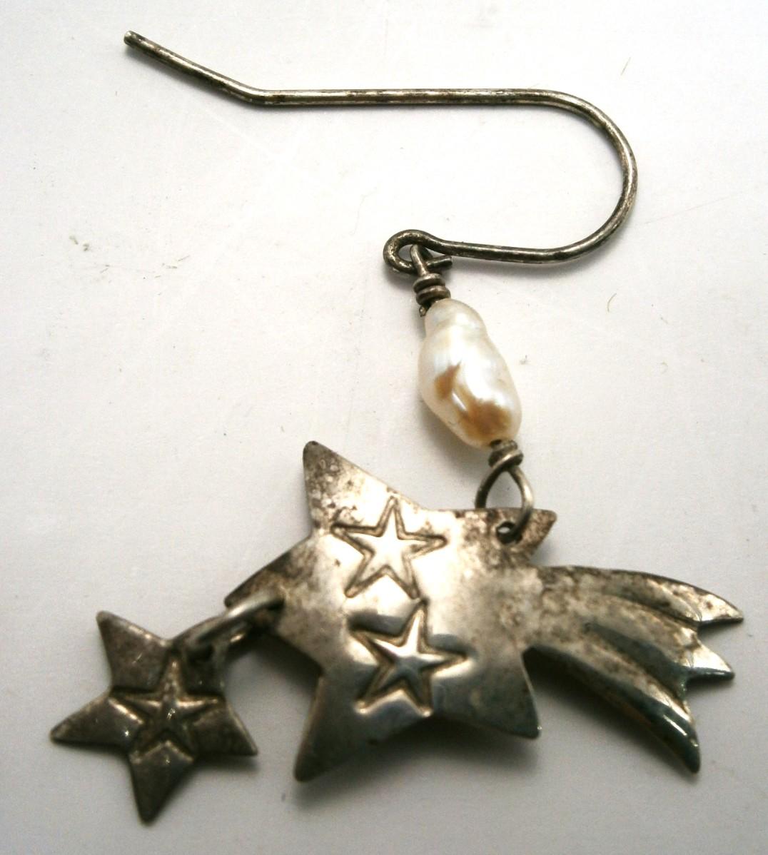 Southwestern Sterling Earrings with Comet and Star Motif signed Sassi La Muth, sterling silver with fresh water pearl, 1 1/4 in. long (excluding hook).