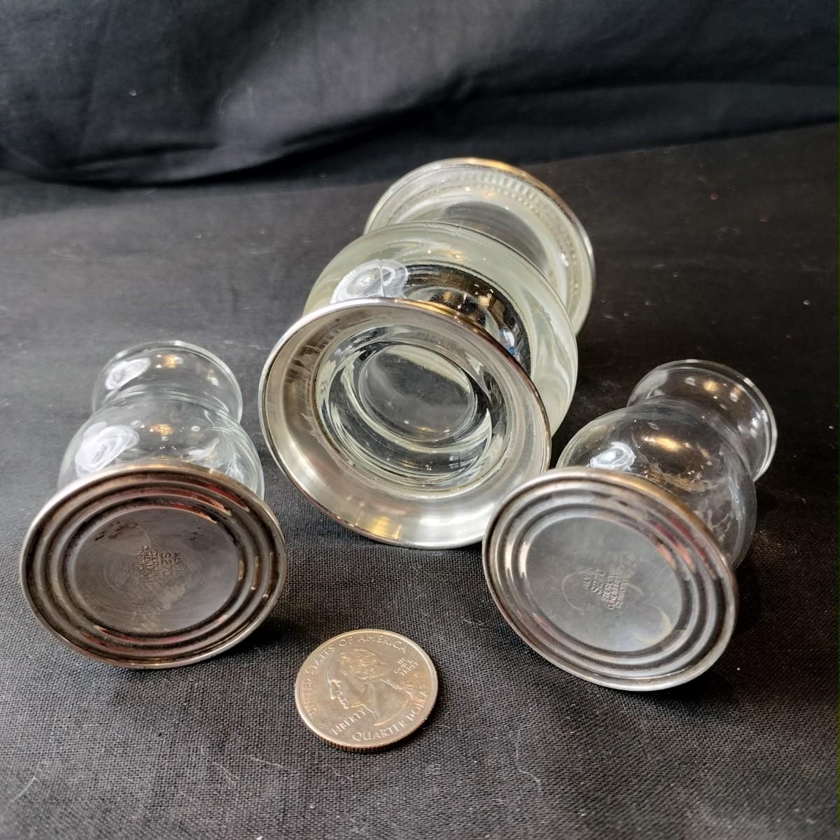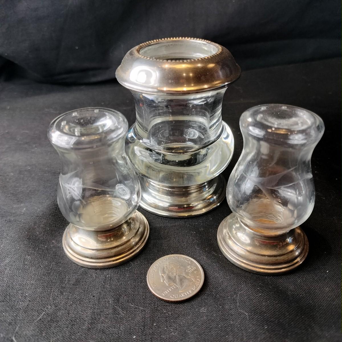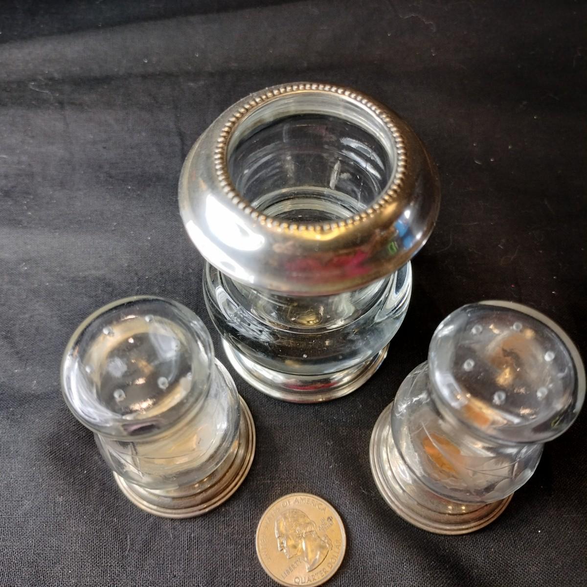 This auction lot is for a Sterling Silver & Etched Glass Table Service. This is a set of Sterling Bottom Etched Glass Salt and Pepper with a Sterling Rim and Bottom Glass Toothpick Holder. The bases are not weighted and all are marked sterling. These items are in very good condition and are quite beautiful.