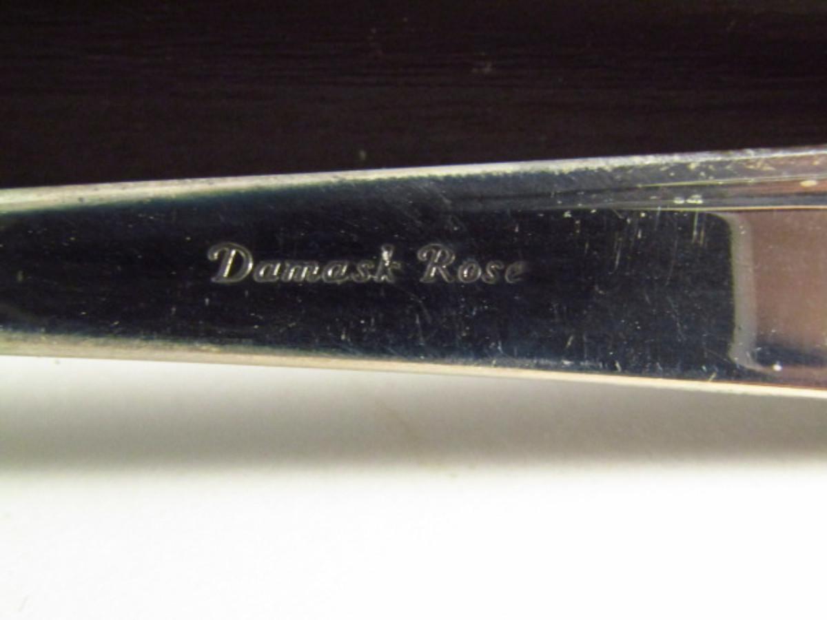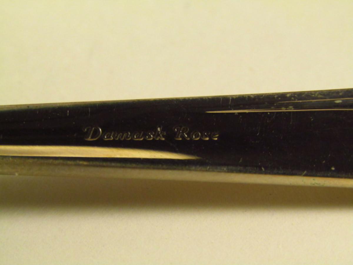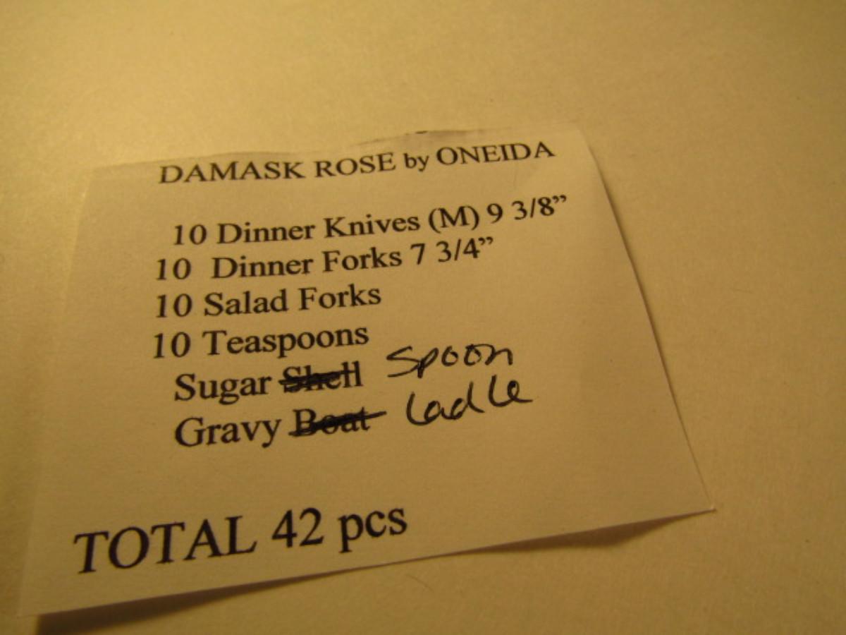 Sterling Flatware Damask Rose Pattern by Oneida- 42 Pieces with Approx Weight of 1352 Grams. 10 of each: knife, dinner fork, salad fork, teaspoon. Plus one sugar spoon and one gravy ladle. Dinner knives not included in weight.