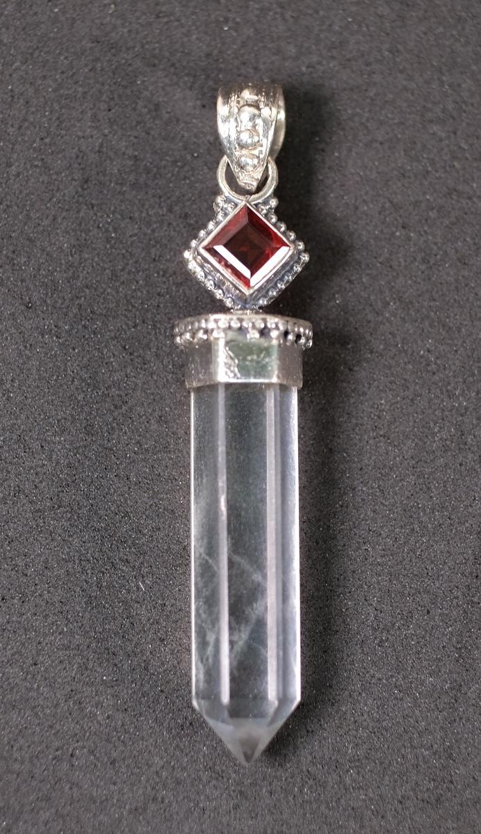 Sterling Garnet & Quartz Point Pendant. Stamped 925. Measures approx. 2". Weighs approx. 6.3 grams.