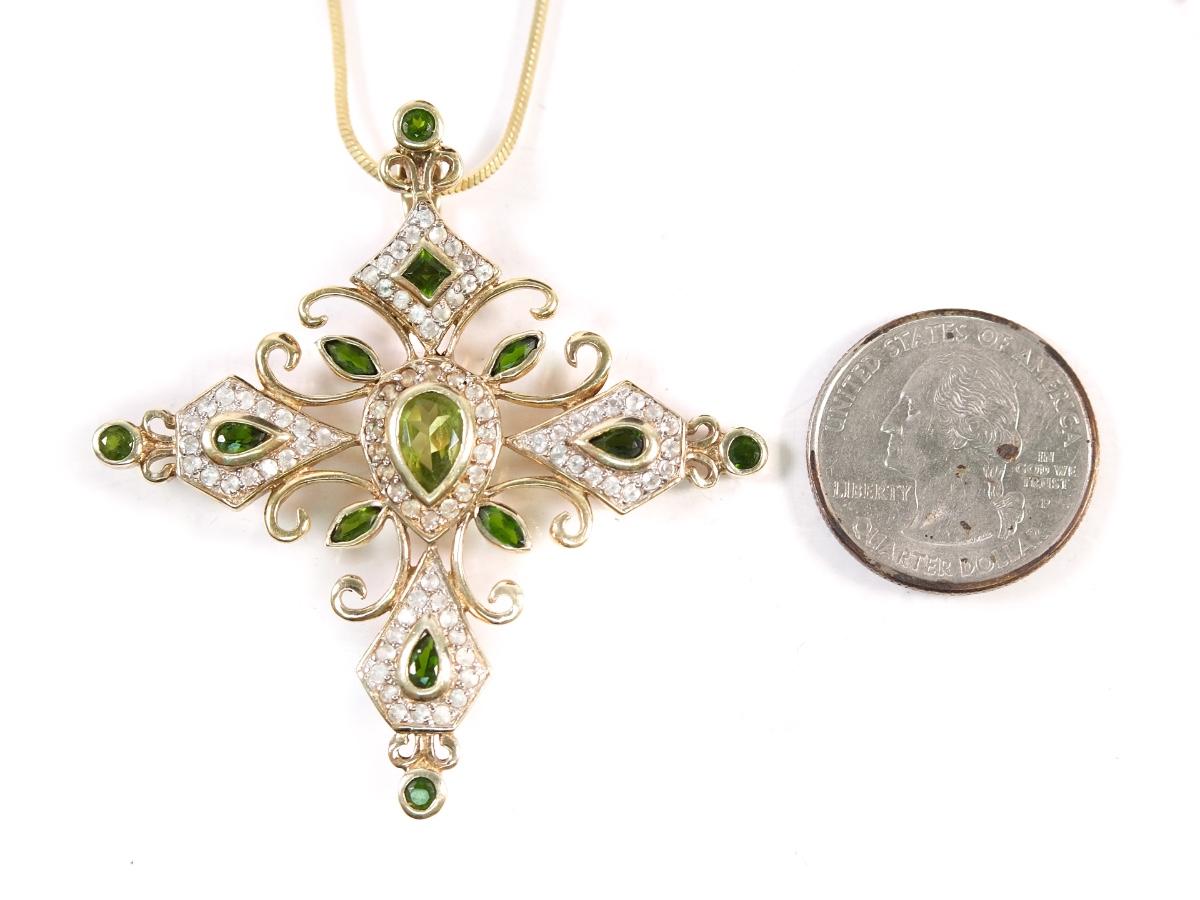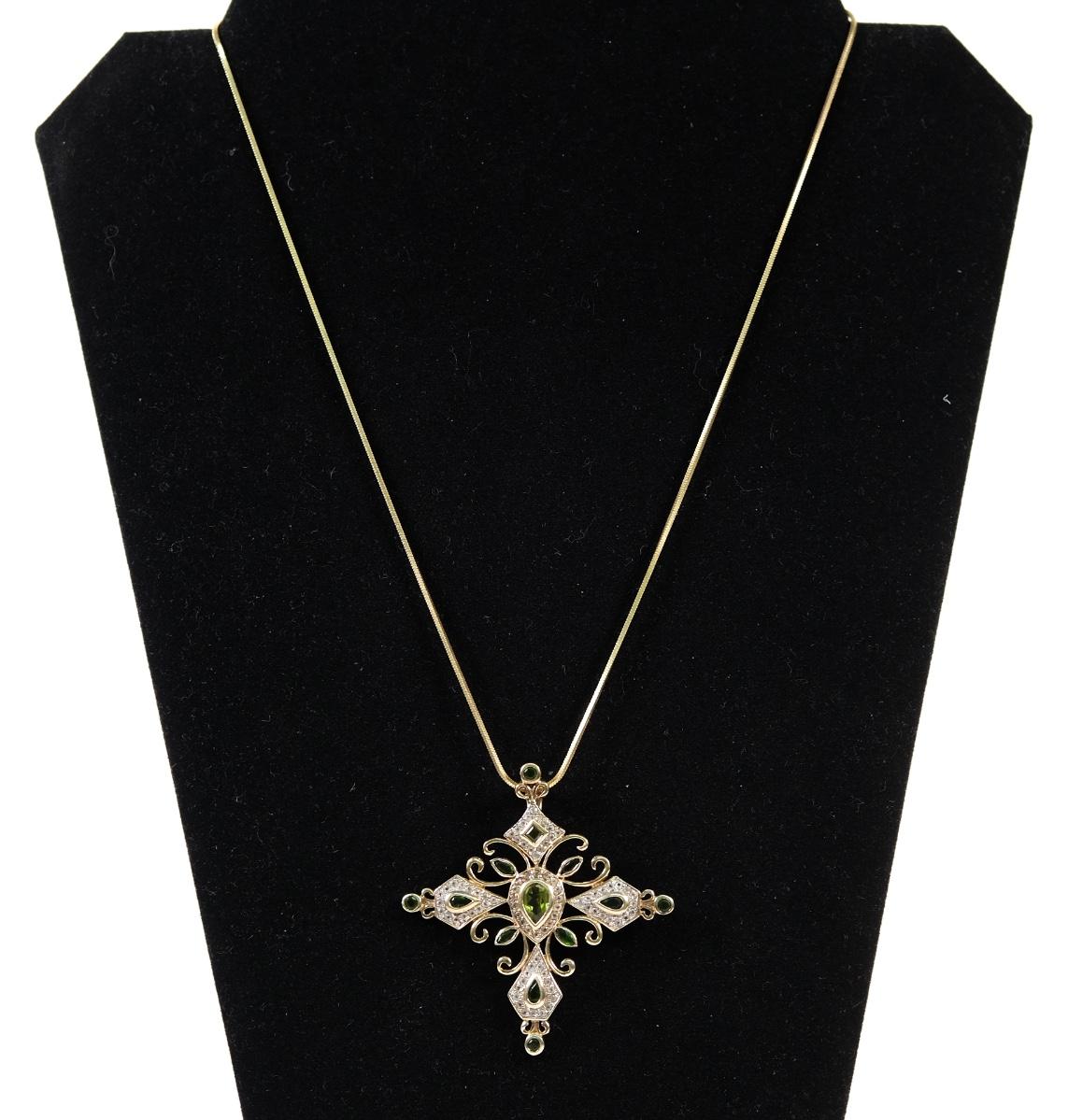Sterling gold tone gemstone cross pendant on a box chain necklace. Chain stamped 925 DANEGRAFT, pendant 925 THAILAND. Testing as emerald and white topaz. Chain measures approx. 20", pendant 2.25". Overall weight 16.7 grams.