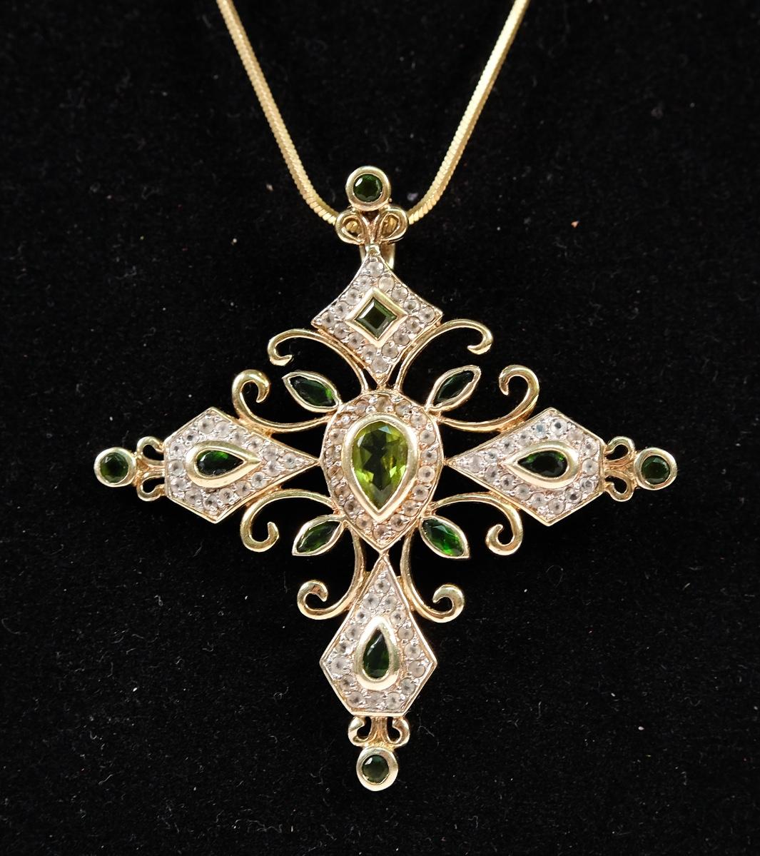 Sterling gold tone gemstone cross pendant on a box chain necklace. Chain stamped 925 DANEGRAFT, pendant 925 THAILAND. Testing as emerald and white topaz. Chain measures approx. 20", pendant 2.25". Overall weight 16.7 grams.