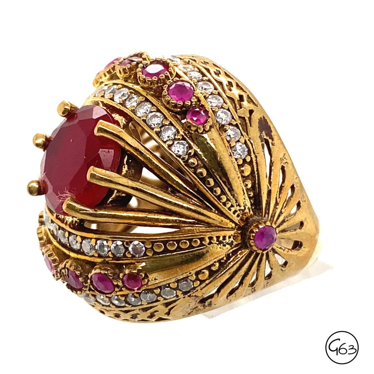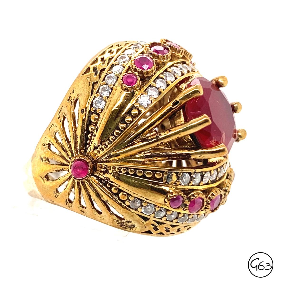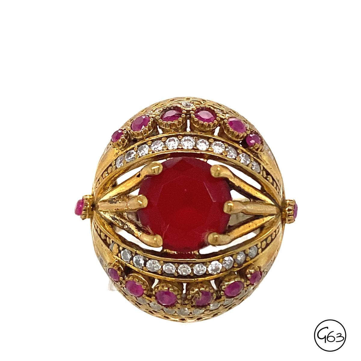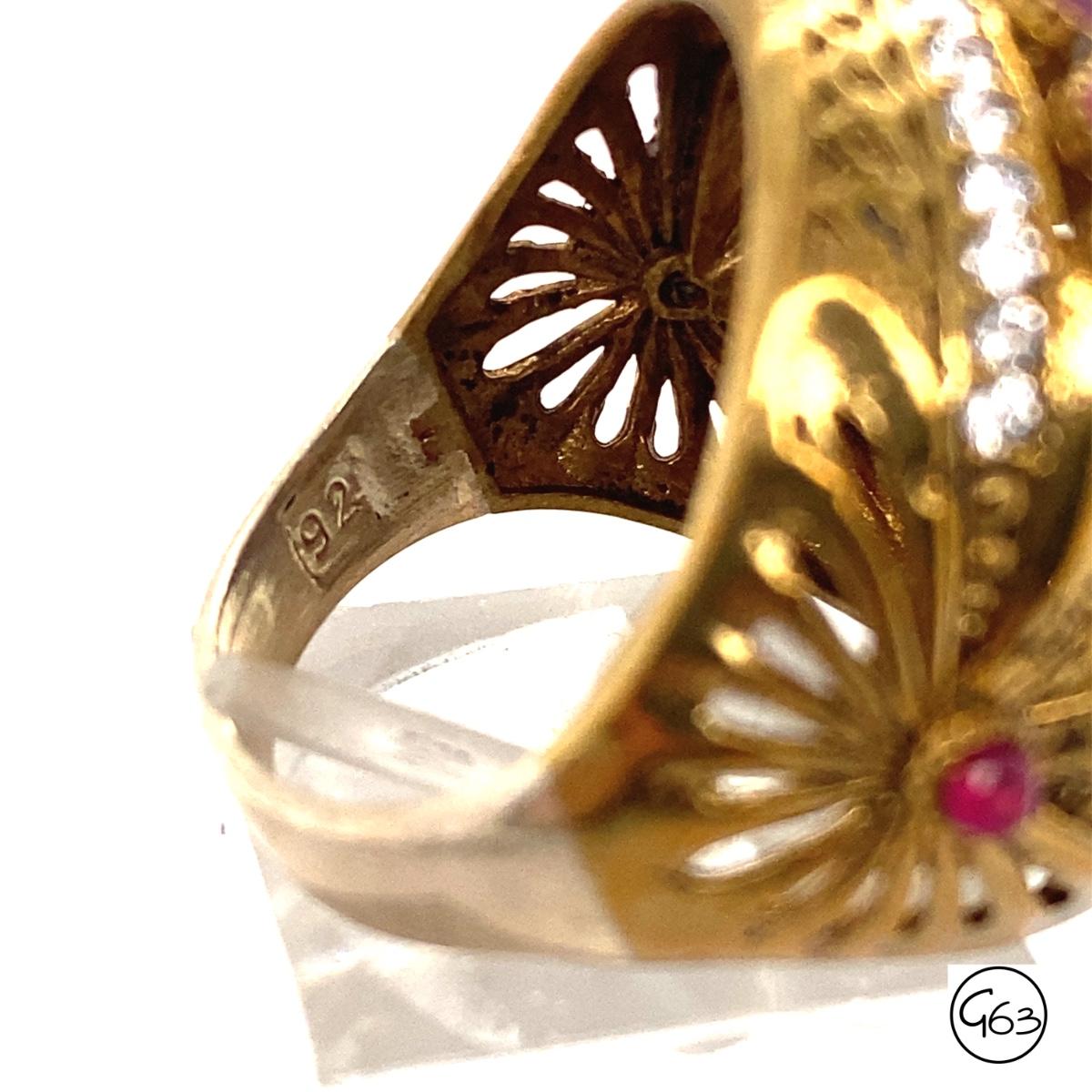 Middle stone testing as glass, other stones rubies. Stamped 925. Size 7.5 Weighs approx. 9.4 grams.