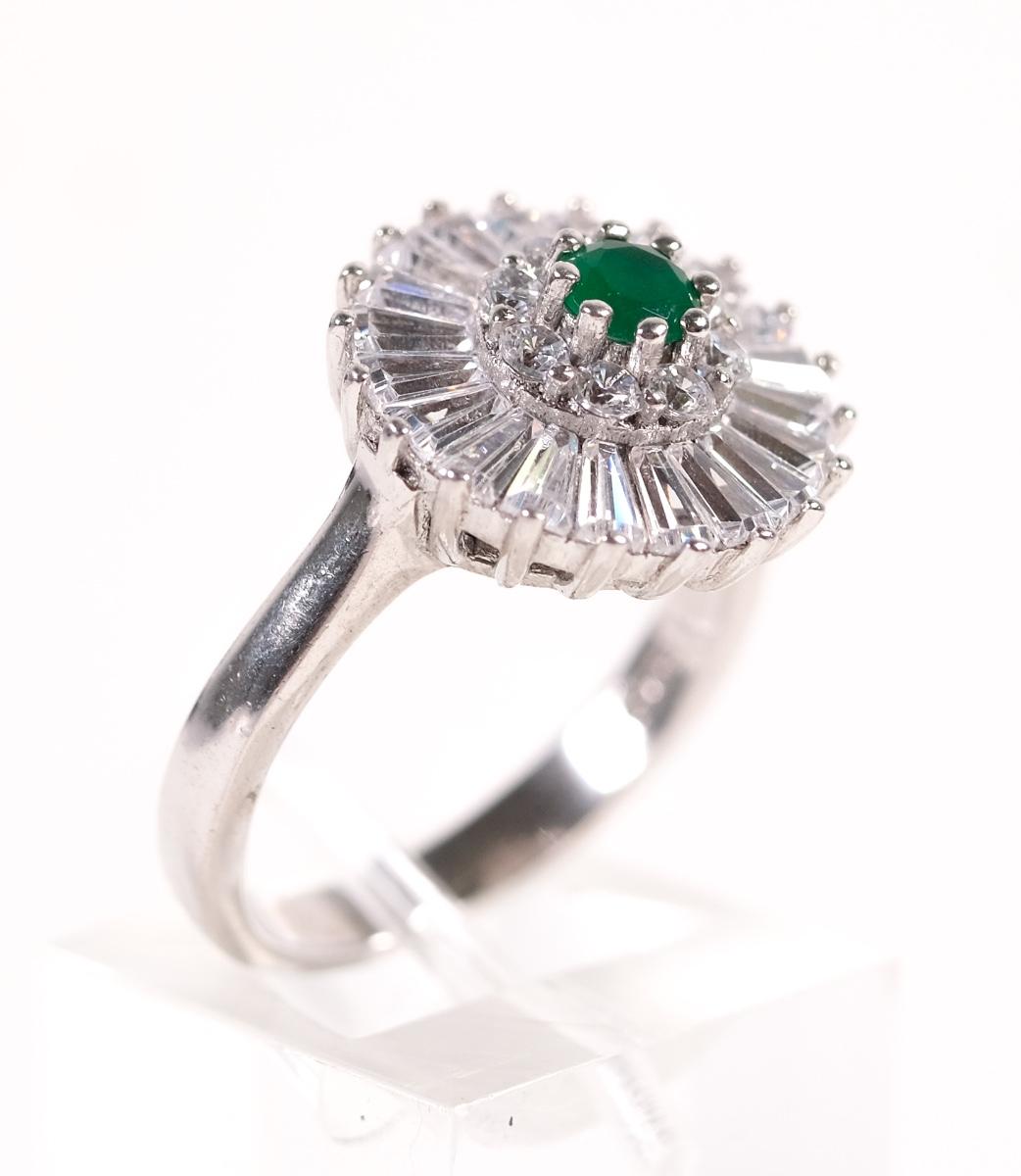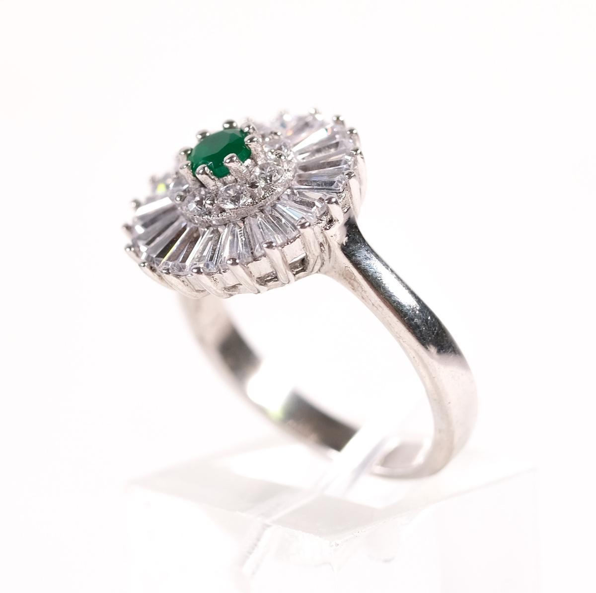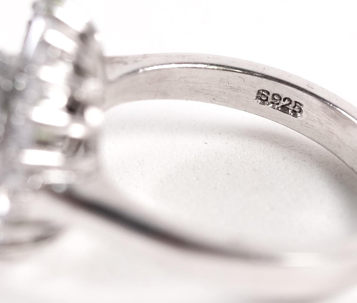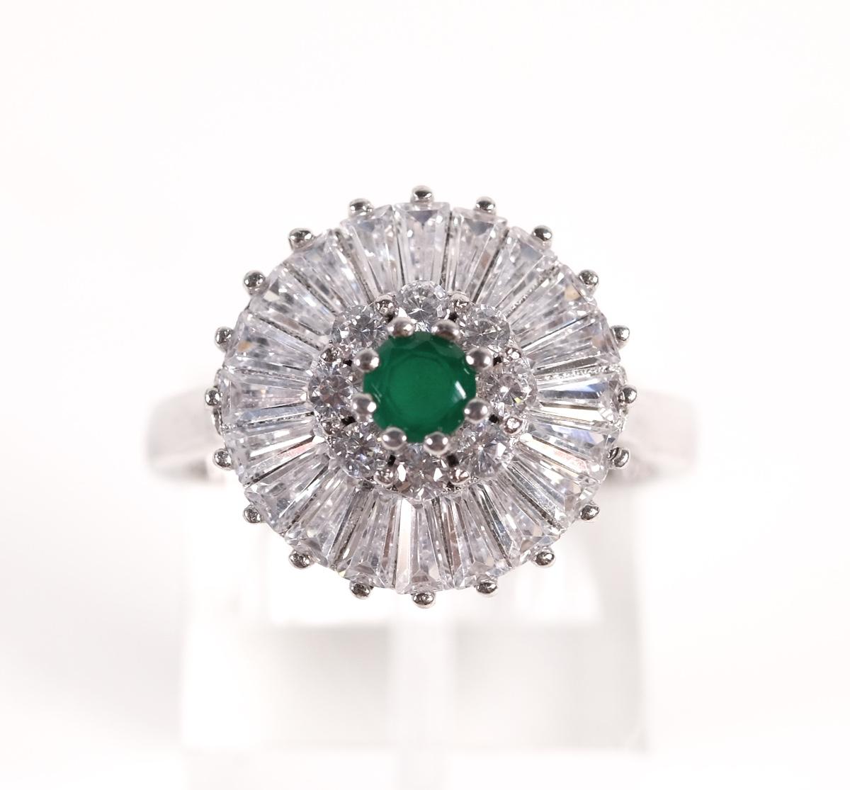Sterling Green Gemstone Ring. Size 7.5. Clear stones testing as glass, Green unsure. Stamped 925. Weighs approx. 5.4 grams.
