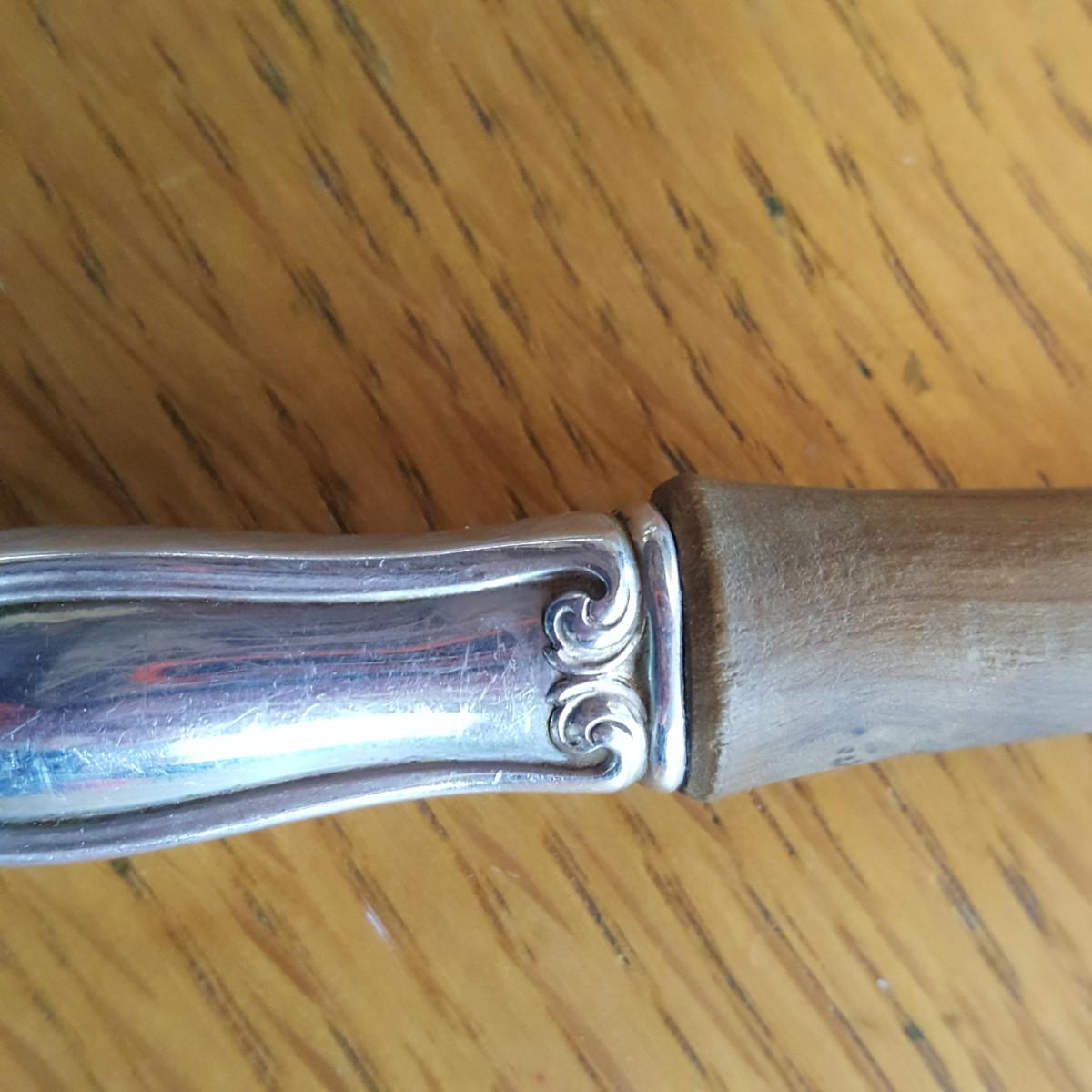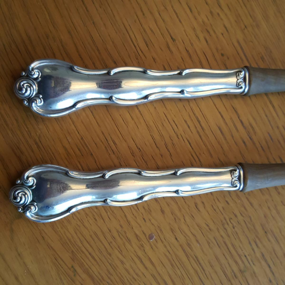 This auction lot is for a Sterling (?) Handled Salad Serving Fork and Spoon Set. The handles on this set are not marked but we feel quite certain they are sterling based on their weight, look and our years of experience - but you be the judge. Comes with the silver anti-tarnish bag in which we found them at the estate.