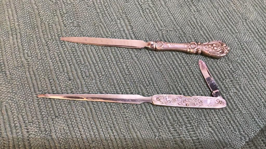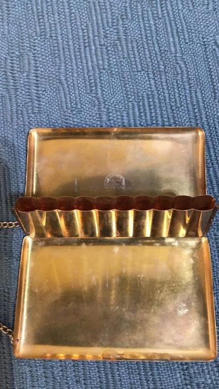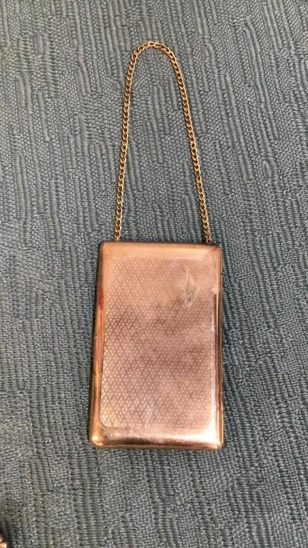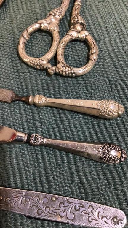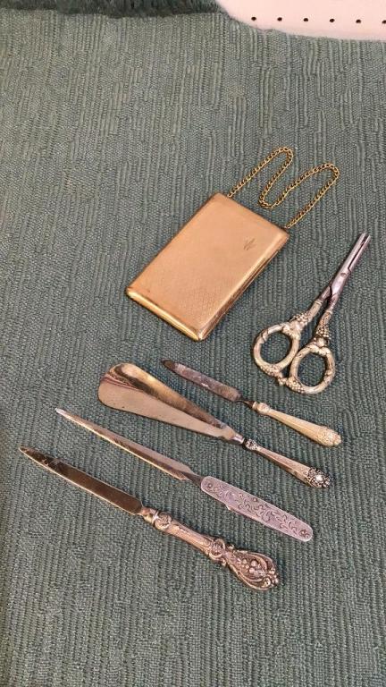 Shoe horn and nail file with NLK monogram, 2 letter openers - 1 with knife, scissors with grape vine handle, all handles marked sterling..rose gold tone cigarette case on chain, reverse side with W monogram, Interior