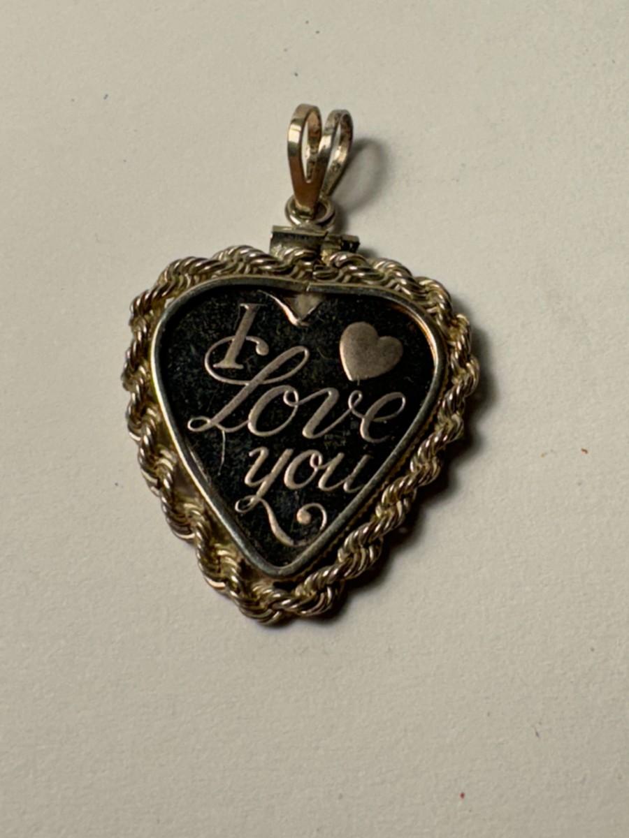 heart-shaped pendant with the words "I Love You" engraved on it. It seems to be made of sterling silver with a gold rope border.