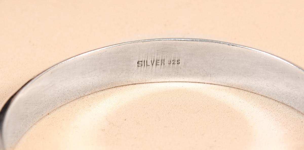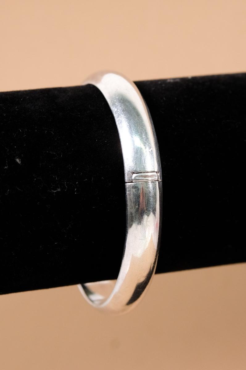 Sterling hinged bangle bracelet. Stamped Silver 925. Measures approx. 2.31 inch inner diameter. Weighs approx. 17 grams.