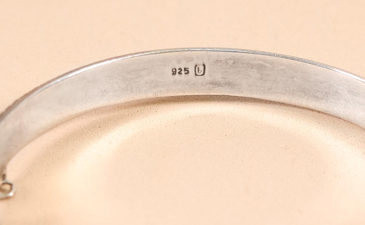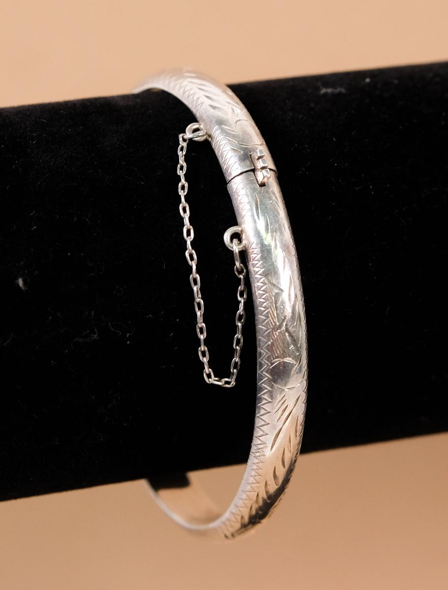 Sterling engraved hinged cuff bracelet with a push button box clasp with safety chain. Stamped 925 with "b" hallmark. Measures approx. 2.25" inner diameter. Weighs approx. 9.2 grams.