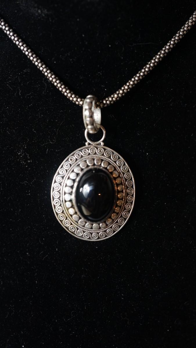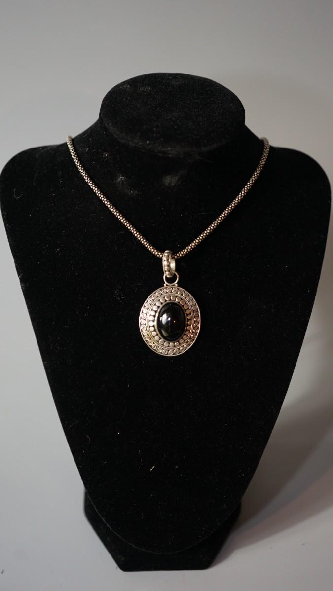 STERLING INDONESIA CRAFTED SM. PENDANT WITH ONYX CABOCHON/STERLING CHAIN