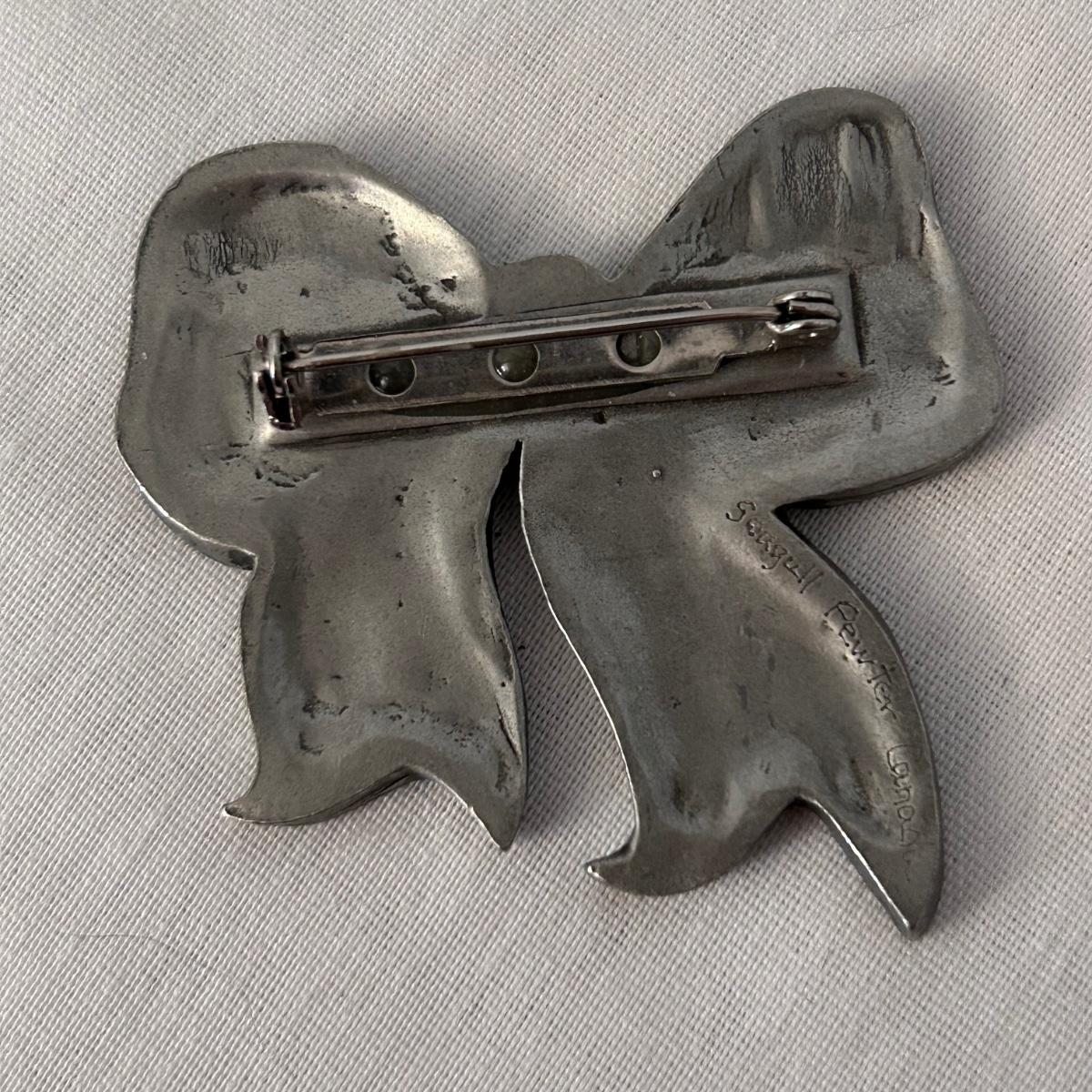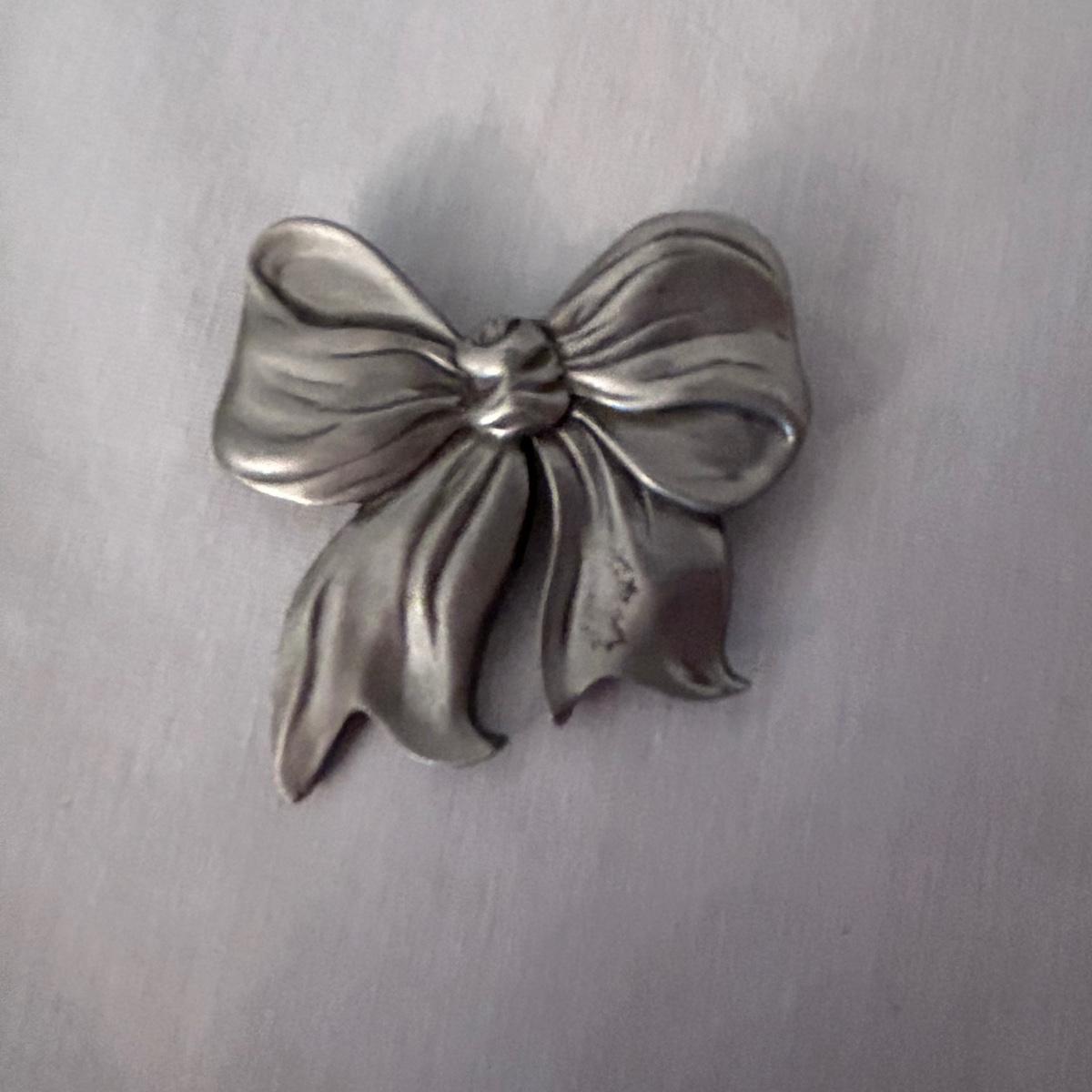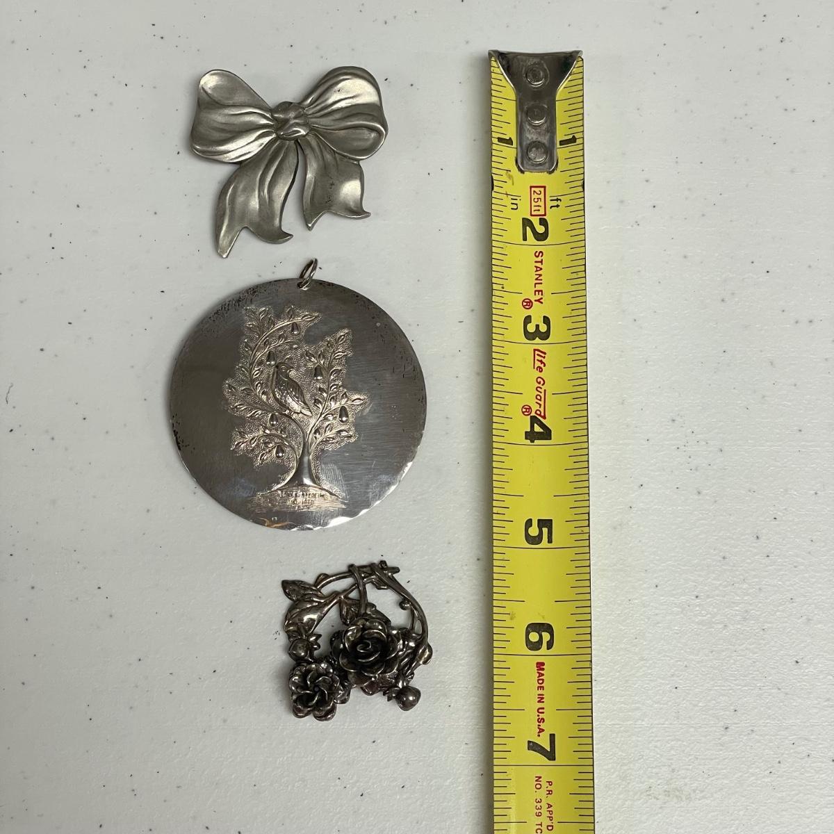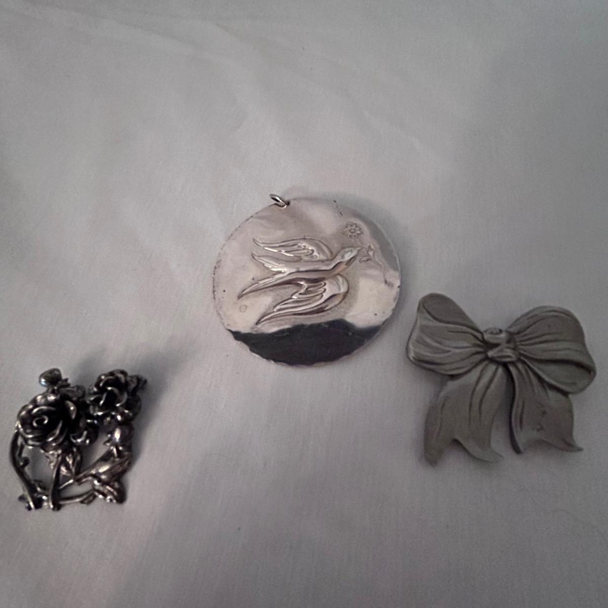 Three statement pieces, two are pins and one is a pendant. The pendant is a 1971 Towle Sterling piece with hammered bird motif.. the floral pin is Jewelart Sterling and the bow pin is a seagull pewter from Canada.