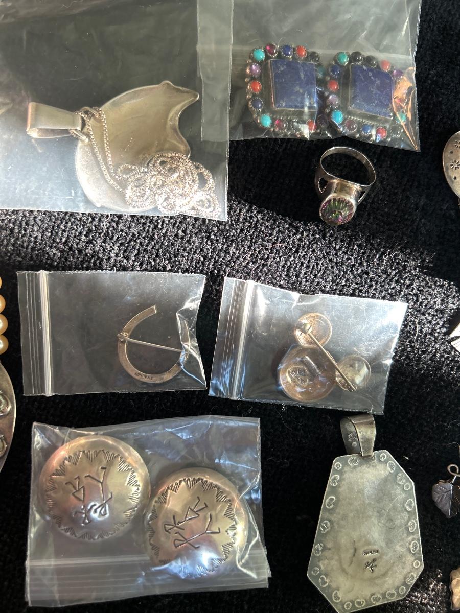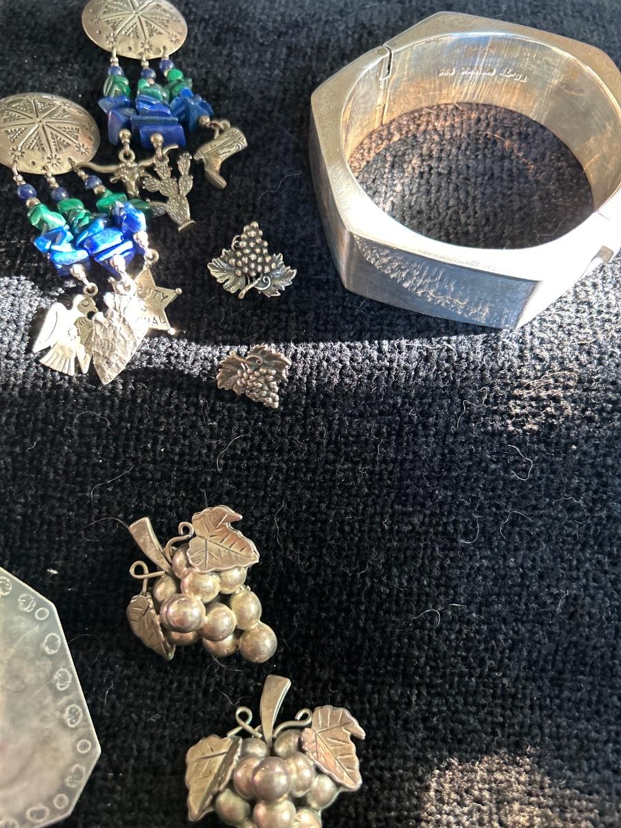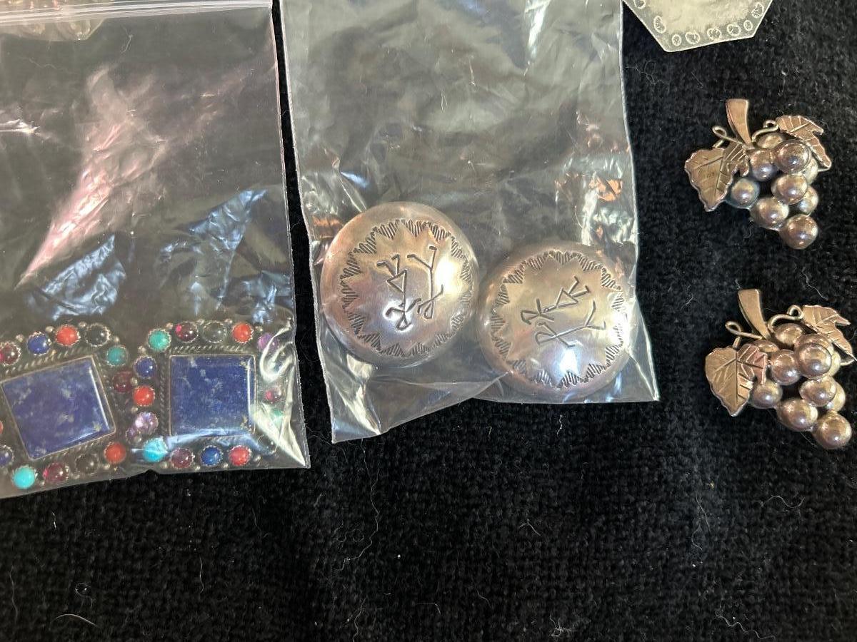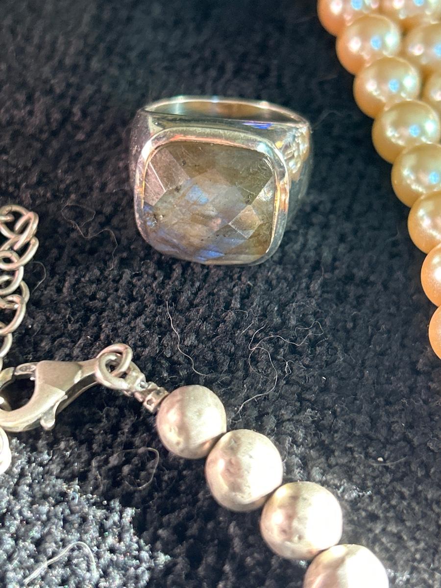 The ring on the top left looks to be labradorite in the center. The last picture are all three clip ons.