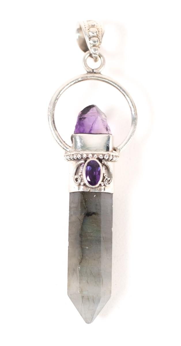 Sterling Labradorite & Amethyst Pendant. Stamped 925. Measures approx. 2.25". Weighs approx. 7 grams.