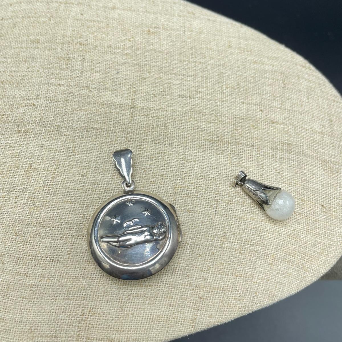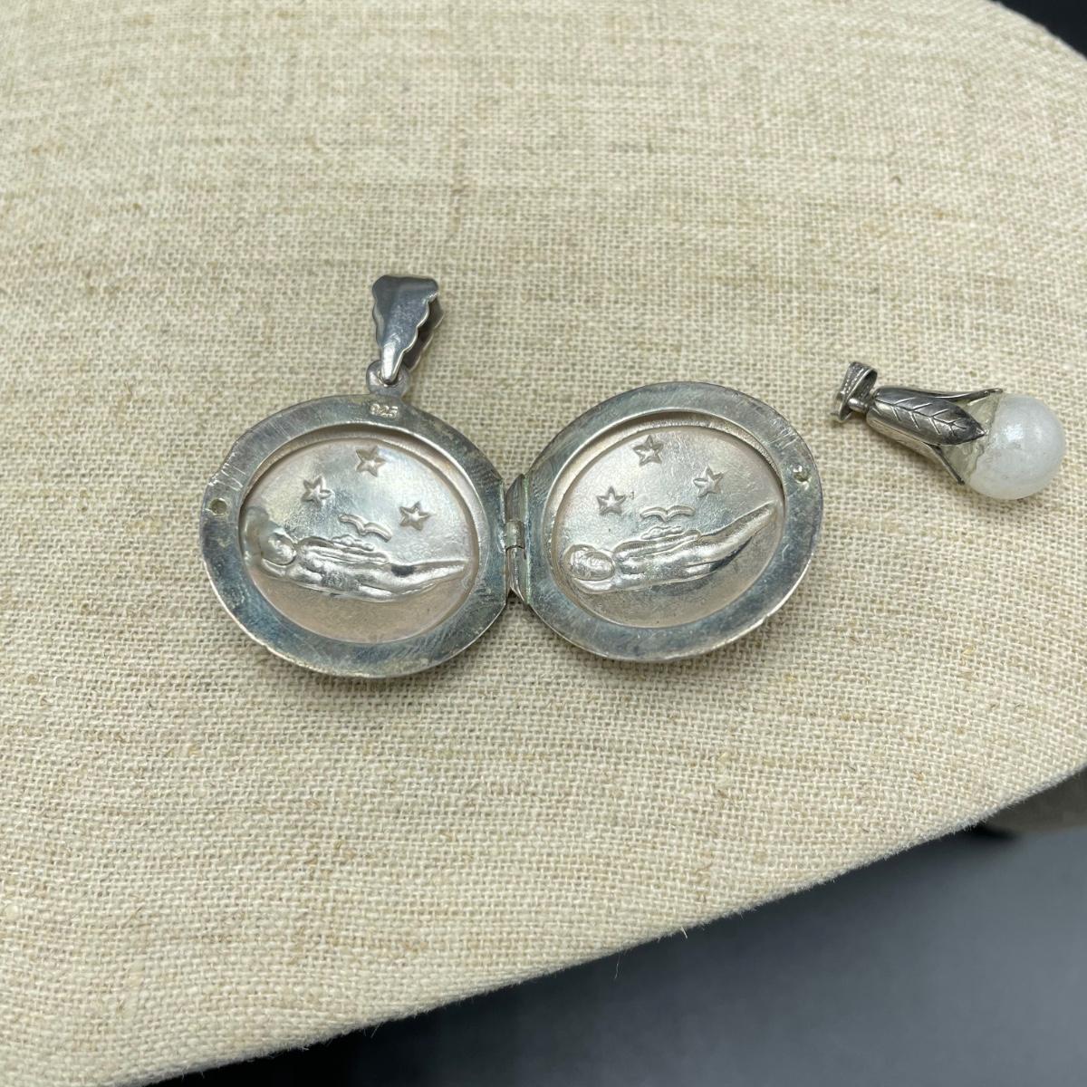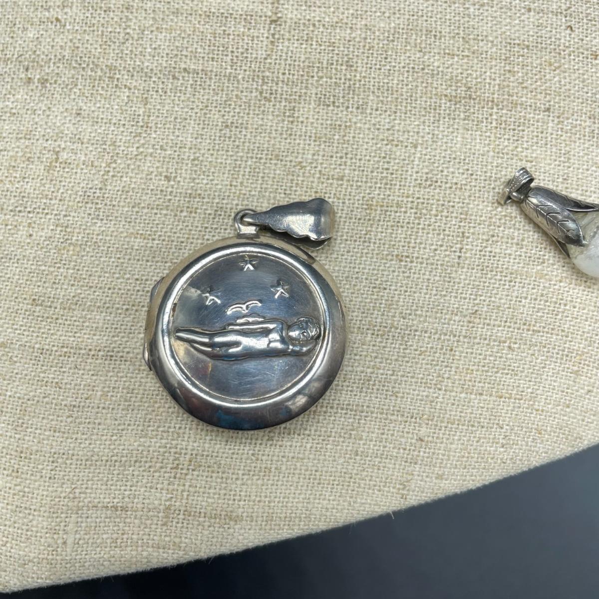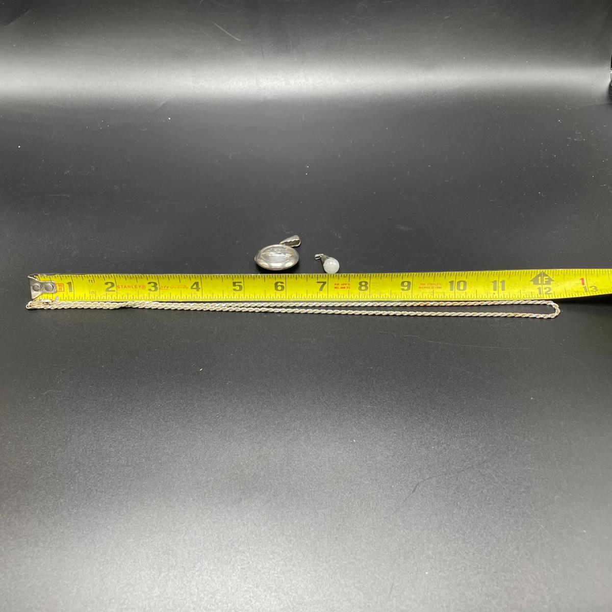 24” chain plus a unique locket both marked 925. The chain is a bit discolored in spots, but will probably shine up easily. Lot also contains a glass like bulb in a silvery leafy setting. See images. Shipping available.