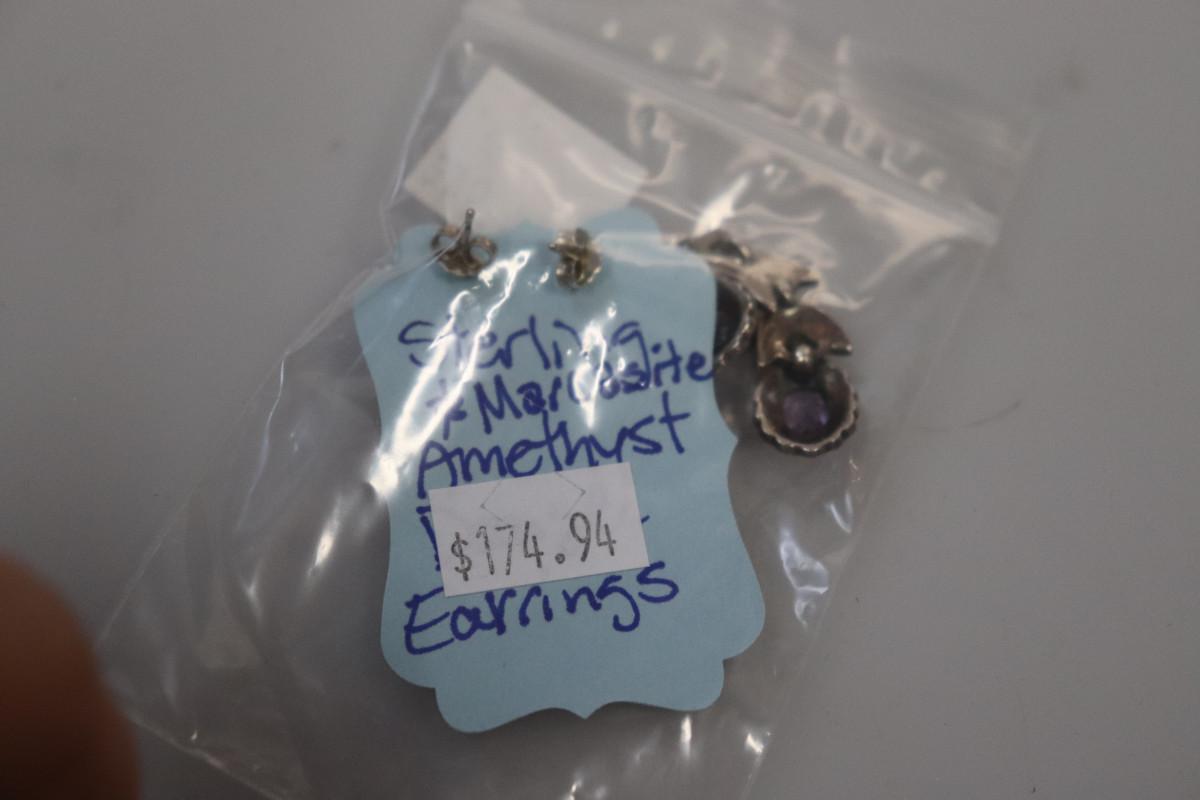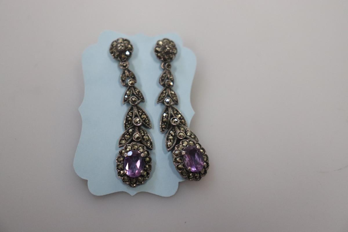 Sterling Marcasite w/Flower Dangle Earrings, Real Amethyst!
