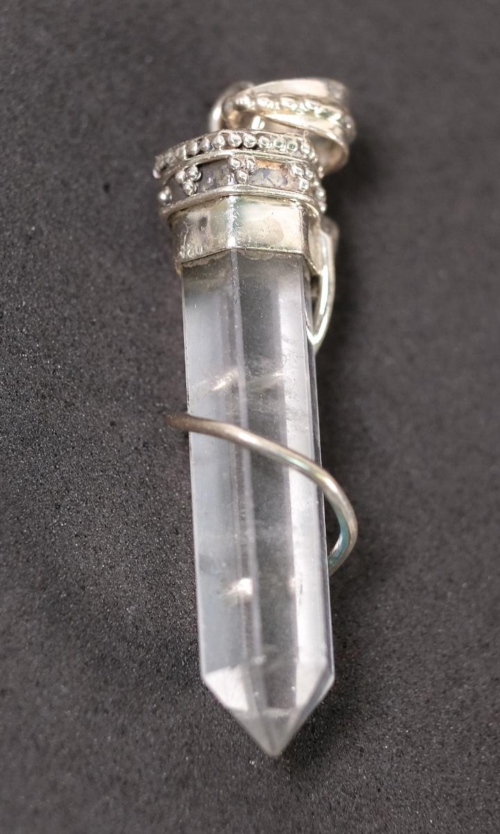 Sterling Moldavite & Quartz Point Pendant. Stamped 925. Measures approx. 1.75". Weighs approx. 6.3 grams.