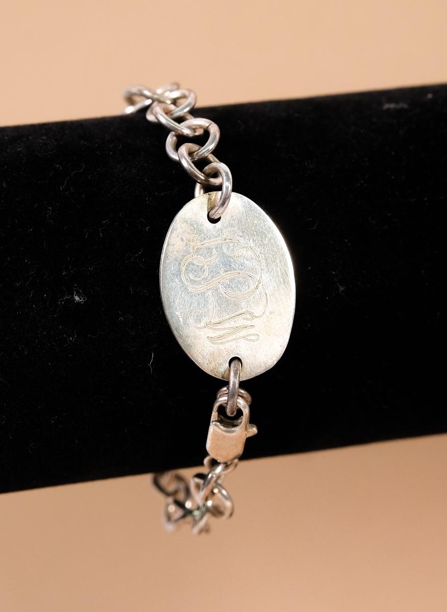 Sterling chain link bracelet with monogrammed plaque. Stamped 925 on clasp. Measures approx. 7.25". Weighs approx. 16.3 grams.