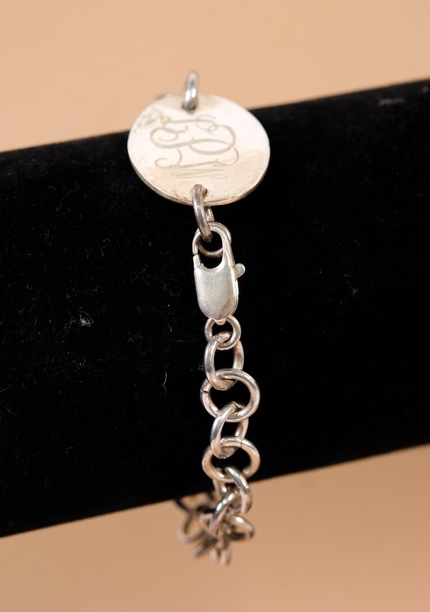 Sterling chain link bracelet with monogrammed plaque. Stamped 925 on clasp. Measures approx. 7.25". Weighs approx. 16.3 grams.