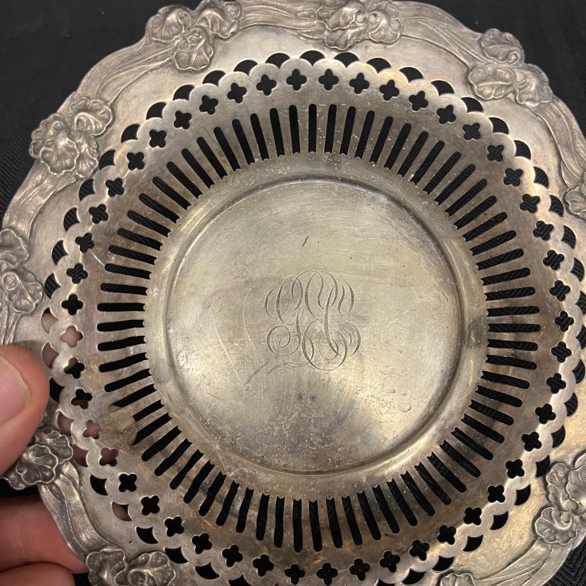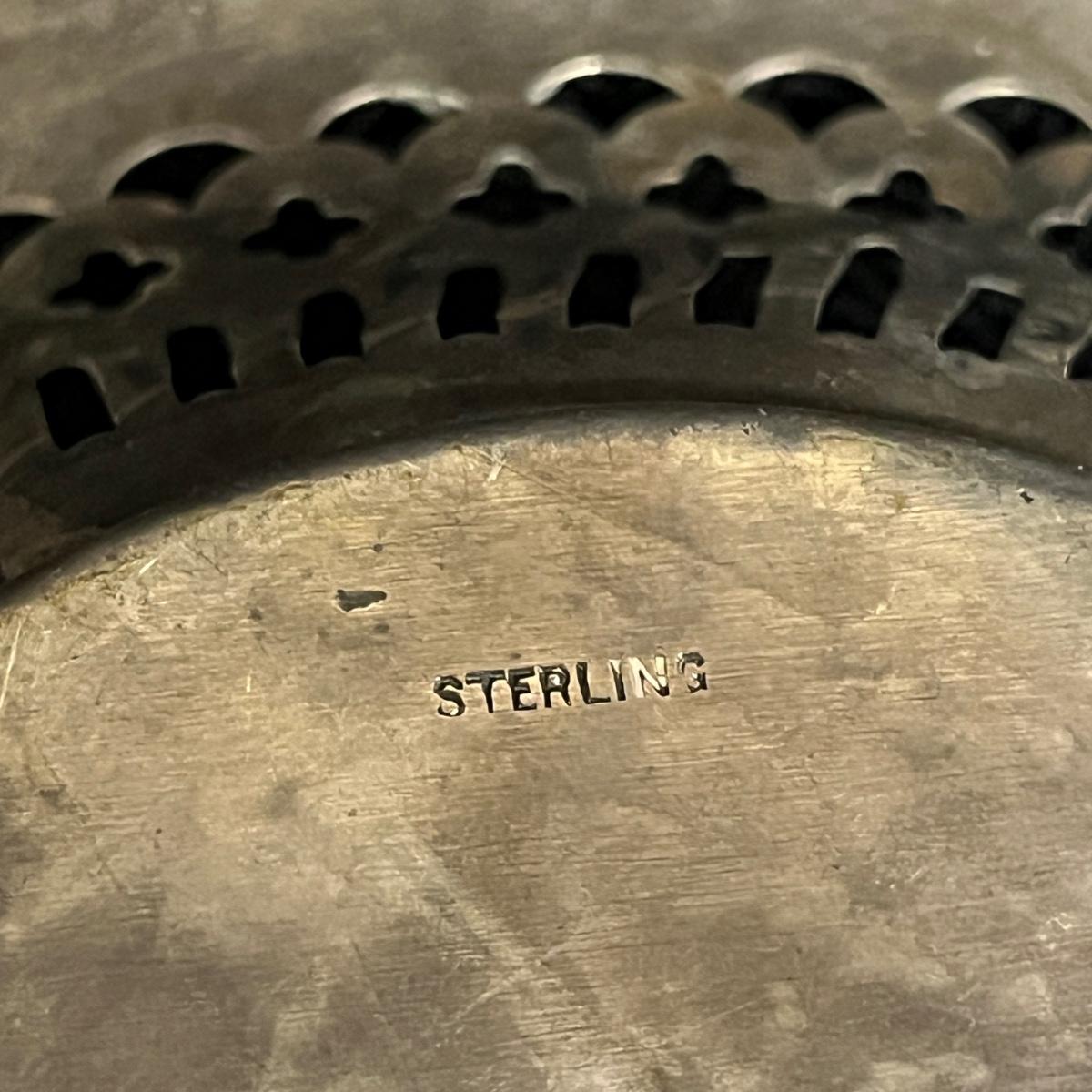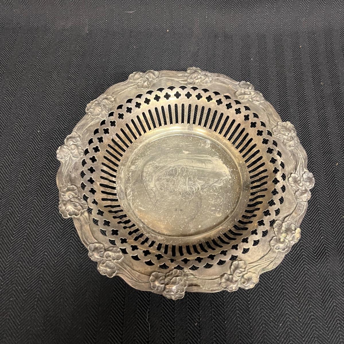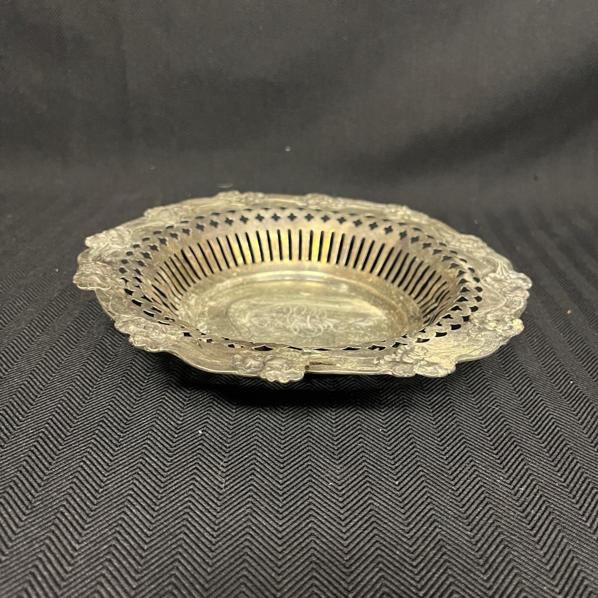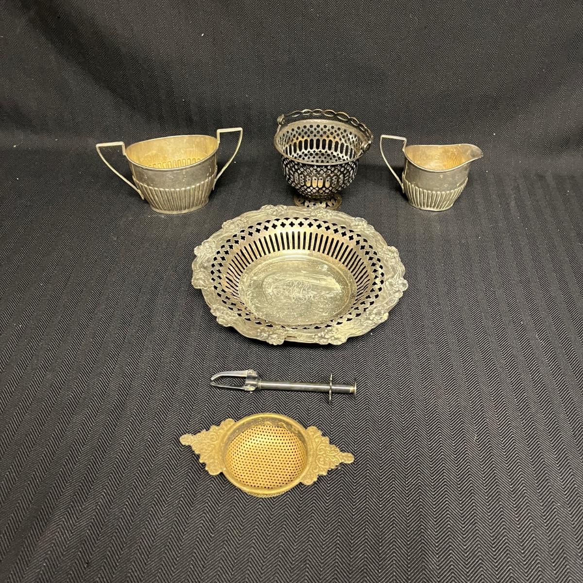 Lot includes sterling creamer and sugar bowl and a sterling dish. Also includes silver colored dish, Fortnum & Mason silver colored tea strainer and a silver colored tong. Sterling dish measures 7”D x 1.5”H.