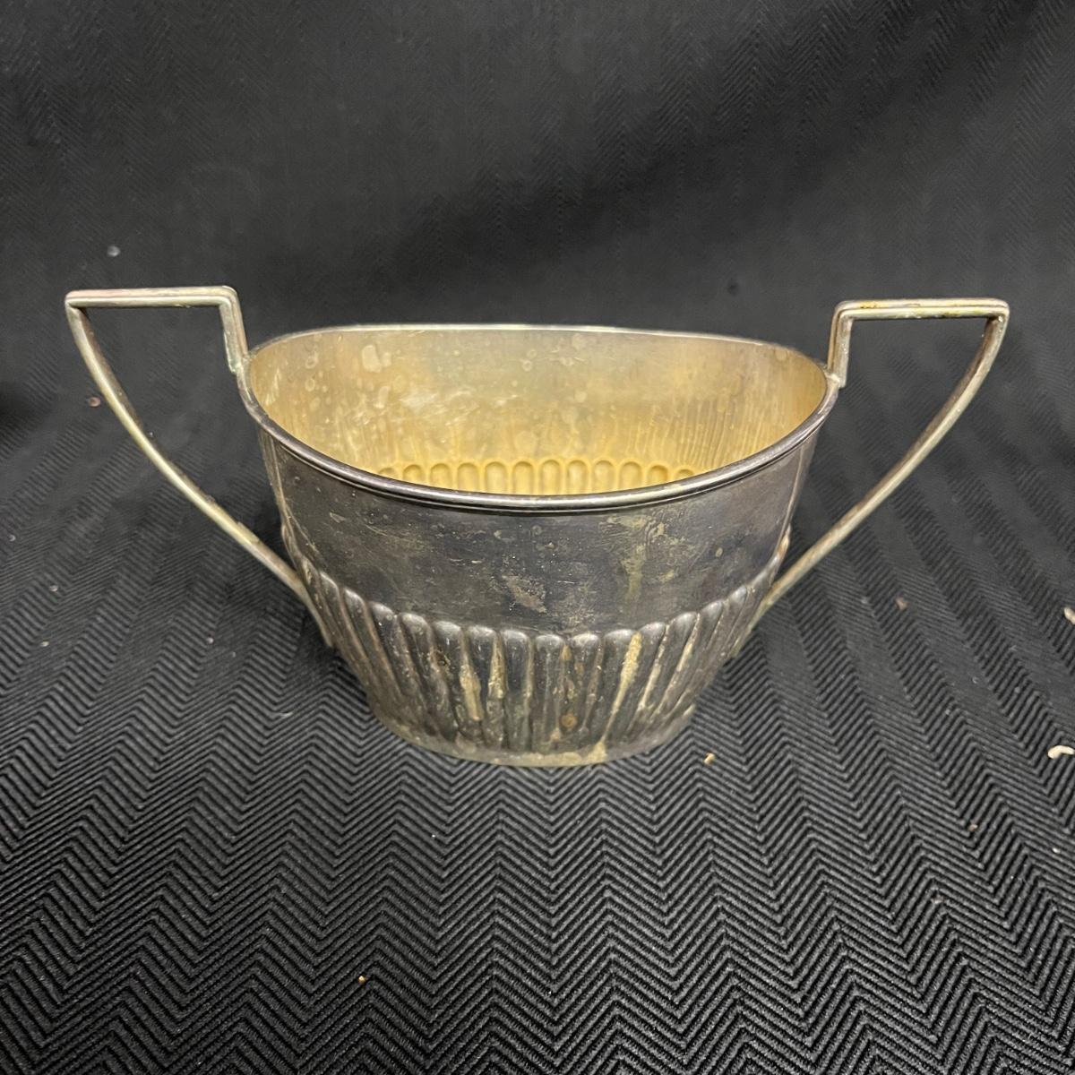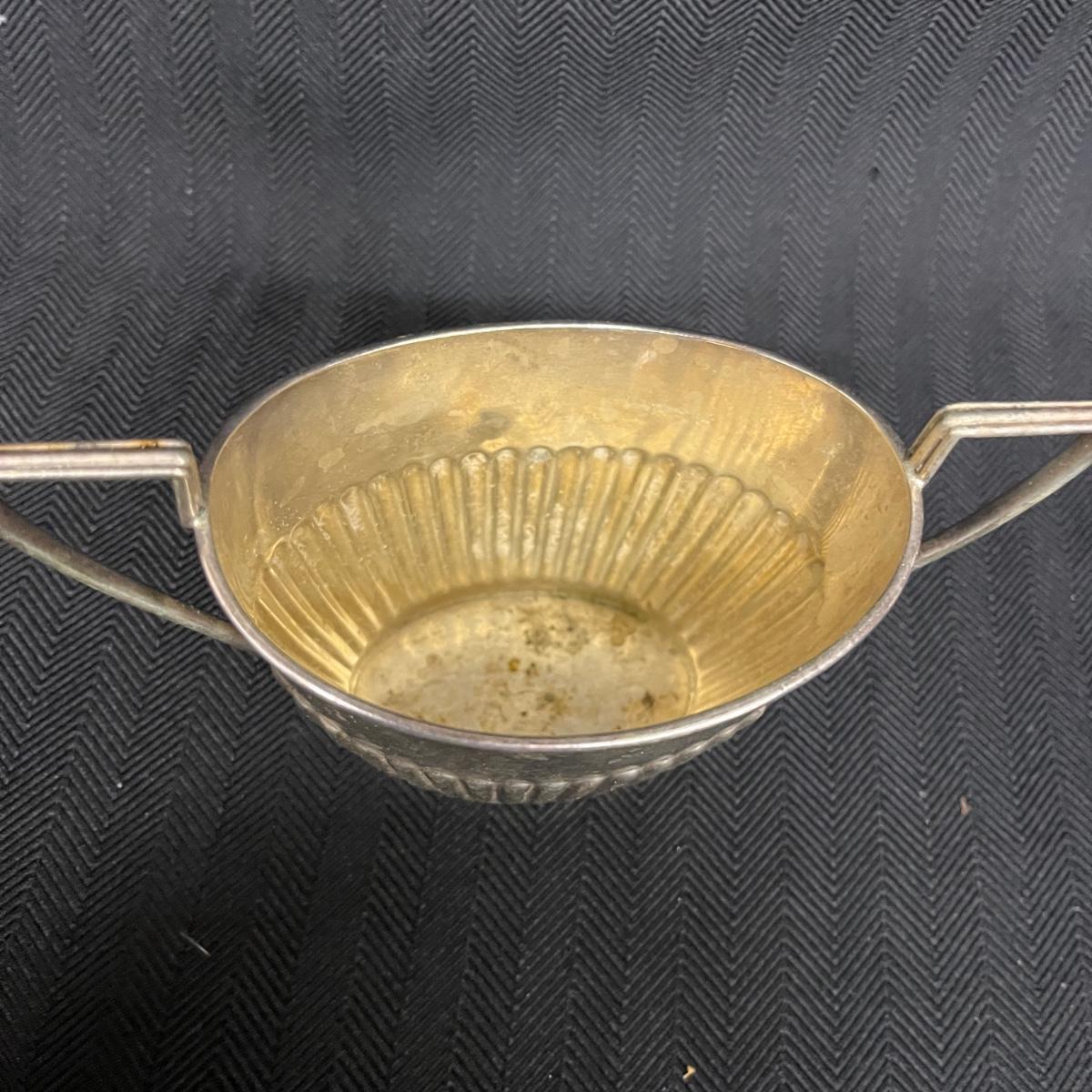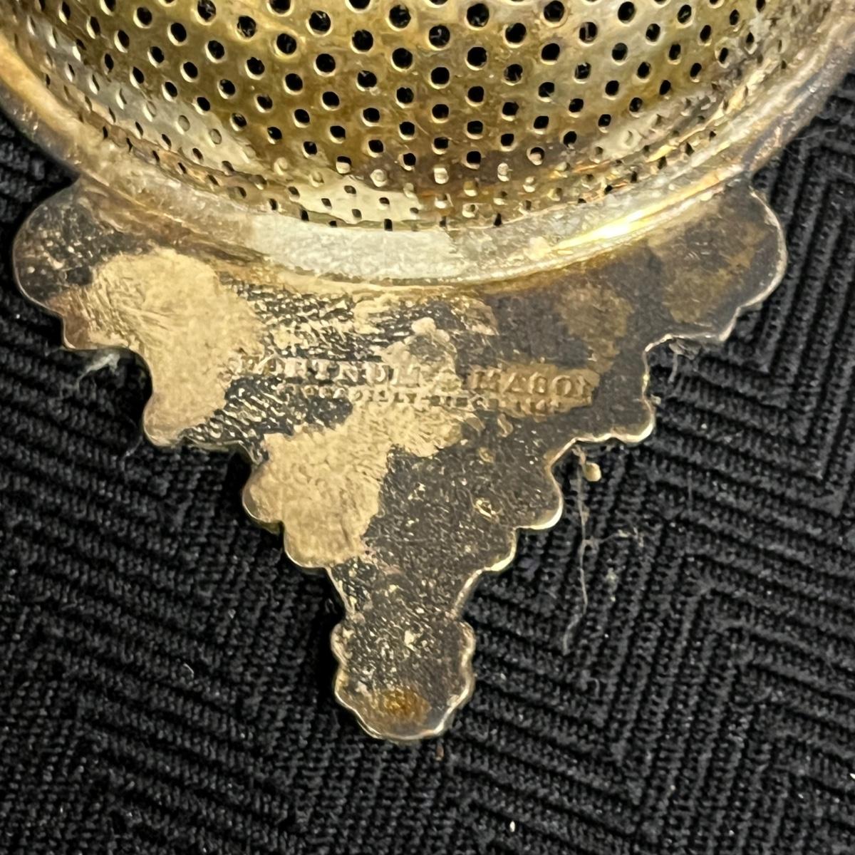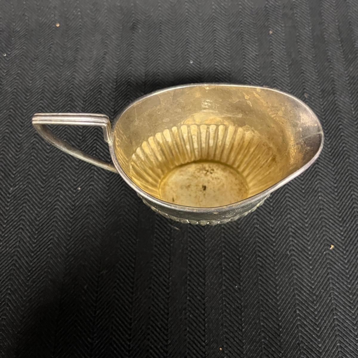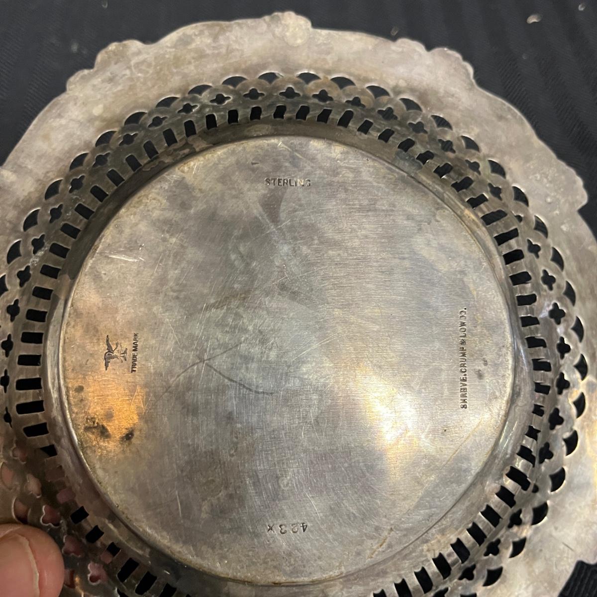 Lot includes sterling creamer and sugar bowl and a sterling dish. Also includes silver colored dish, Fortnum & Mason silver colored tea strainer and a silver colored tong. Sterling dish measures 7”D x 1.5”H.