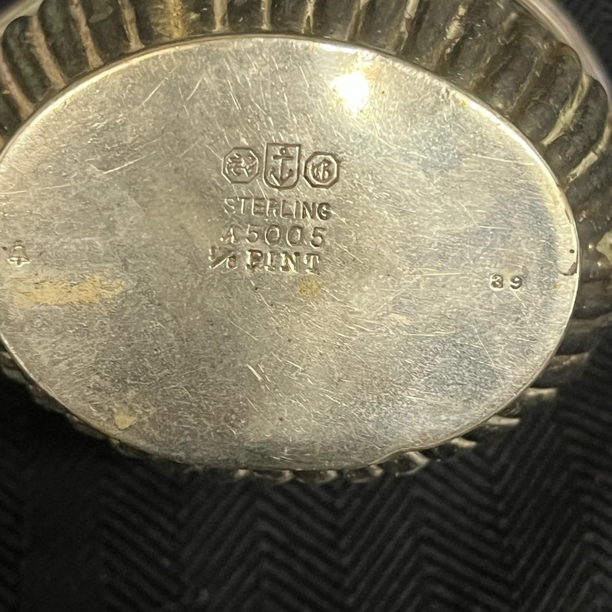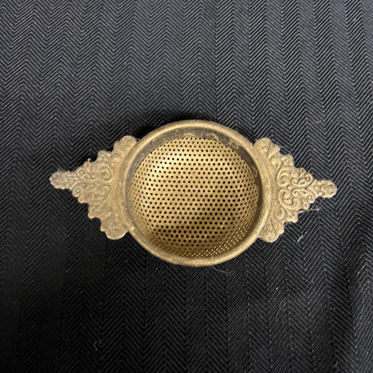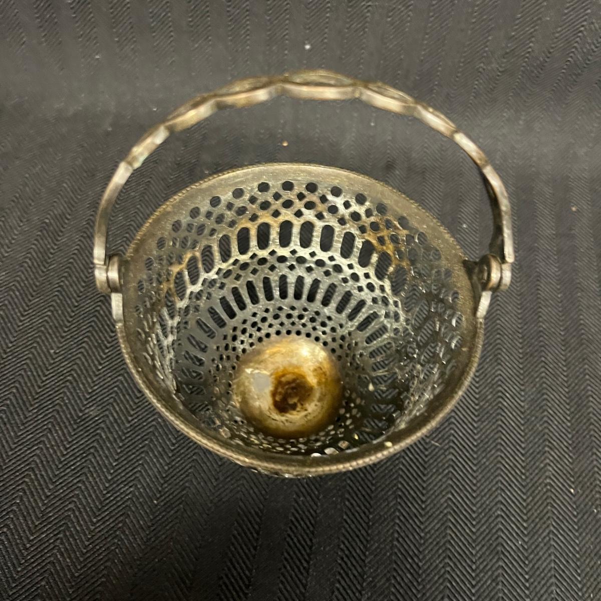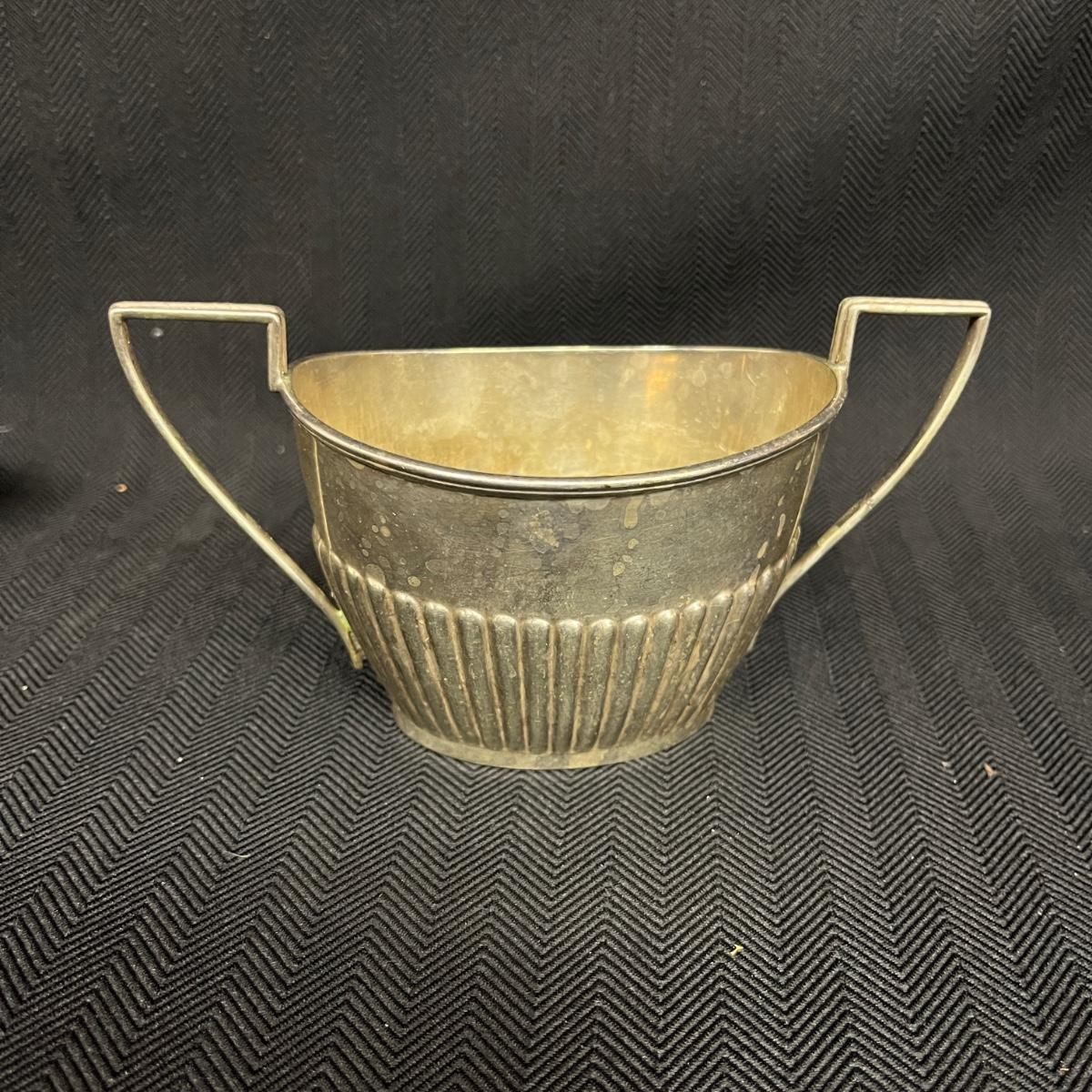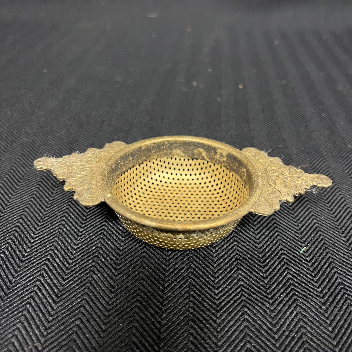 Lot includes sterling creamer and sugar bowl and a sterling dish. Also includes silver colored dish, Fortnum & Mason silver colored tea strainer and a silver colored tong. Sterling dish measures 7”D x 1.5”H.