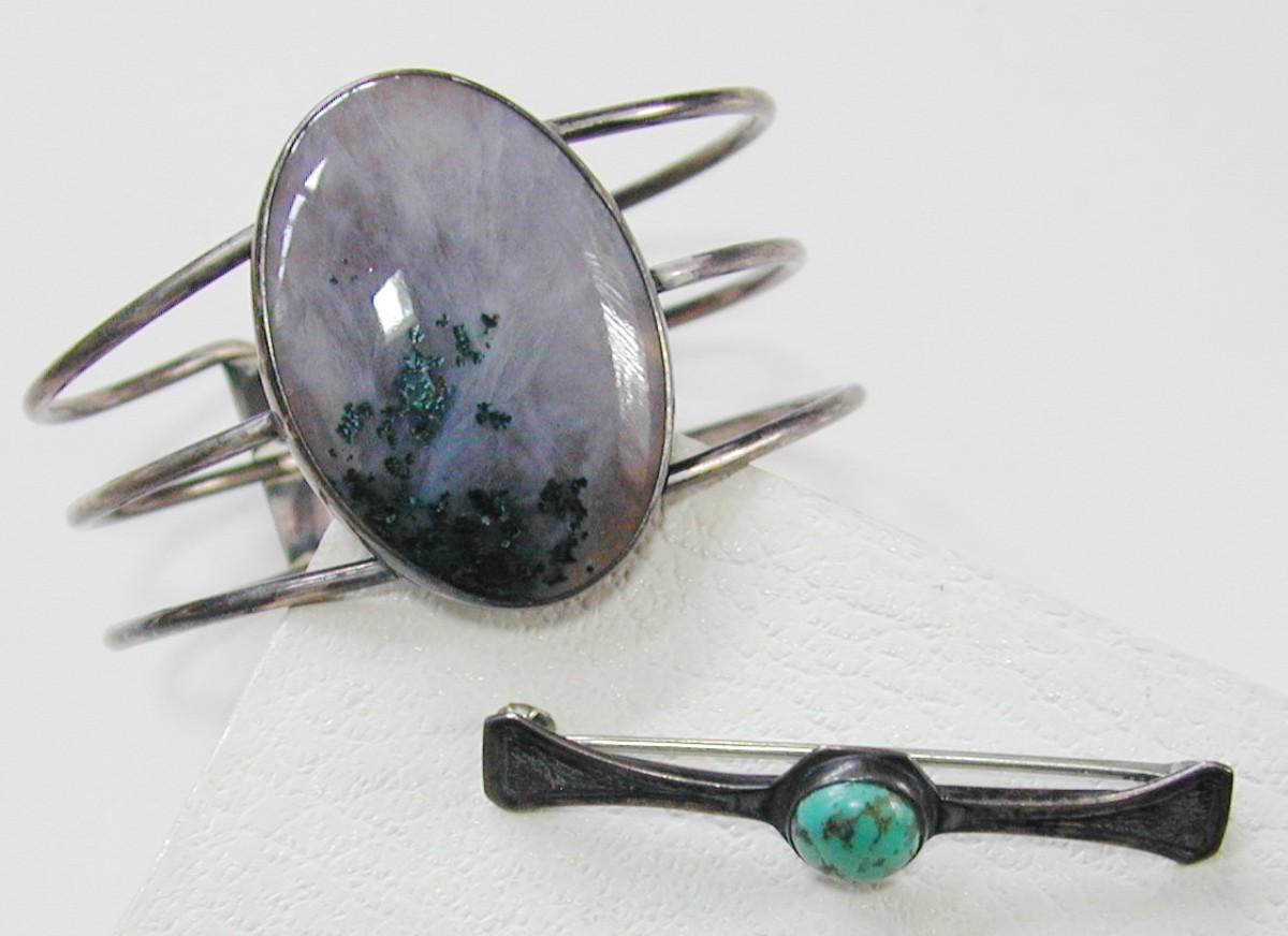 Sterling Moss Agate Cuff Bracelet & Turquoise Pin