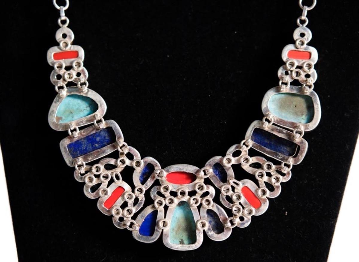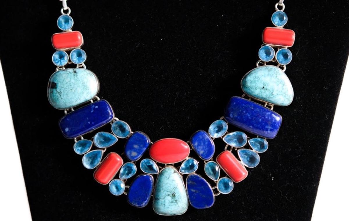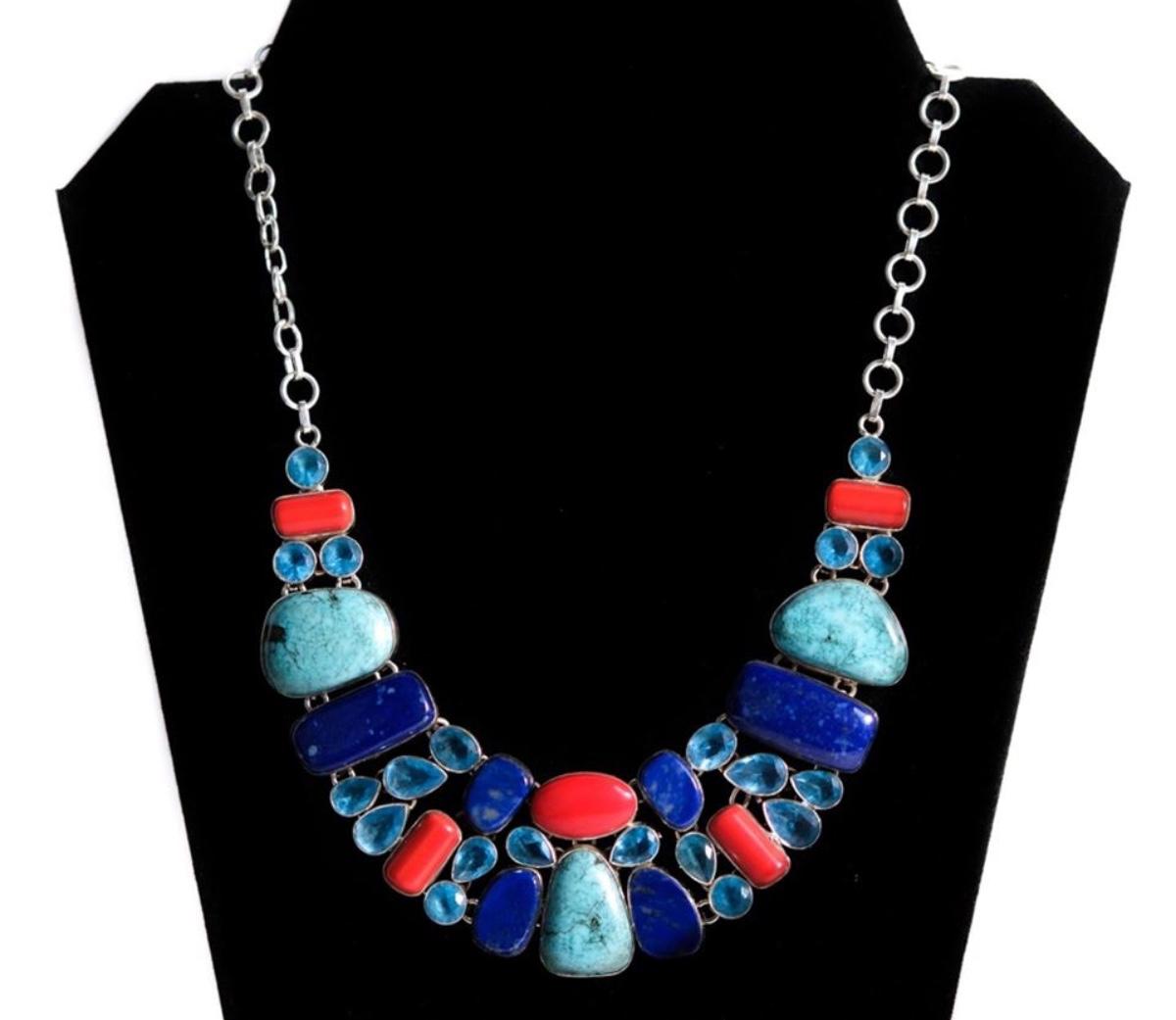 Stamped 925 on clasp. Coral, lapis lazuli, turquoise and light blue glass. Measures approx. 18". Weighs approx. 111g