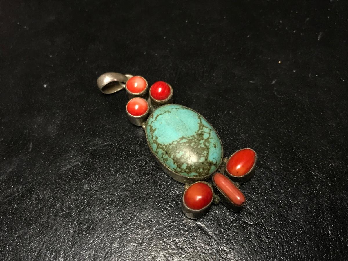 Beautiful sterling Navajo pendant marked with turquoise and coral