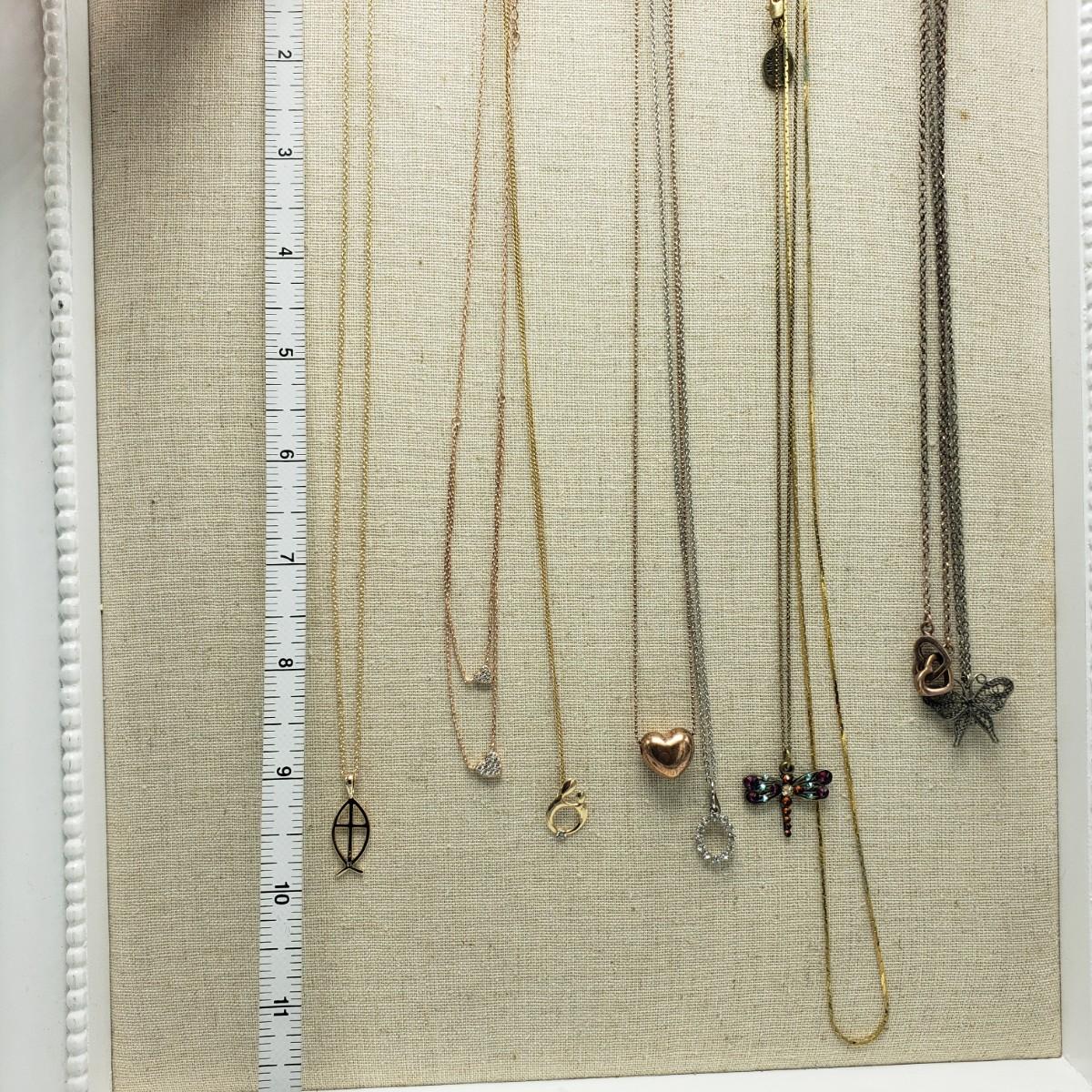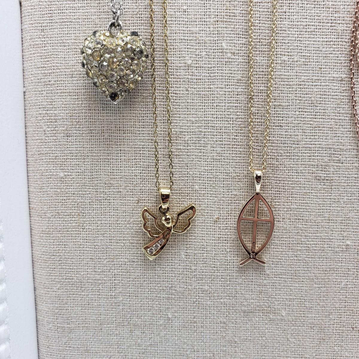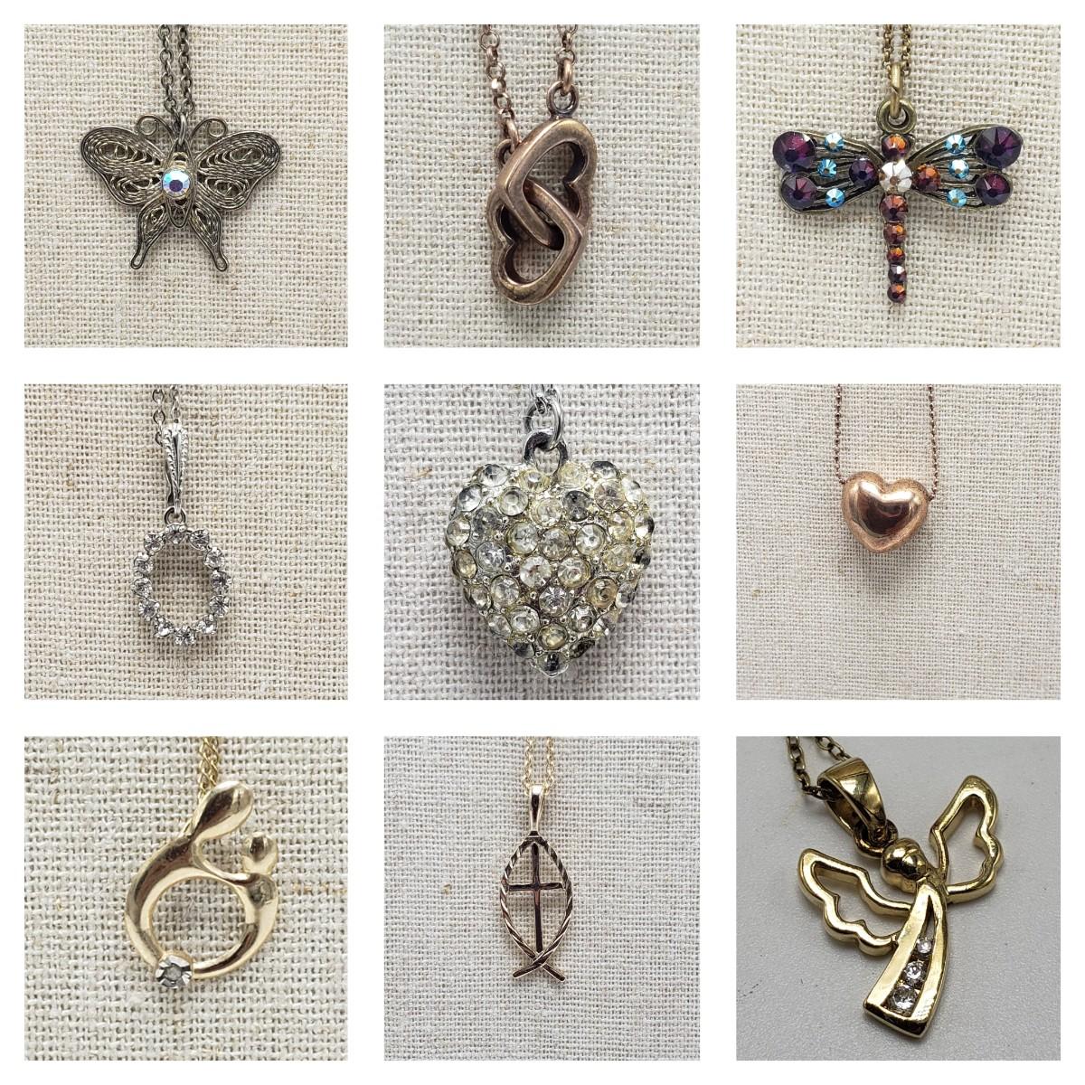 This 11 piece necklace lot features sterling necklaces with gorgeous pendants. There are five sterling stamped "925" necklaces. The angel, mother and child, two sided heart and the oval pendants contain clear stones. The Mother and Child has "RL 10K" stamped on the pendant. The chain for this pendant is stamped, "RL 1/20/14K GF". The filigree on the butterfly in the last pictures is so delicate.