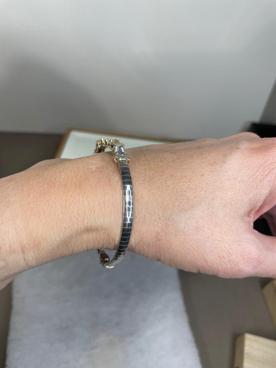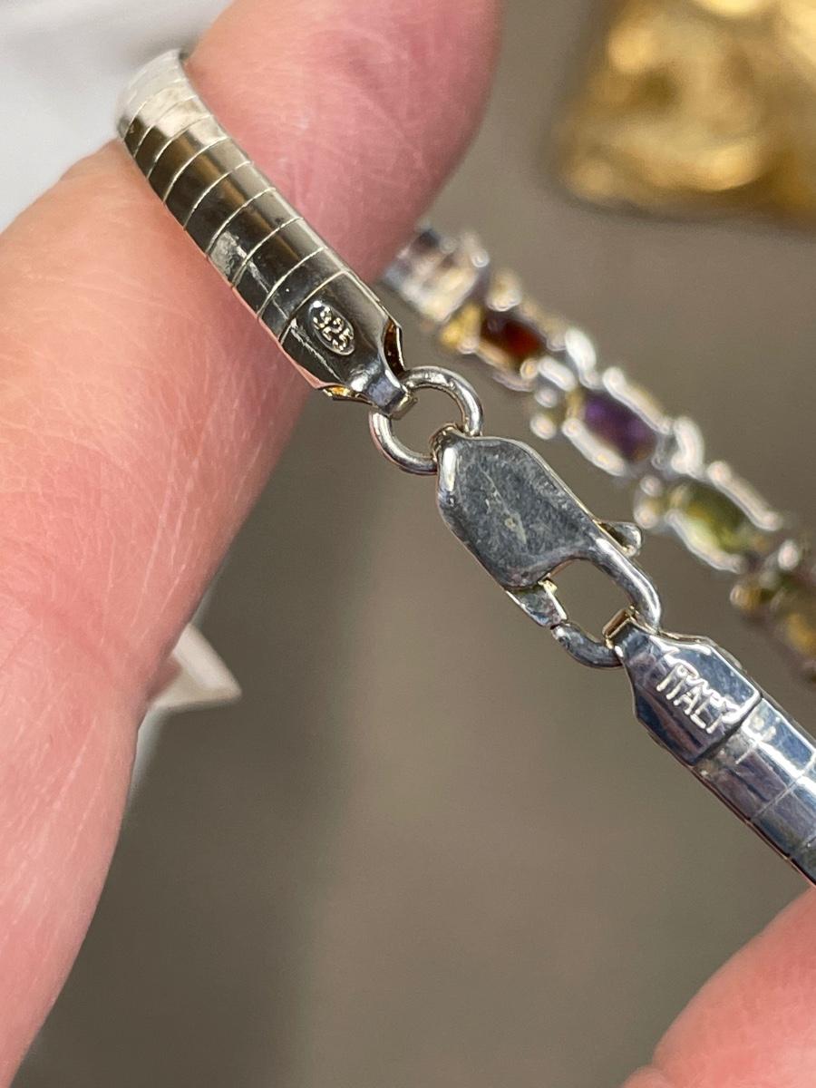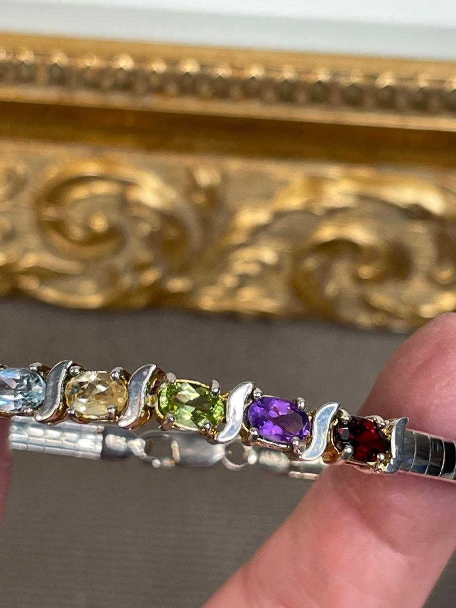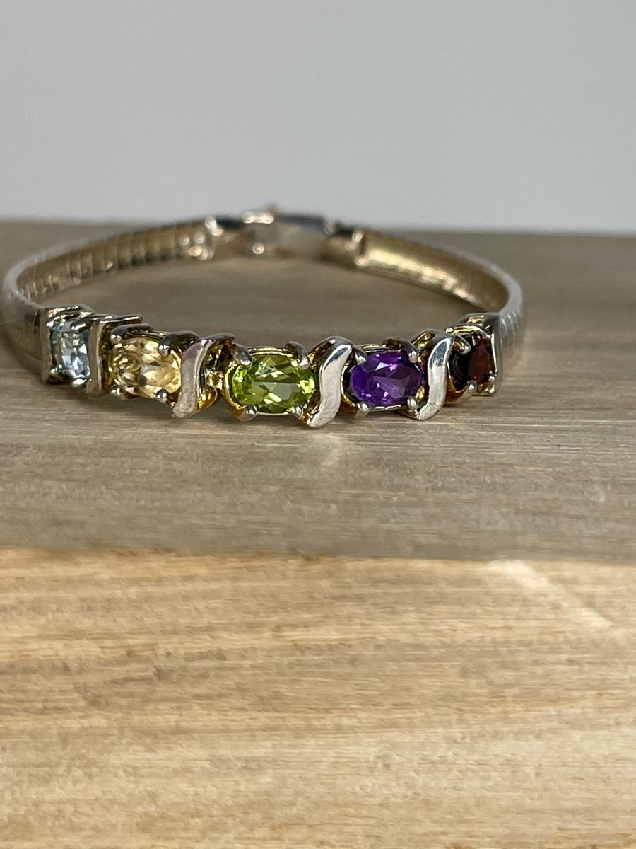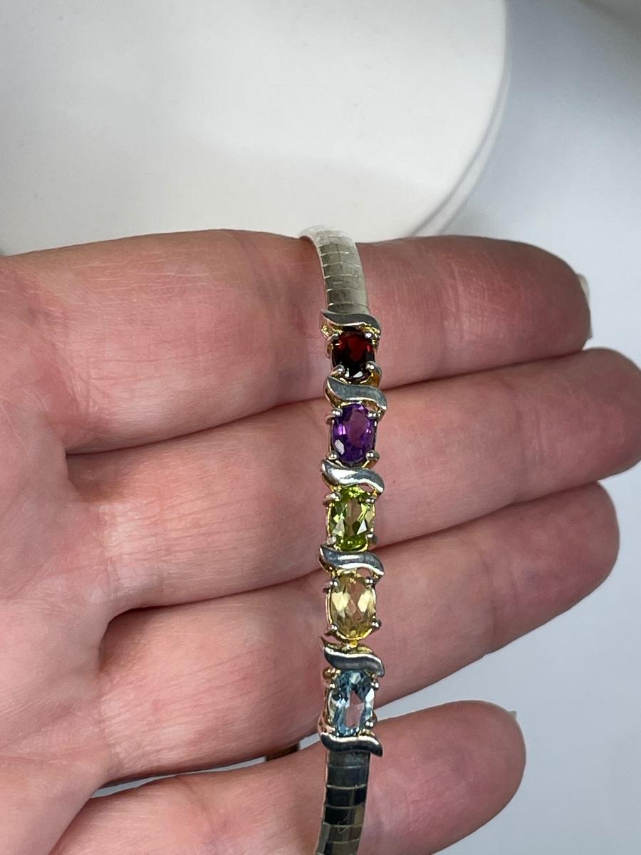 Stones include garnet, amethyst, peridot, citrine and blue topaz. Bracelet is a bit stiff due to the gem design part but is comfortable on the wrist. Measures 7” long