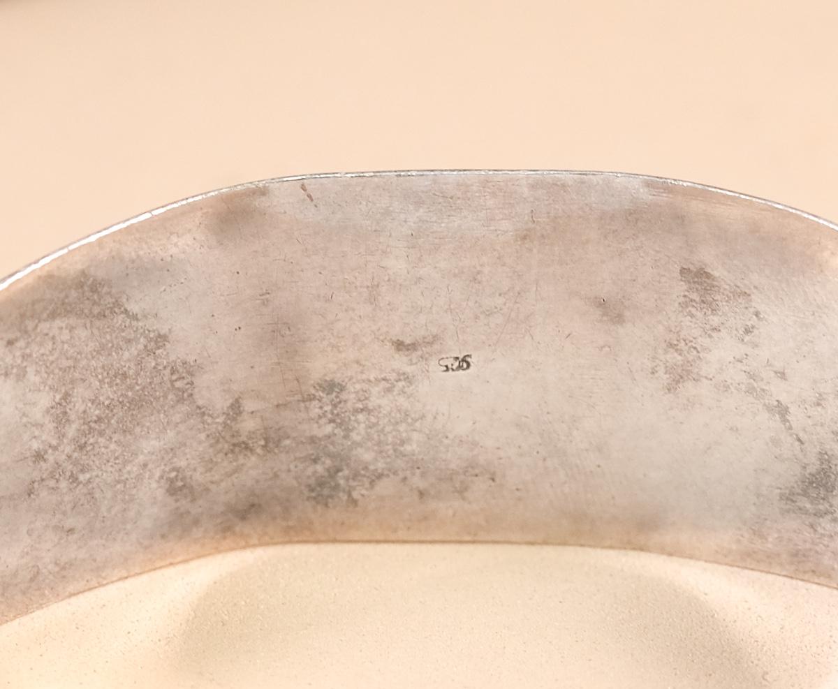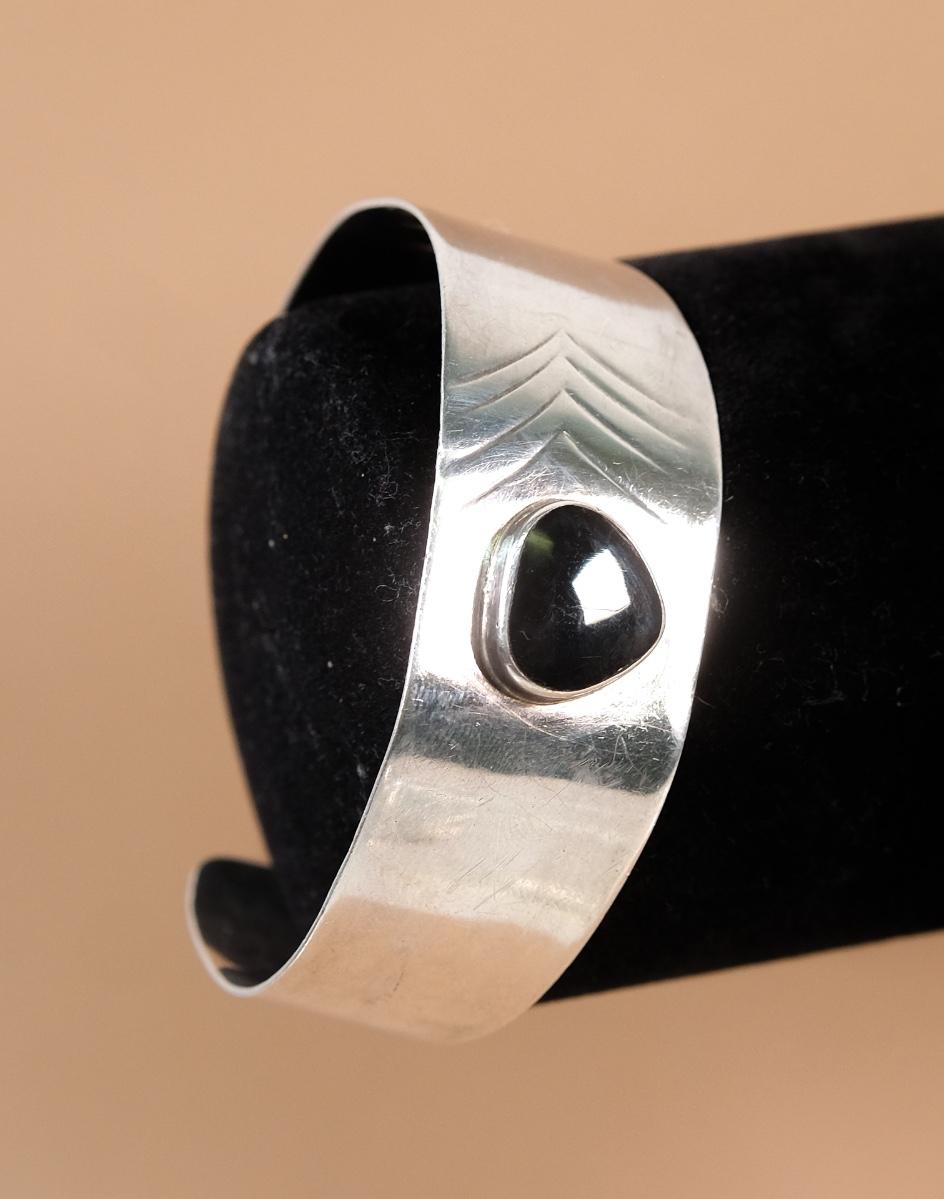 Sterling cuff bracelet with a centered onyx stone. Cuff is slightly misshapen. Stamped 925. Measures approx. 2.12" inner diameter with an inch opening. Weighs approx. 16 grams.