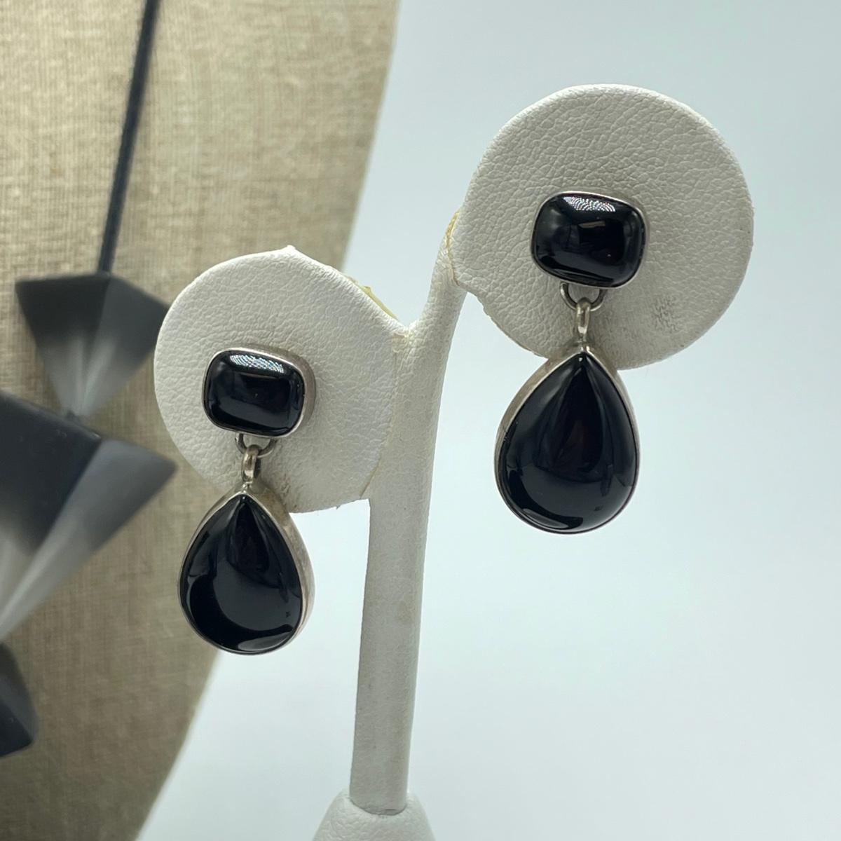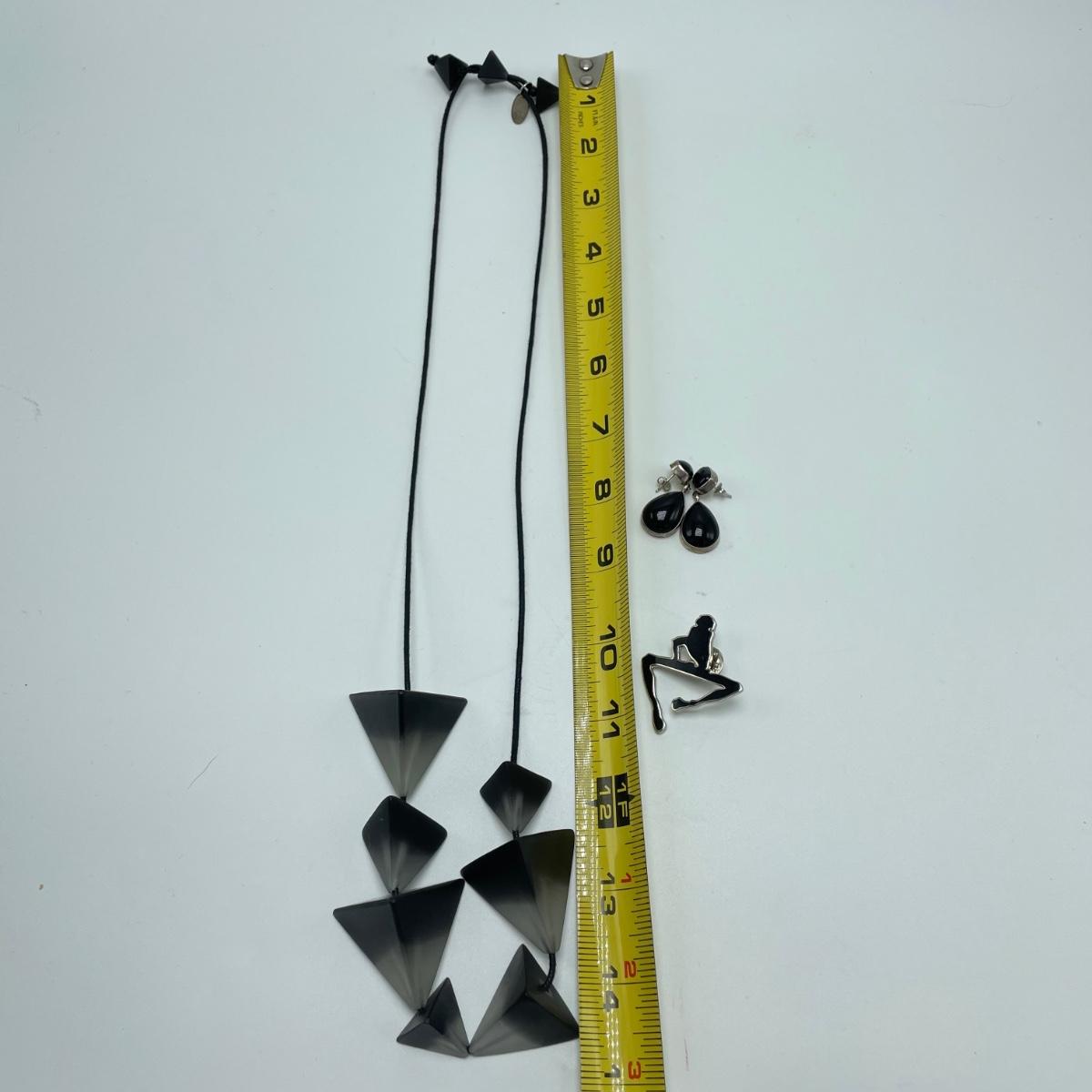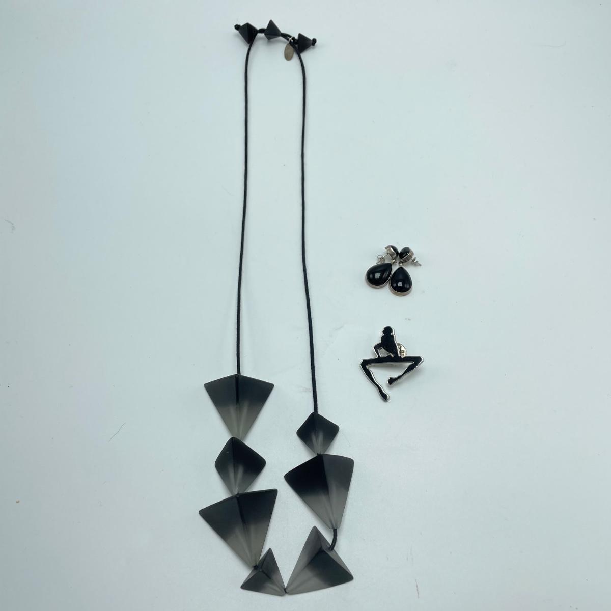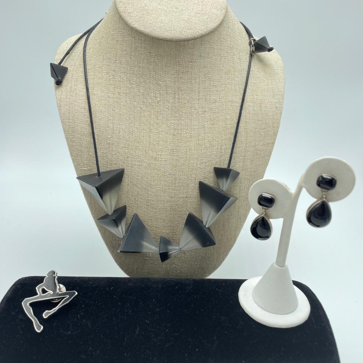 A signed pair of Sterling and onyx earrings, an abstract and unique enamel and metal brooch. Lot also features a black and cloudy polymer geometric necklace with adjustable length in a leather like vinyl cord by Sylca. See images. Shipping available.
