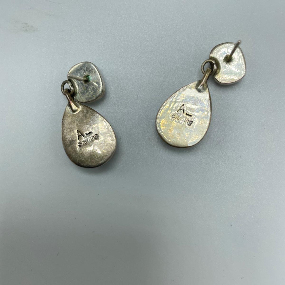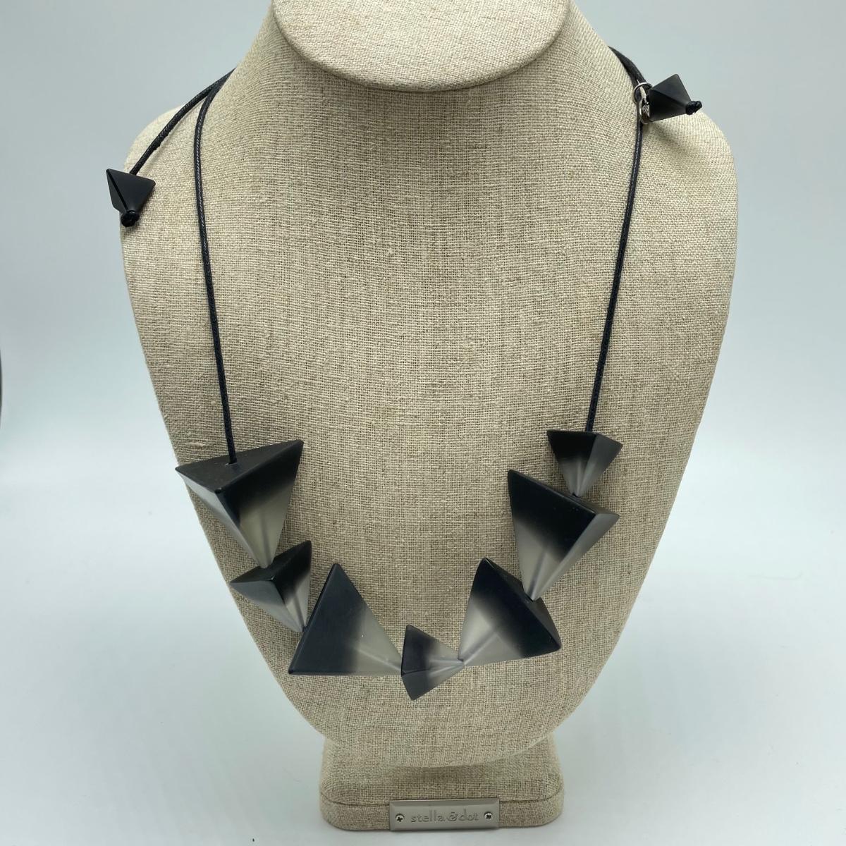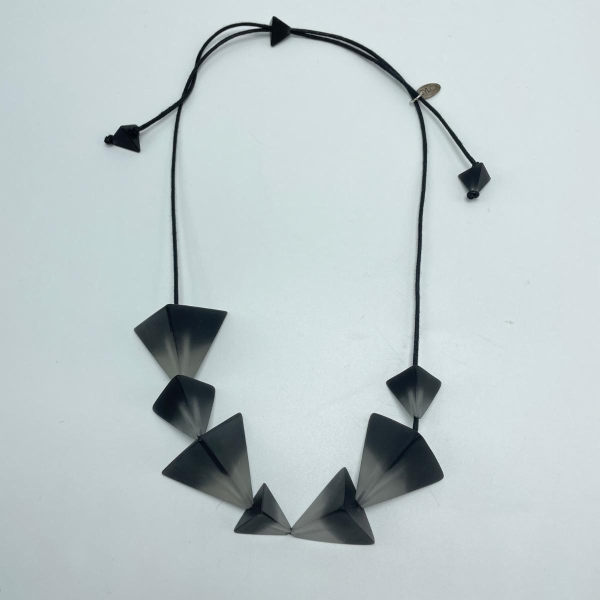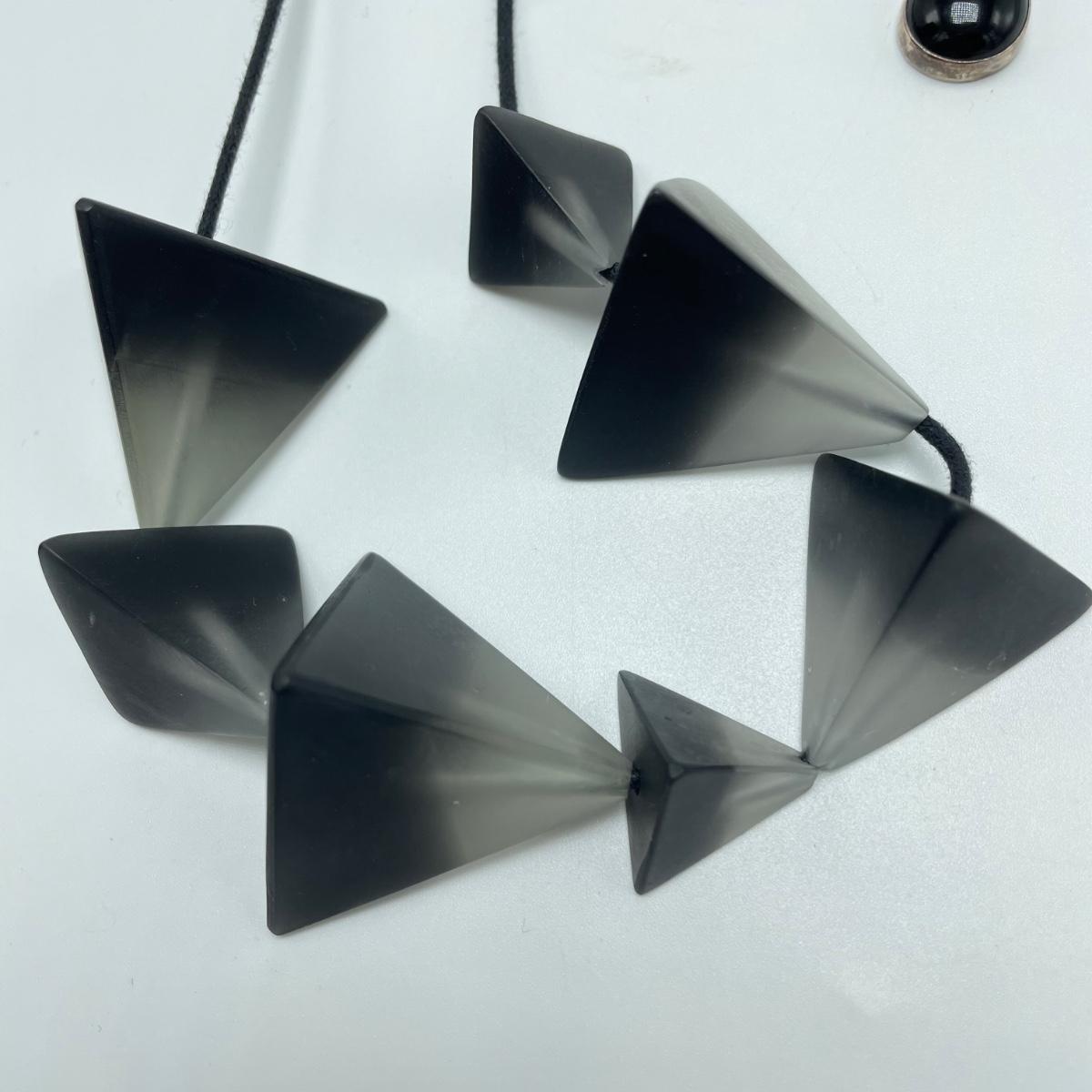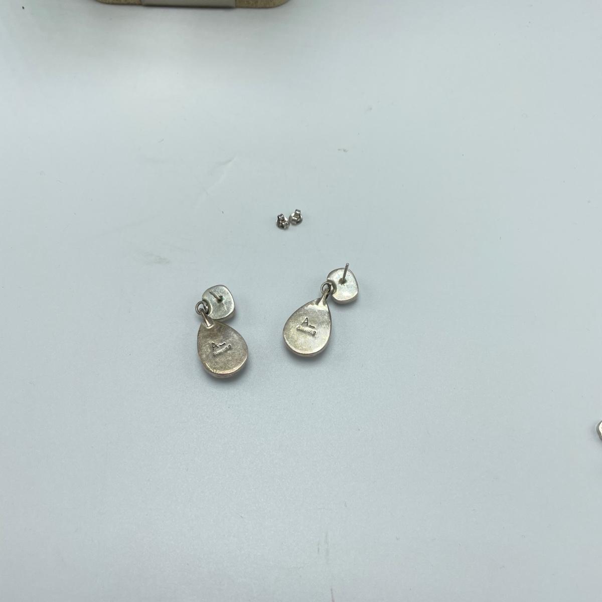A signed pair of Sterling and onyx earrings, an abstract and unique enamel and metal brooch. Lot also features a black and cloudy polymer geometric necklace with adjustable length in a leather like vinyl cord by Sylca. See images. Shipping available.