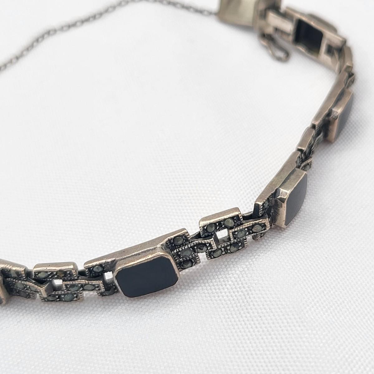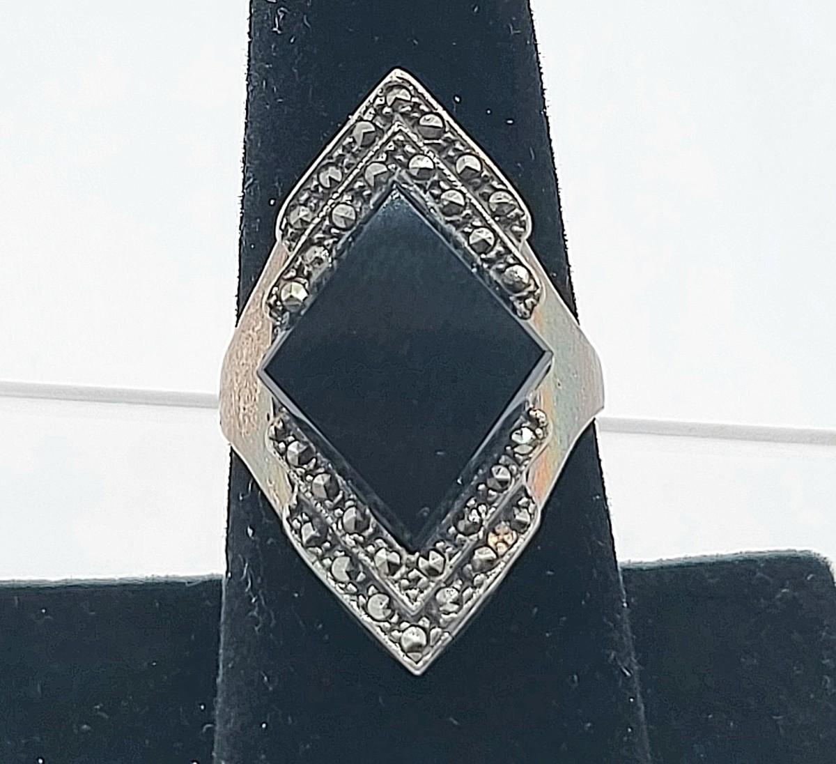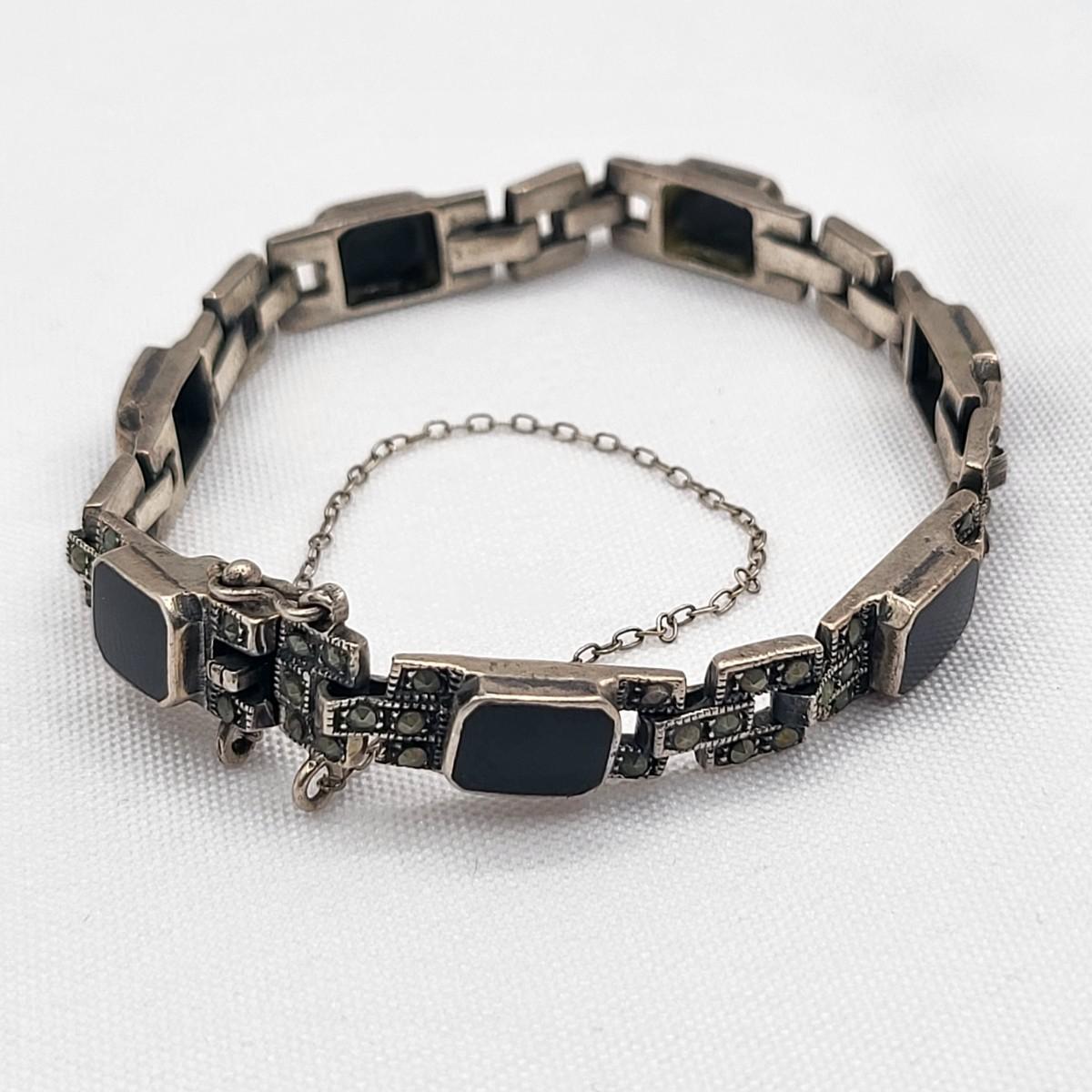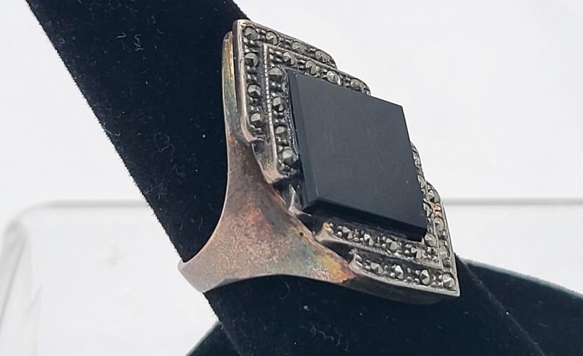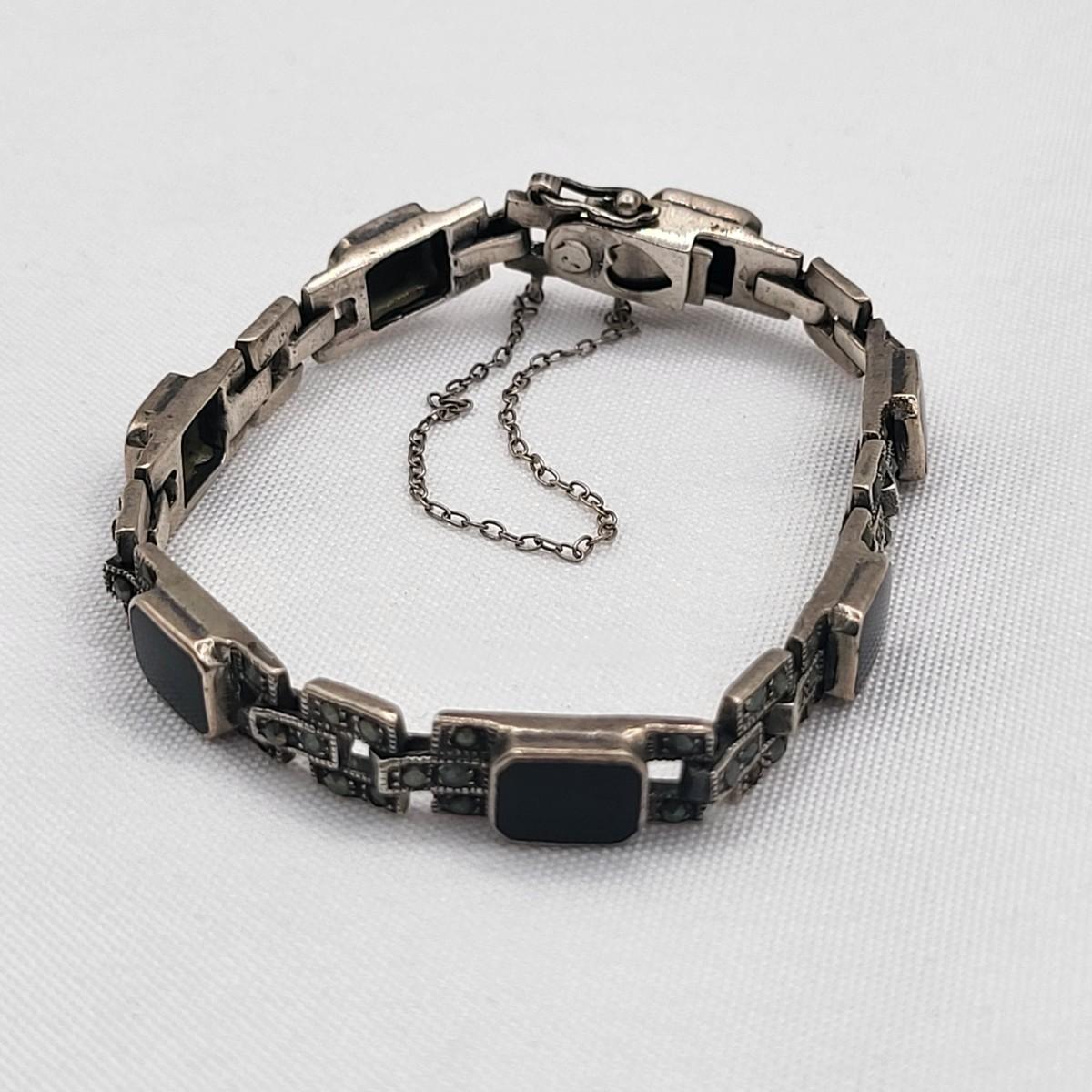 Both rings are stamped. Deco onyx and marcasite bracelet could not find a marking but there's a heart on the inside if it at the clasp. It is a nice secure push clasp with safety chain. There is seven inlay black onyx. Panel links and seven marcasite links. Rings are sizes 6 and 8. Nice patina but certainly could be polished. Total weight is 29.36 grams.