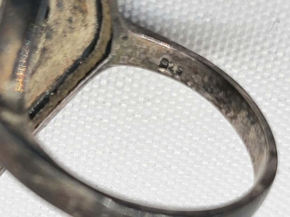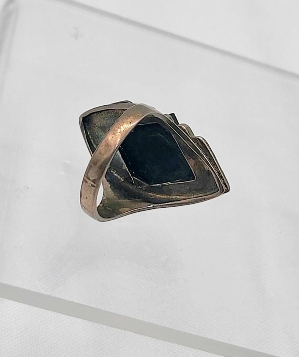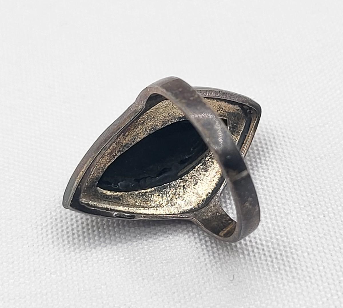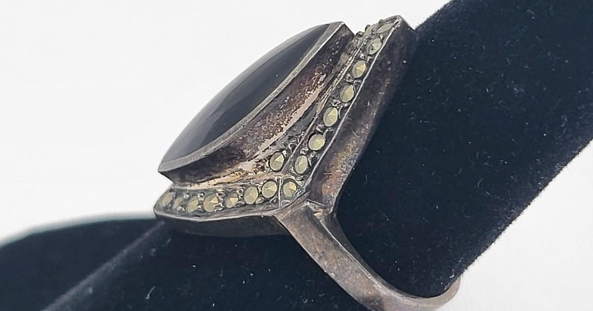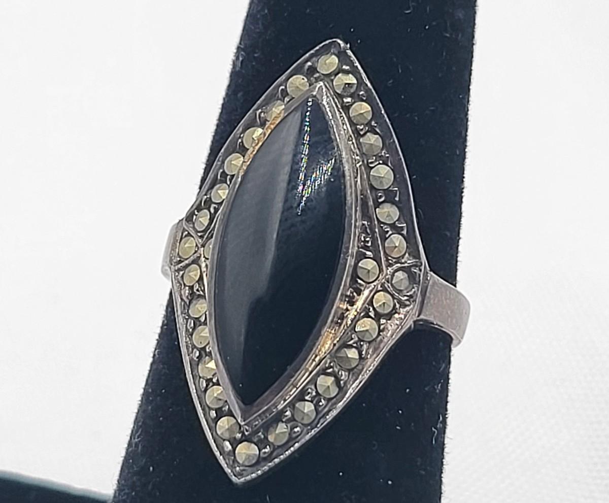 Both rings are stamped. Deco onyx and marcasite bracelet could not find a marking but there's a heart on the inside if it at the clasp. It is a nice secure push clasp with safety chain. There is seven inlay black onyx. Panel links and seven marcasite links. Rings are sizes 6 and 8. Nice patina but certainly could be polished. Total weight is 29.36 grams.