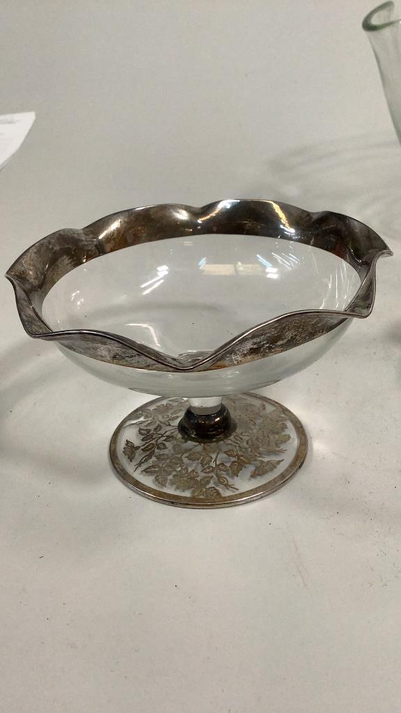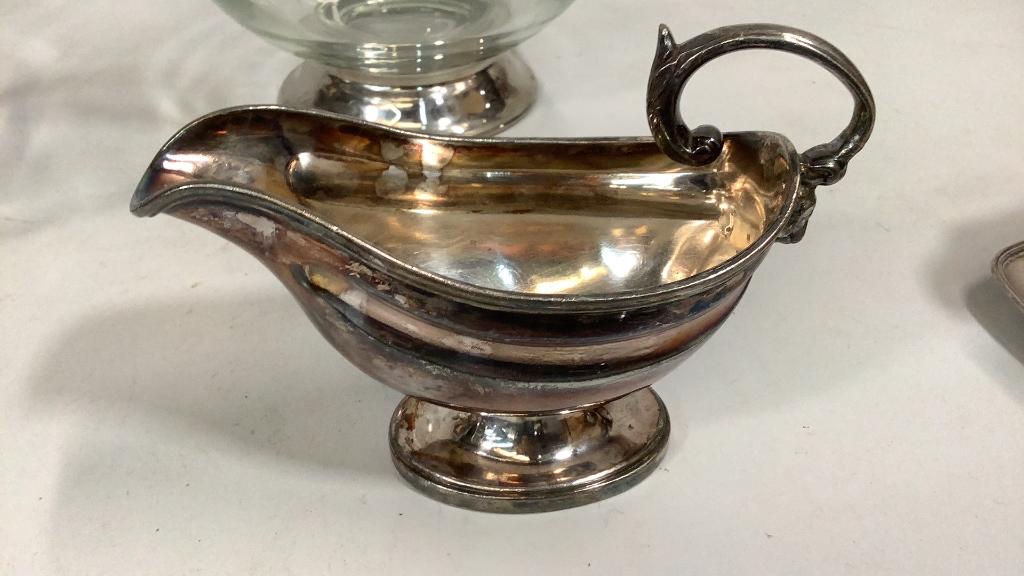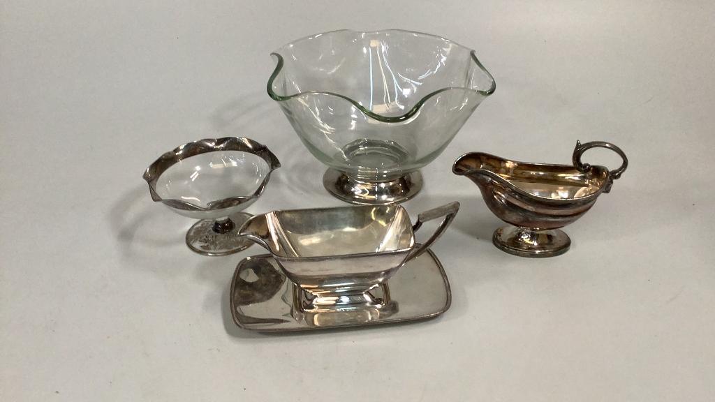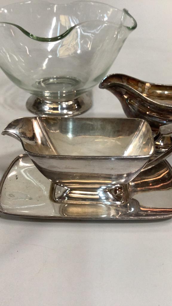 Sheffield Pairpoint Gravy w/ tray, glass serving bowl with plated stand, English plated gravy boat