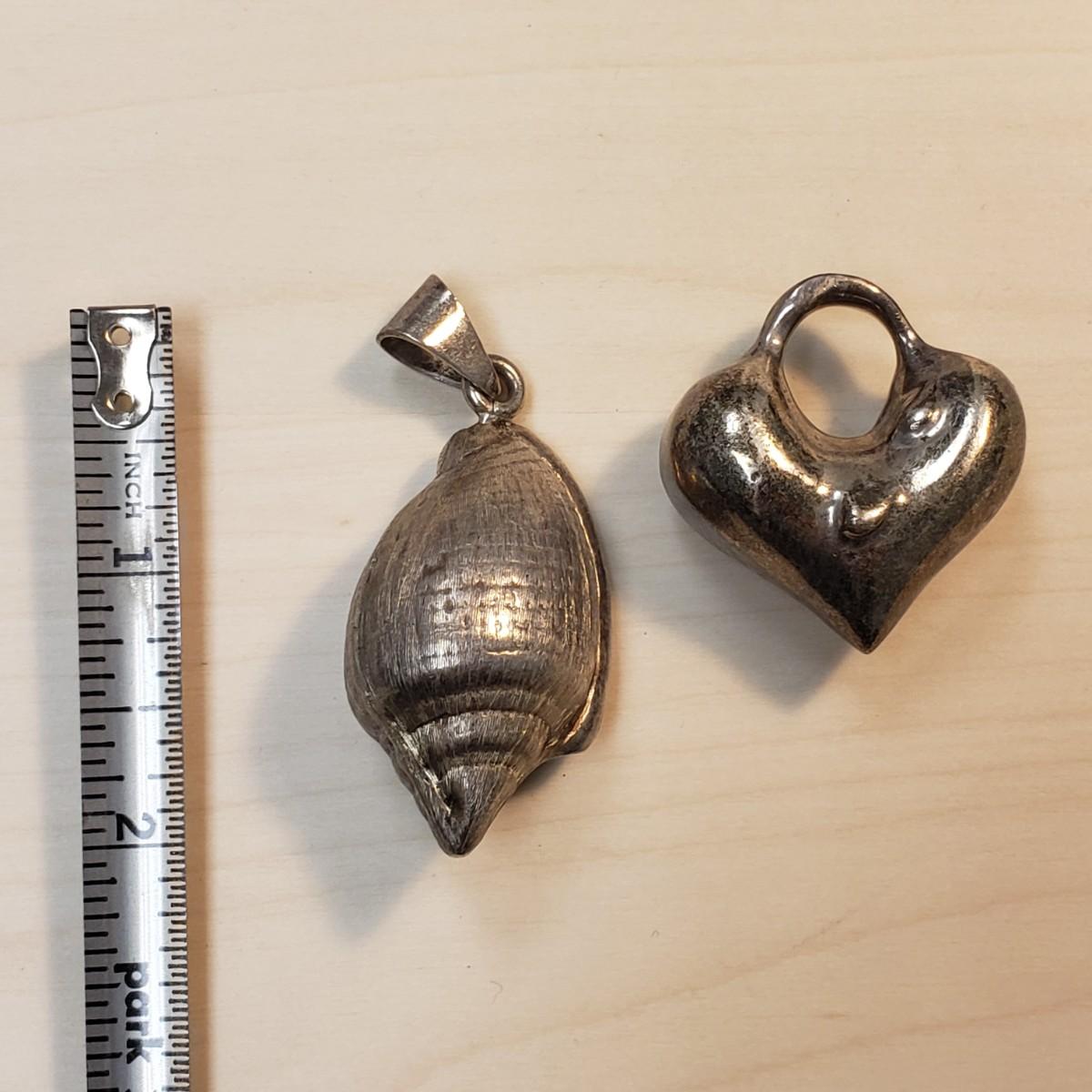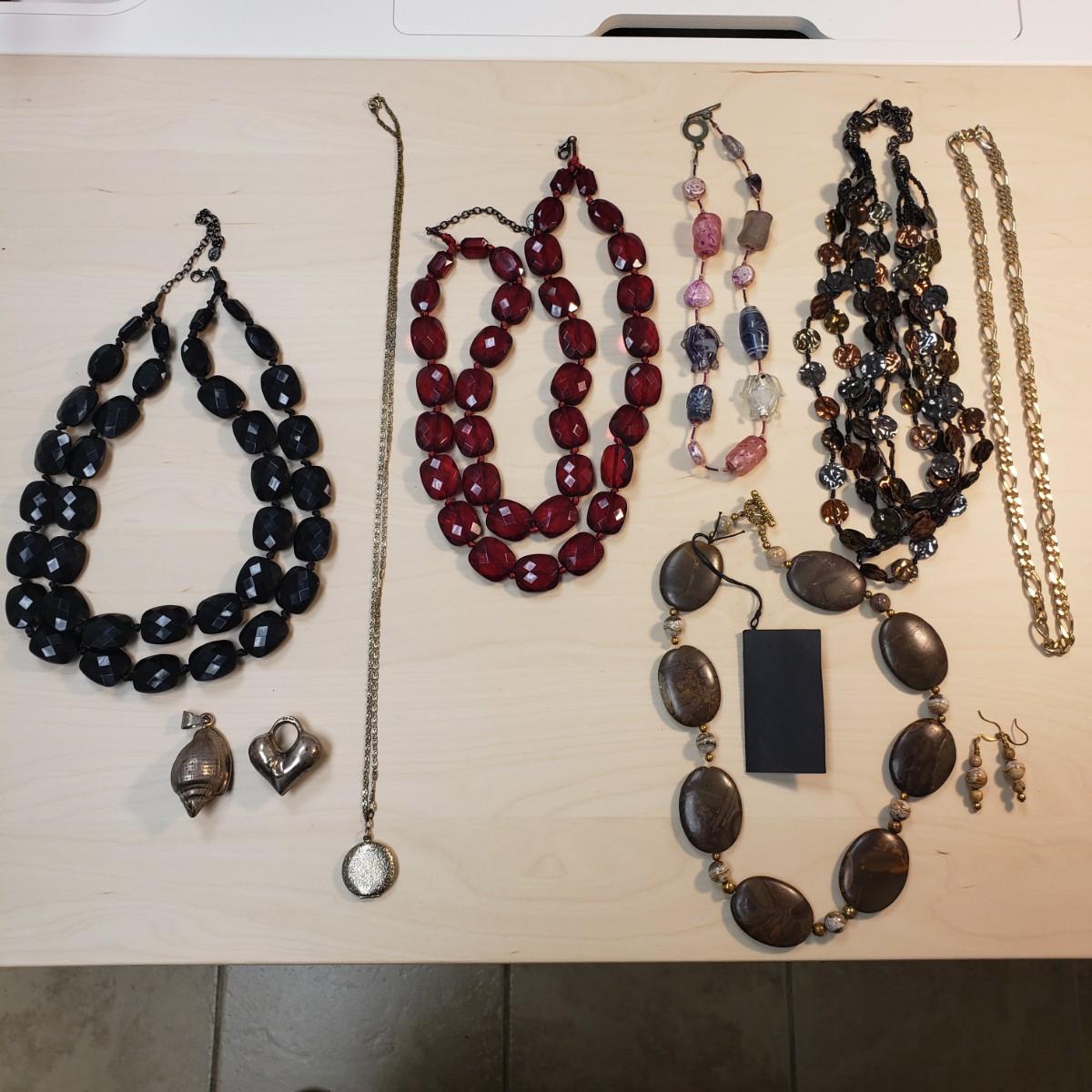 This lot contains two sterling pendants, a heart and a shell. There are two Robert Rose adjustable black and red necklaces. The matching stone necklace and earrings are mother nature at its finest! One stone has a small chip, see pictures. The long necklace and locket are 12K gold filled.