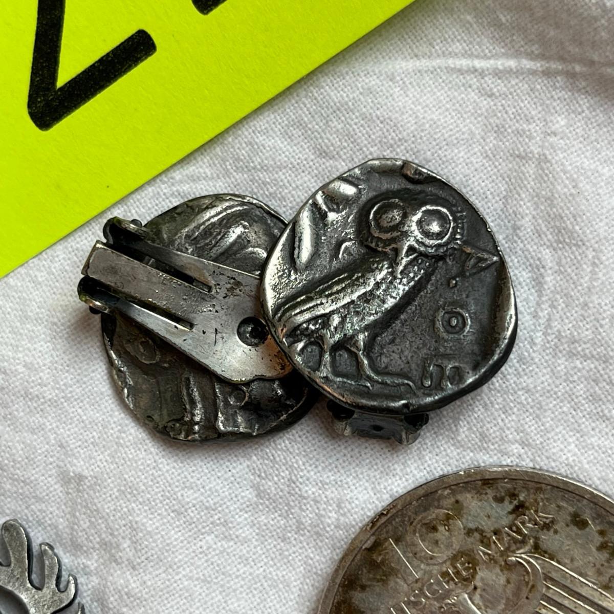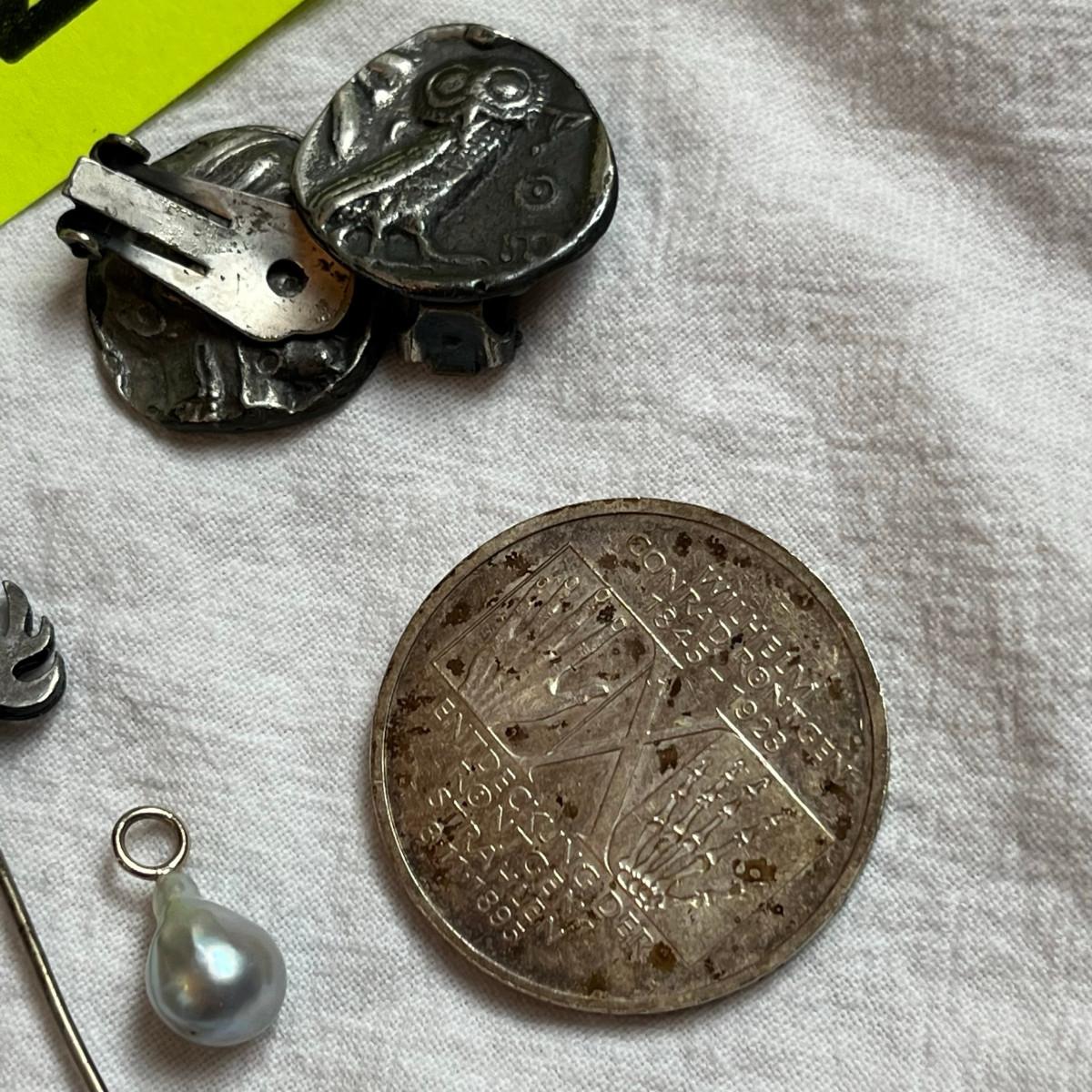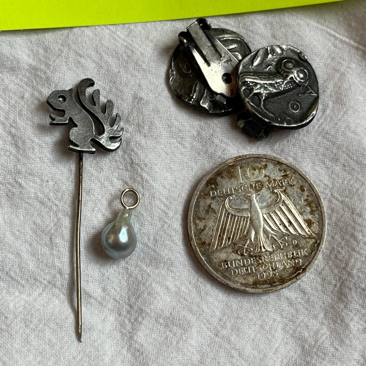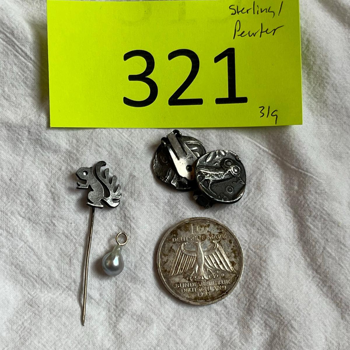 Coin is Germany 1995, not sure if it is sterling. The stick pin squirrel and the earrings I think are pewter. Bid your judgement. 31 grams total weight.