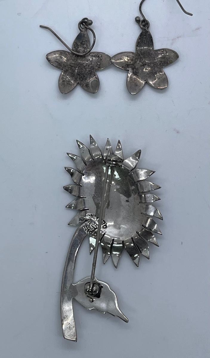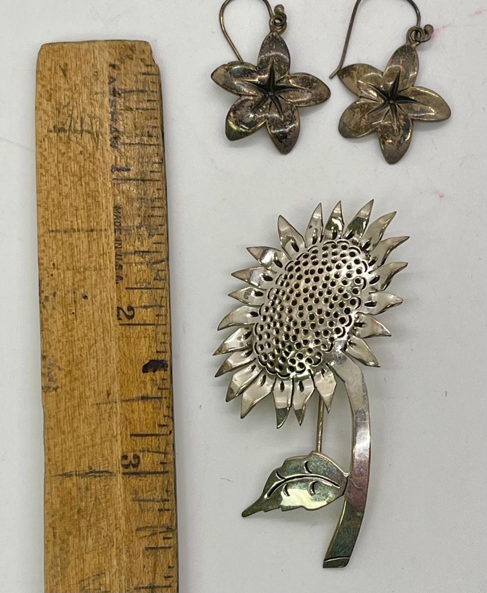 Sterling Silver Sunflower Brooch Pin and Flower Earrings