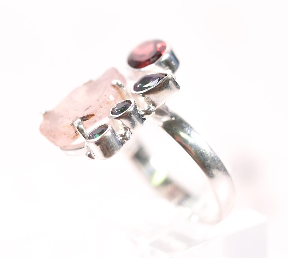 Sterling Pink Quartz, Tourmaline & Garnet Ring. Size 9.5. Stamped 925. Weighs approx. 5.6 grams.