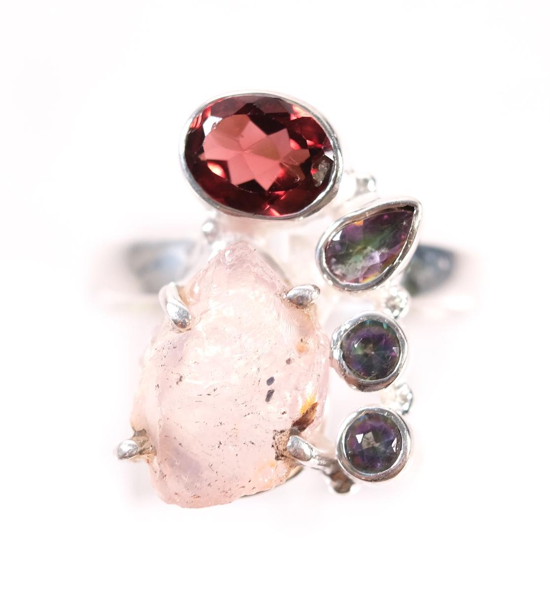 Sterling Pink Quartz, Tourmaline & Garnet Ring, Size 9.5