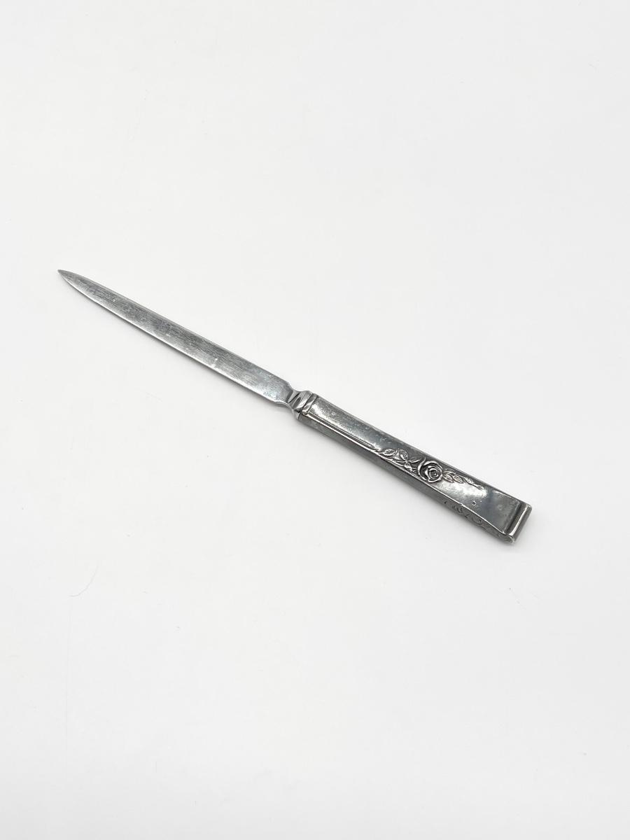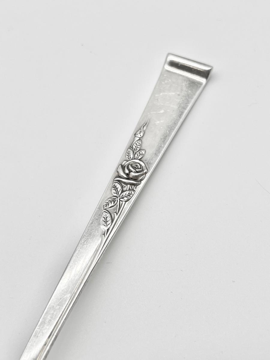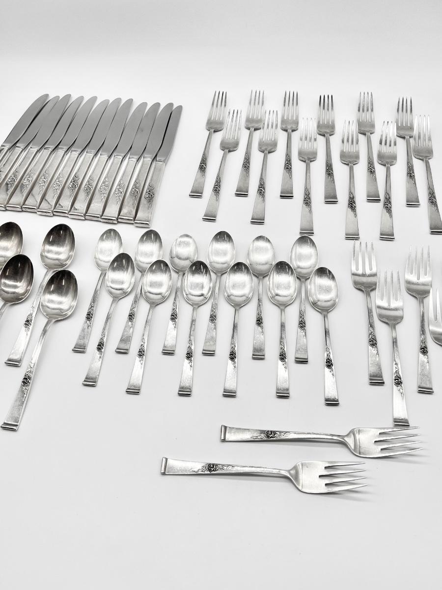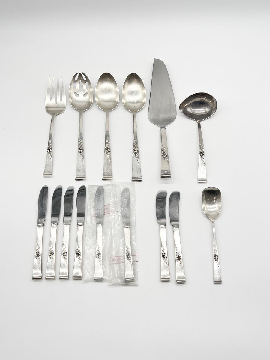 Includes: 12 hollow handle butter knives, 12 dinner forks, 12 salad forks, 12 tea spoons, 8 soup spoons, 1 meat fork, 1 pierced serving spoon, 2 serving spoons, 1 hollow handle pie/cake server, 1 gravy ladle, 6 hollow handle modern butter spreaders, 2 hollow handle paddle butter spreaders, 1 sugar spoon, 1 hollow handle letter opener ~ Approximately 2345g without stainless steel pieces