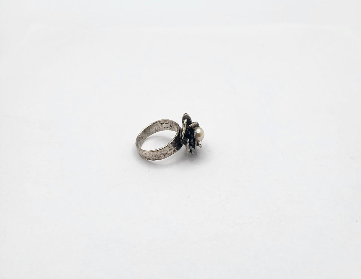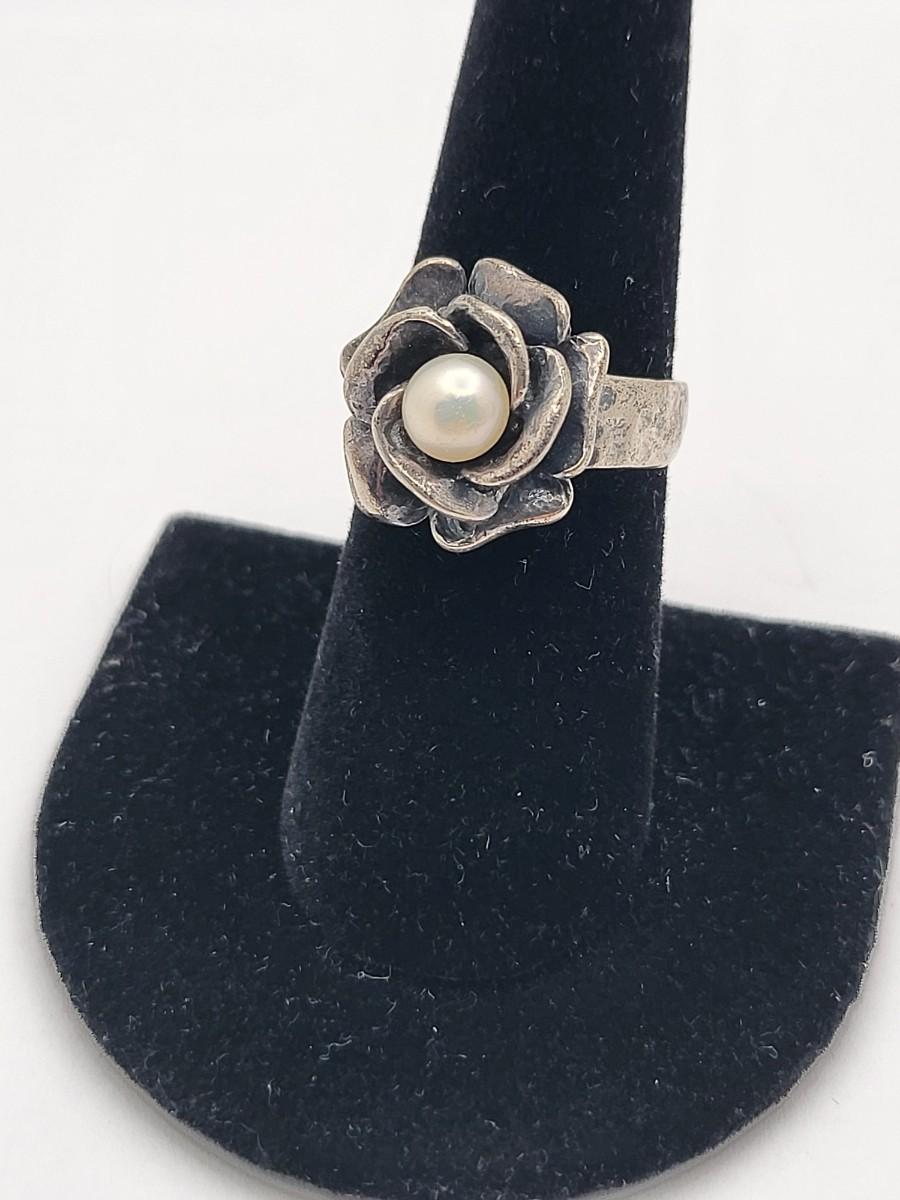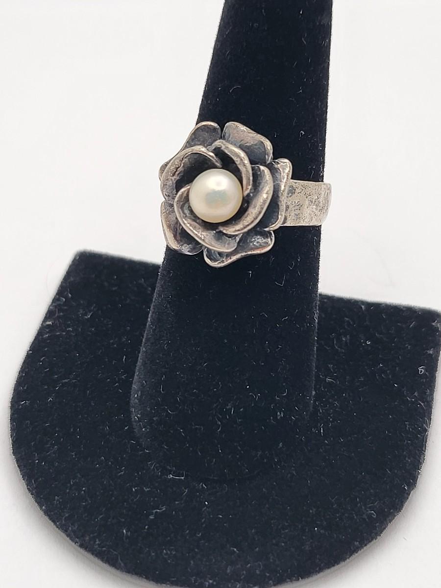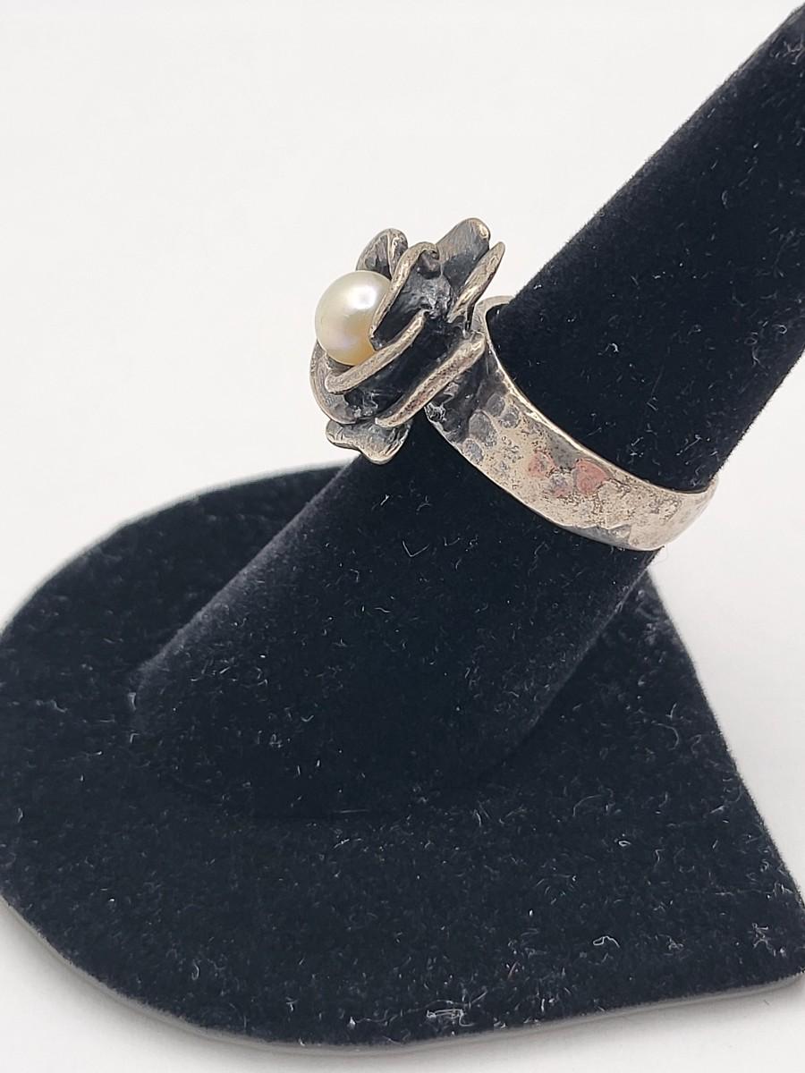 Beautiful, classic vintage look with nice patina. The rose is raised .25". Hammered band. Single genuine pearl at the center of the rose petals Size 6. Total weight 7.1 grams.