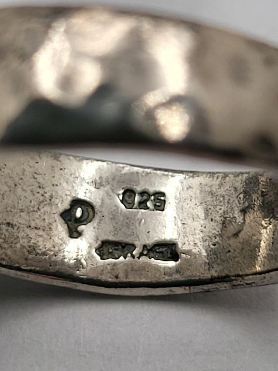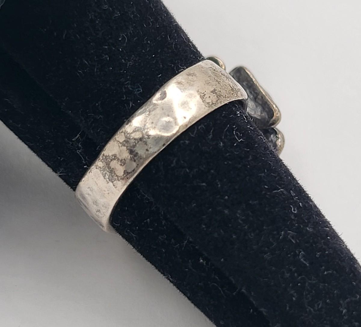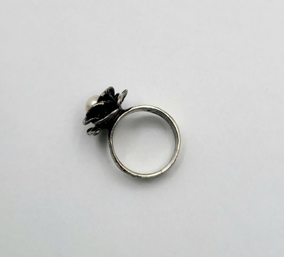 Beautiful, classic vintage look with nice patina. The rose is raised .25". Hammered band. Single genuine pearl at the center of the rose petals Size 6. Total weight 7.1 grams.