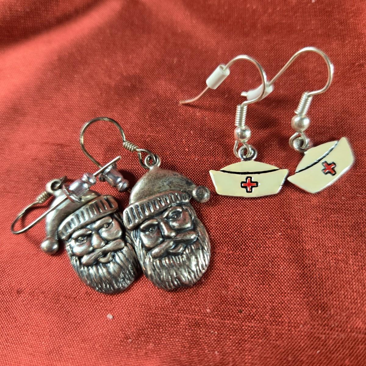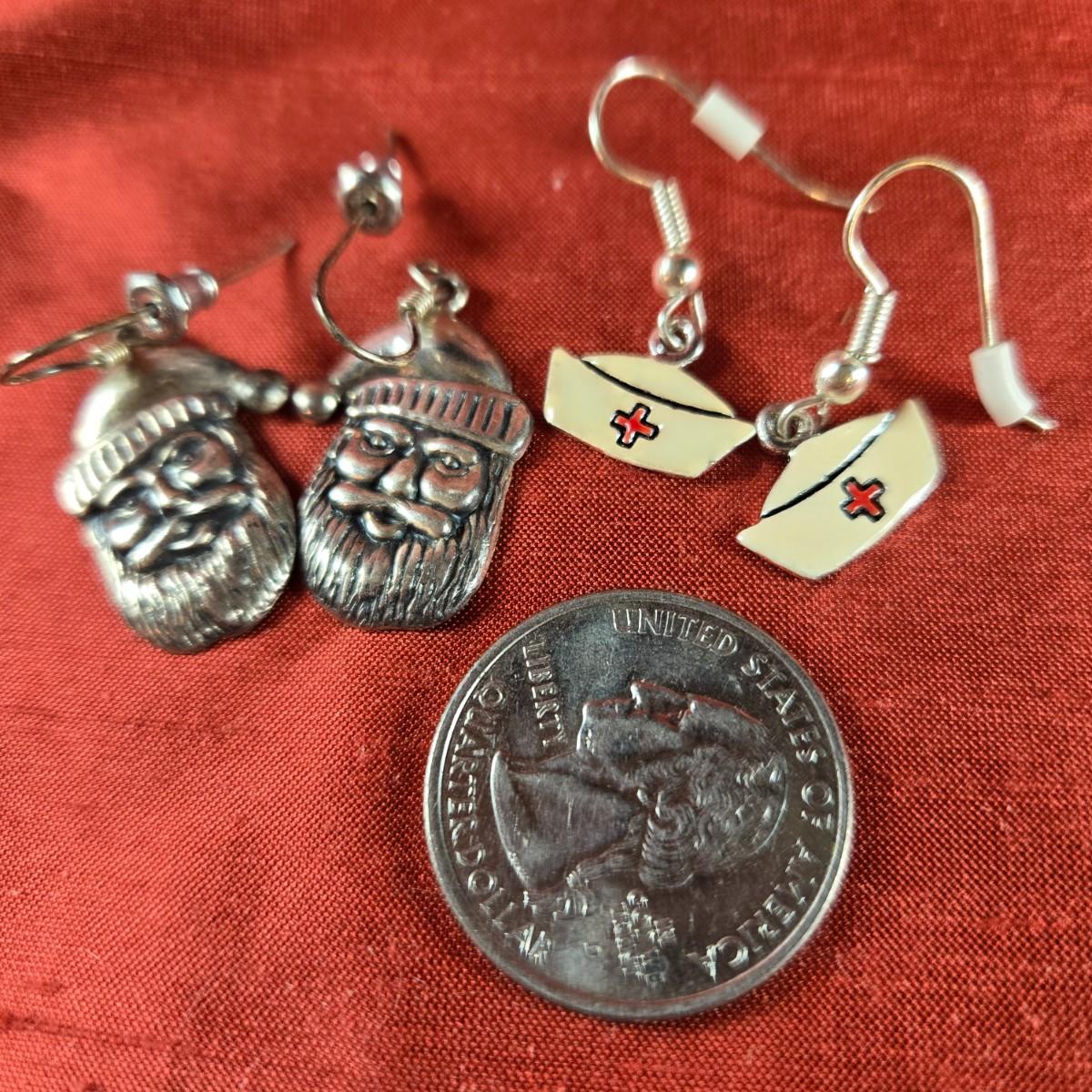 This auction lot is for two sets of Sterling Santa and Enamel Nurse Earrings. These are both a pair of special earrings. The Santa's are sterling silver and the nurse earrings are enamel. Both are in very good shape.
