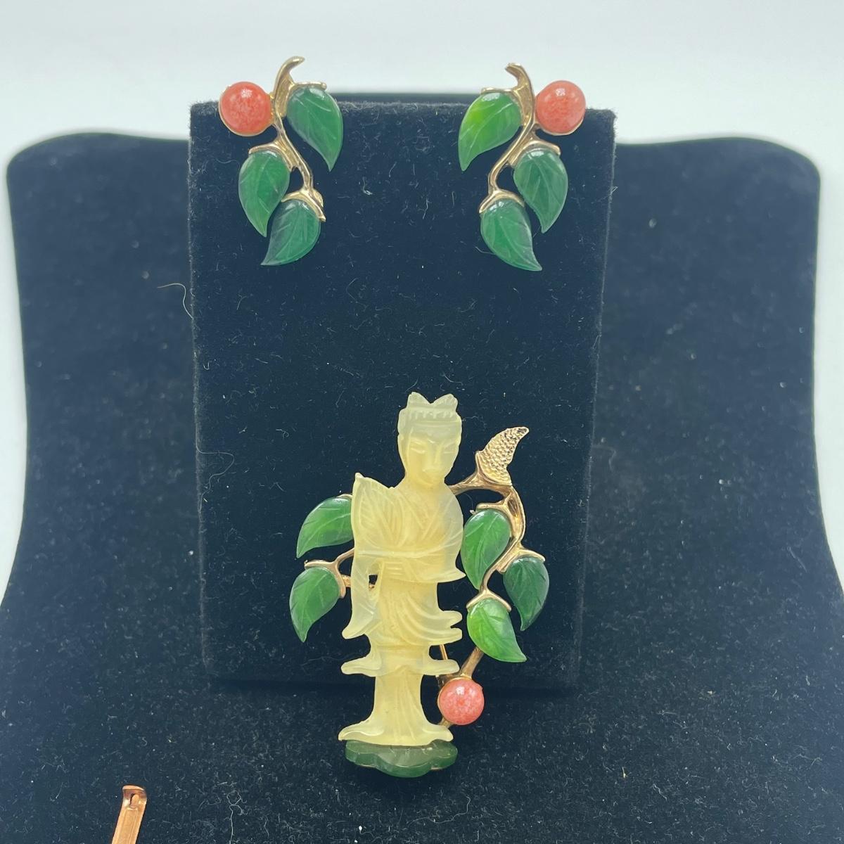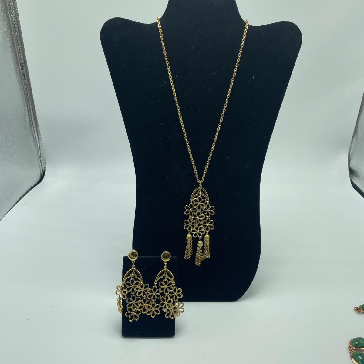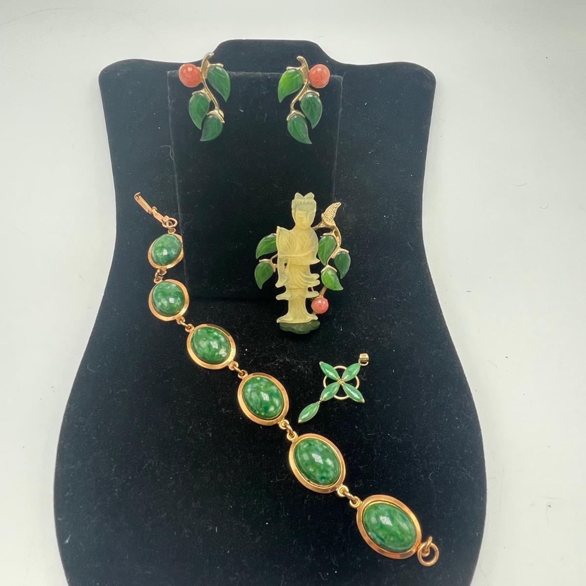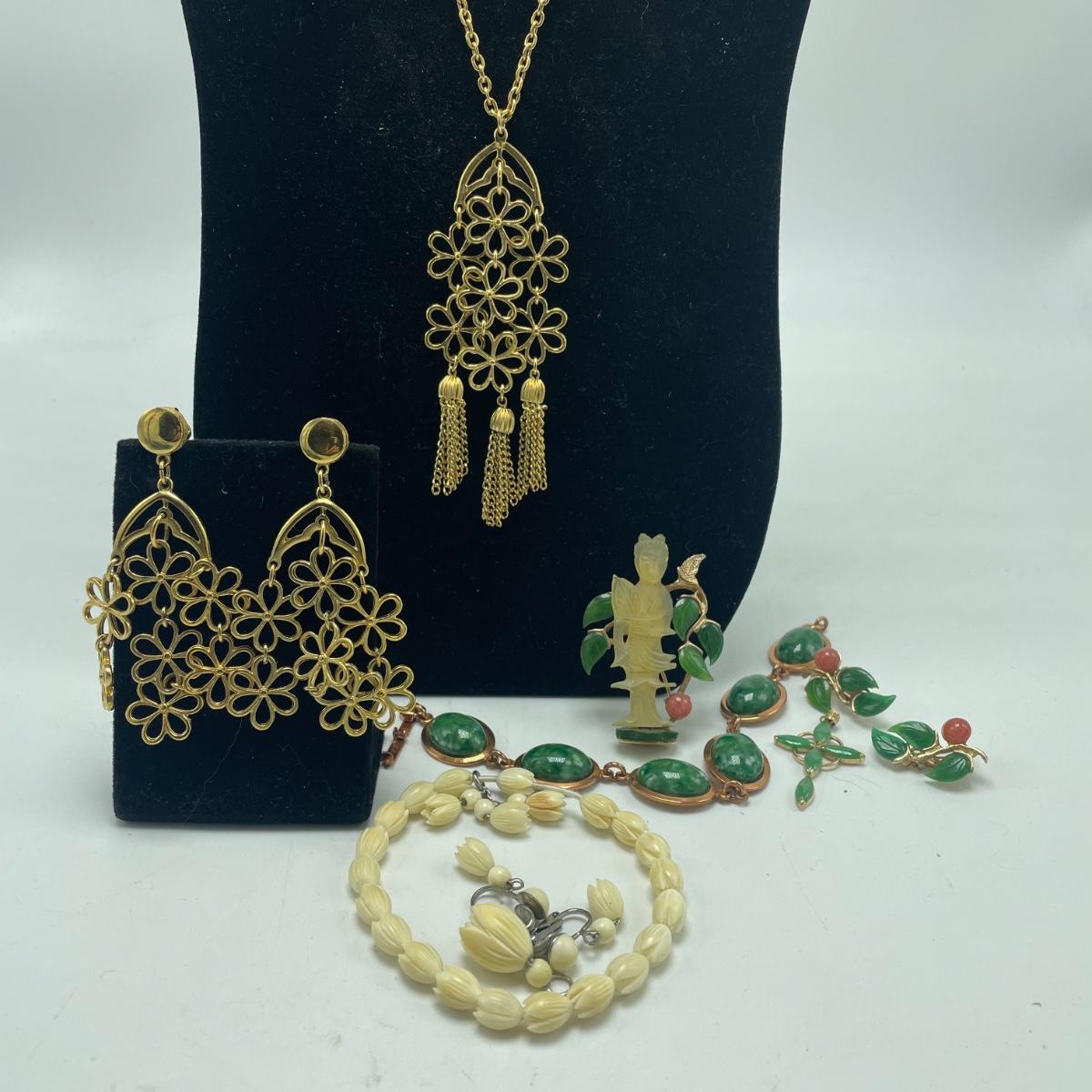 Three gorgeous jewelry sets for you here. The ivory-like set has clip on earrings that are marked sterling as does the piece that has three flowers; the bracelet is on an elastic band and no mark was found on the pendant. The jade colored set includes a brooch and clip on earrings and there is also a copper/jade colored stone bracelet and a cross pendant that are very similar to each other, but not part of the set. Lastly there is a gold colored necklace with floral design that comes with matching clip on earrings. Necklace chain measures 18” long.