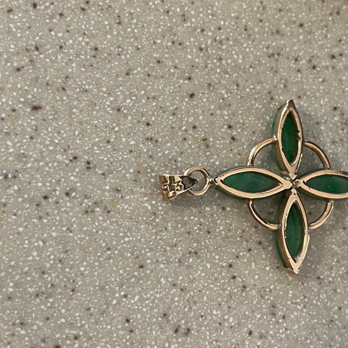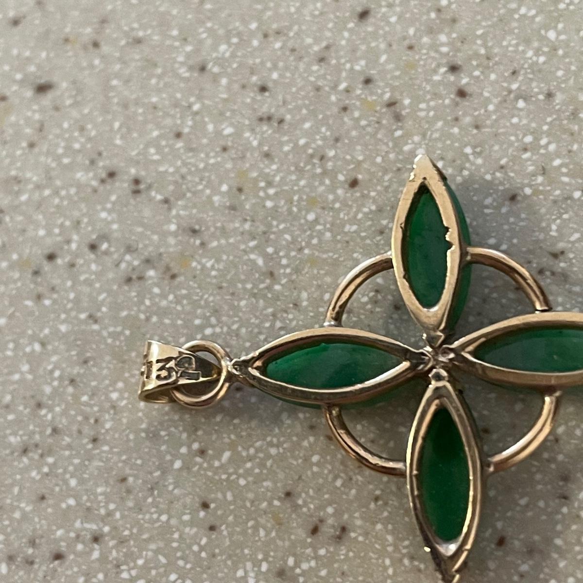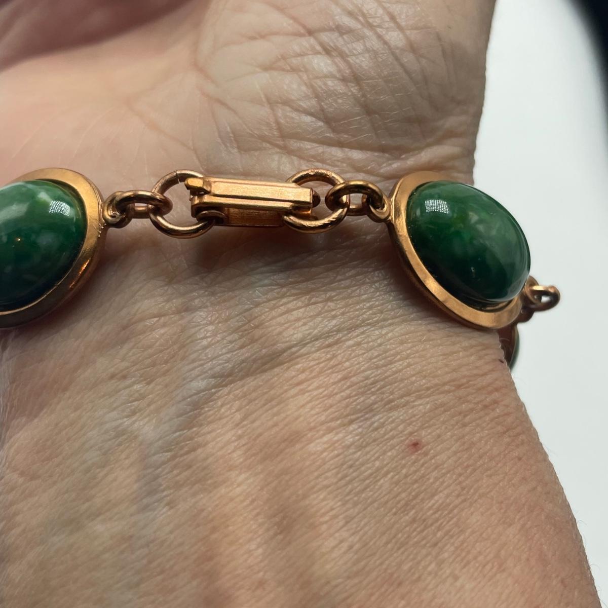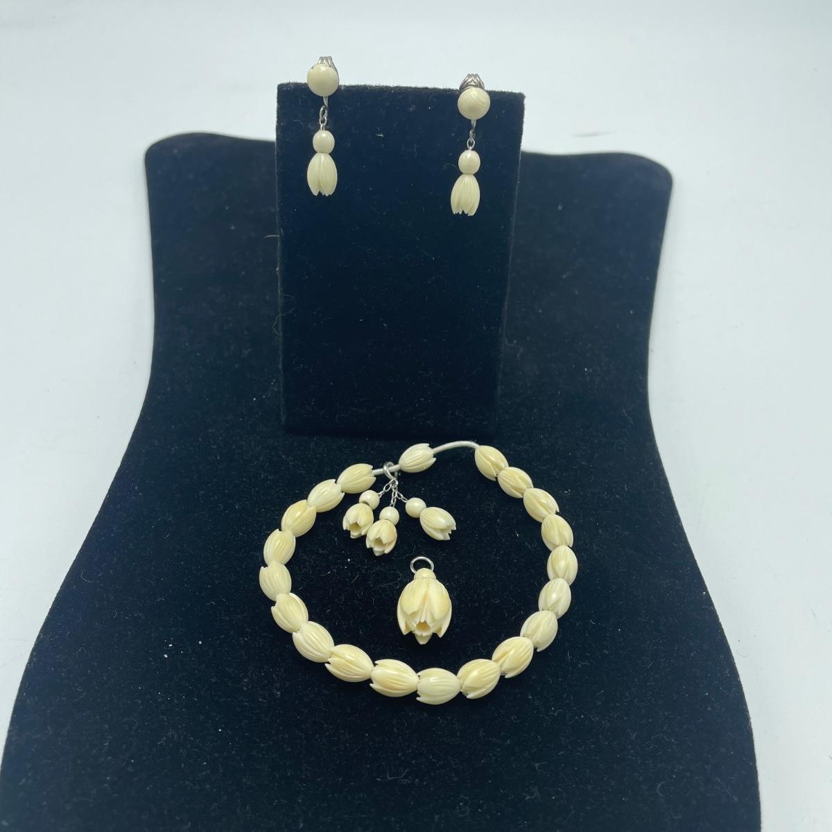 Three gorgeous jewelry sets for you here. The ivory-like set has clip on earrings that are marked sterling as does the piece that has three flowers; the bracelet is on an elastic band and no mark was found on the pendant. The jade colored set includes a brooch and clip on earrings and there is also a copper/jade colored stone bracelet and a cross pendant that are very similar to each other, but not part of the set. Lastly there is a gold colored necklace with floral design that comes with matching clip on earrings. Necklace chain measures 18” long.