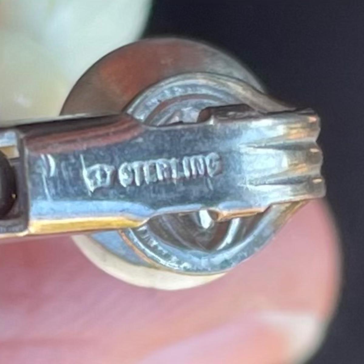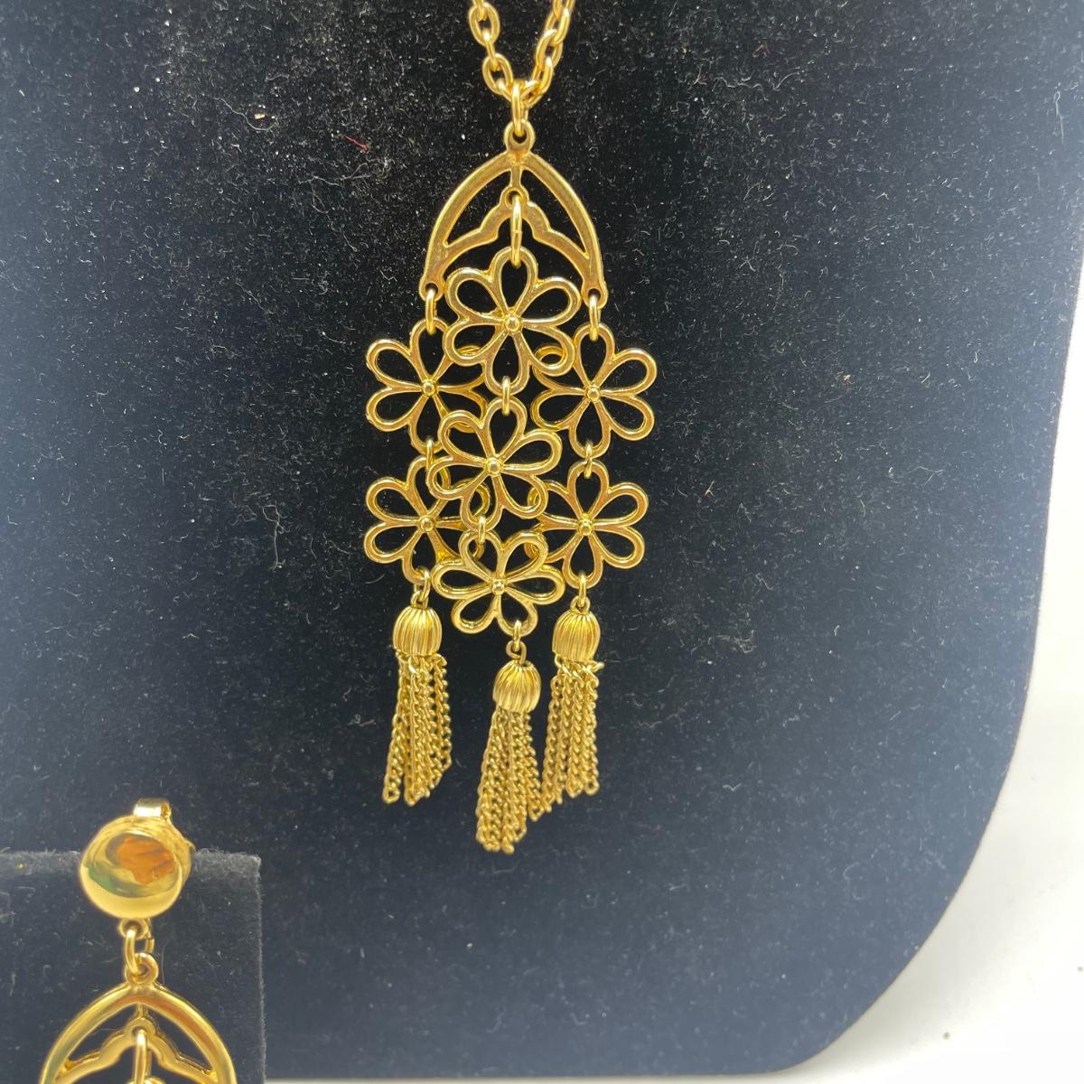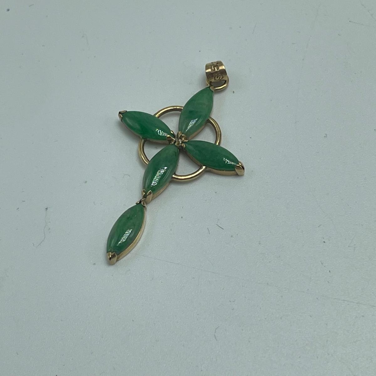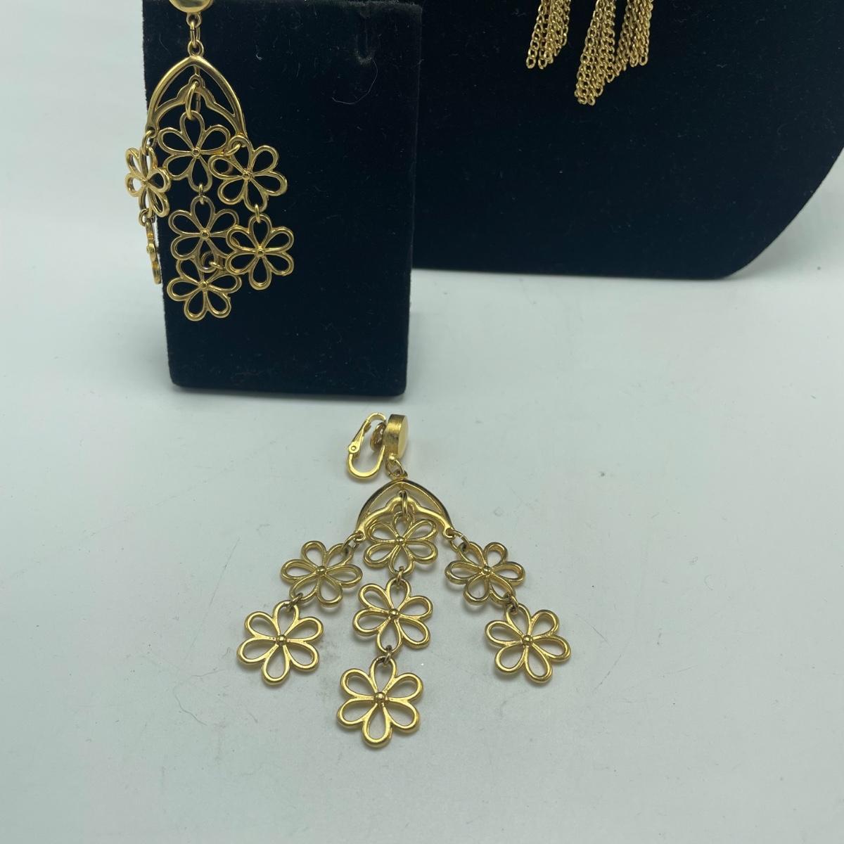 Three gorgeous jewelry sets for you here. The ivory-like set has clip on earrings that are marked sterling as does the piece that has three flowers; the bracelet is on an elastic band and no mark was found on the pendant. The jade colored set includes a brooch and clip on earrings and there is also a copper/jade colored stone bracelet and a cross pendant that are very similar to each other, but not part of the set. Lastly there is a gold colored necklace with floral design that comes with matching clip on earrings. Necklace chain measures 18” long.